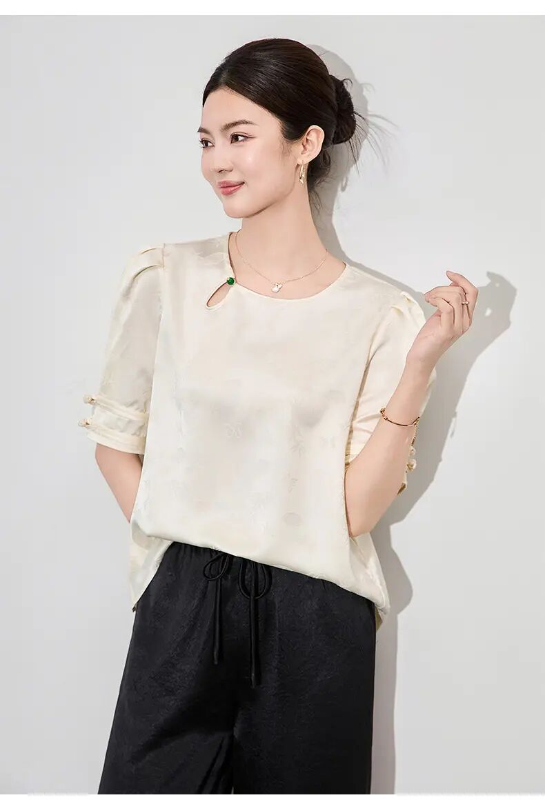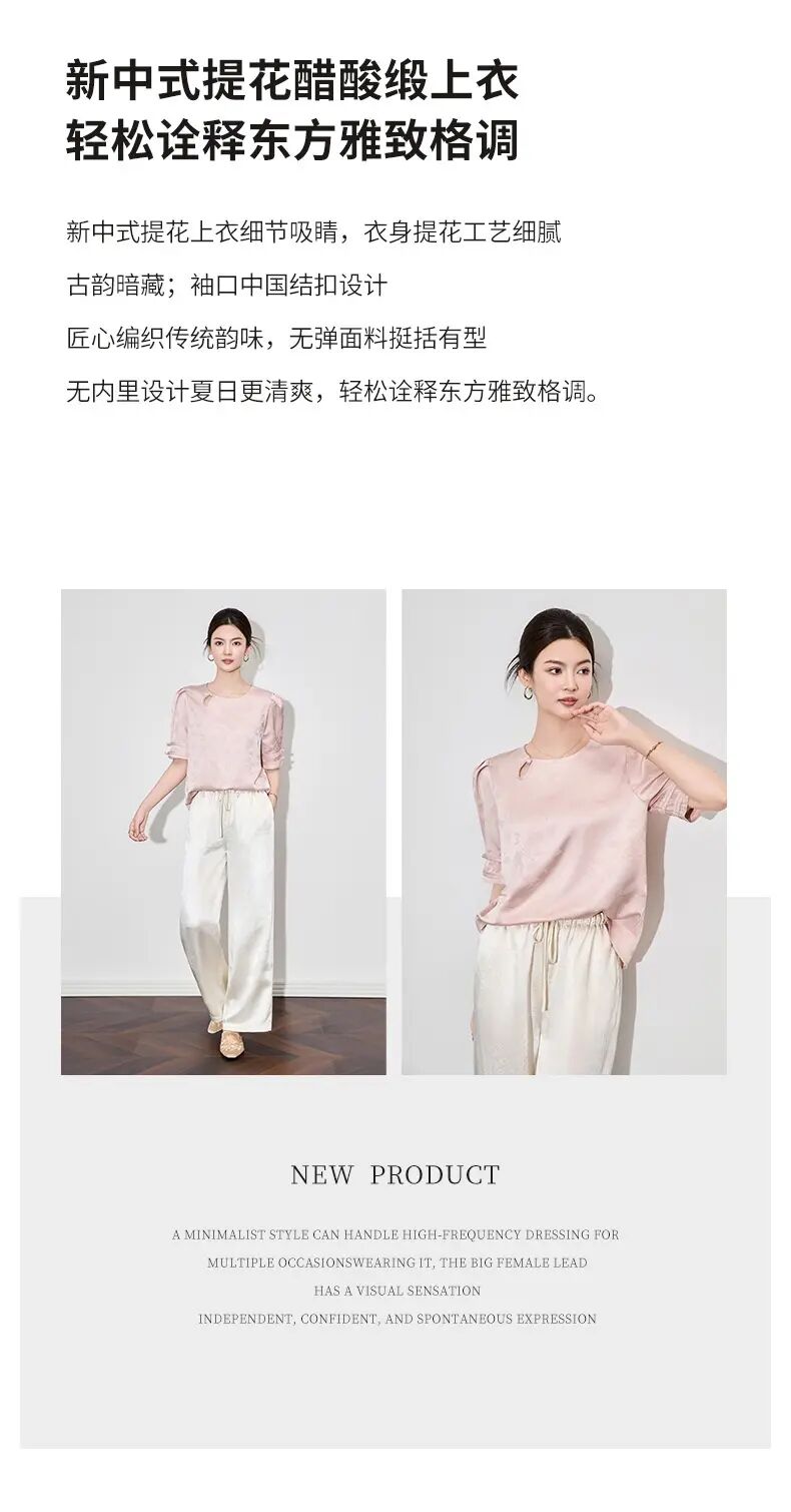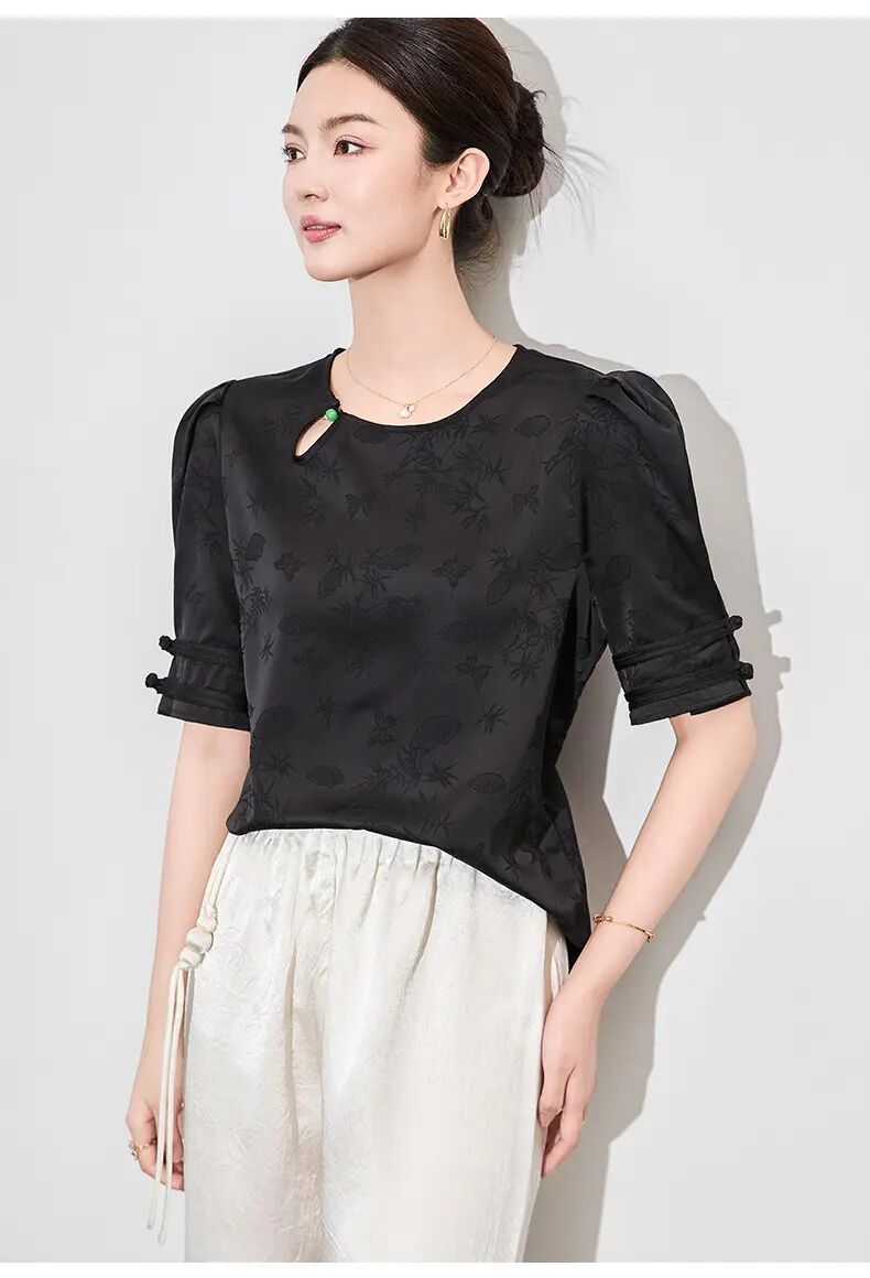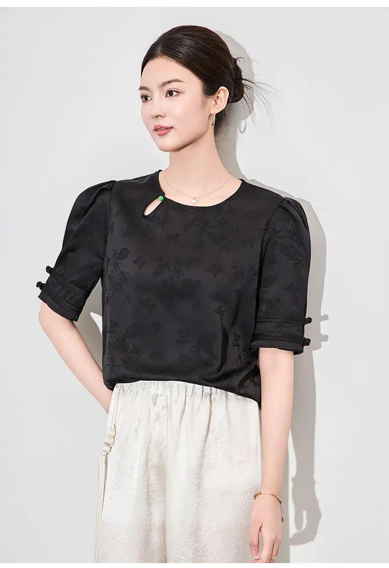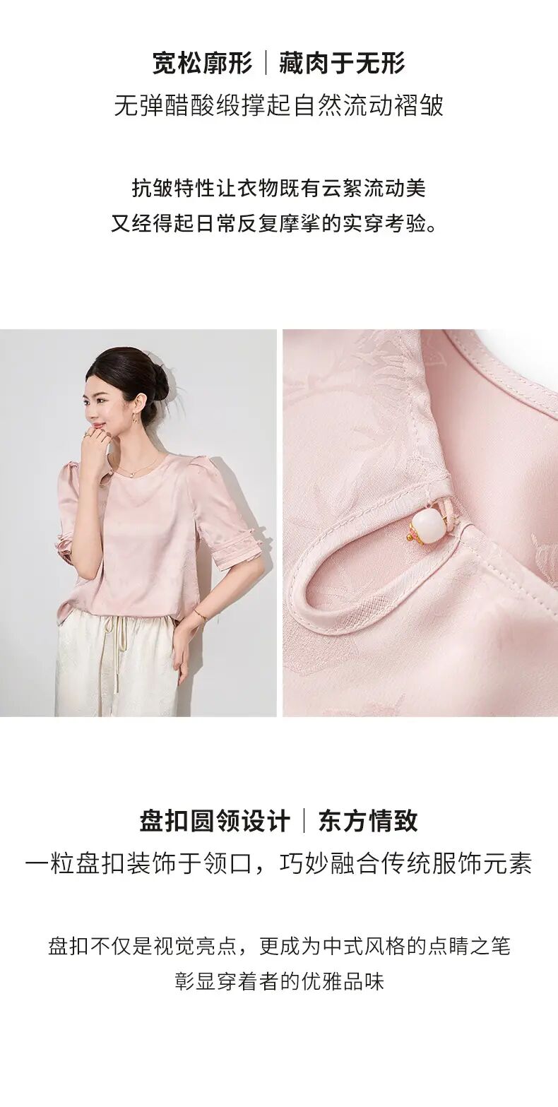 【高货wl】全新升级【铂金会员257/天猫339/差价82】(55657) 洛诗琳新中式国风精仿提花醋酸缎上衣女夏盘扣短袖T恤