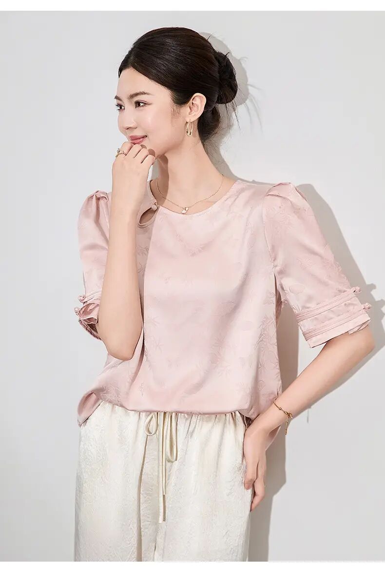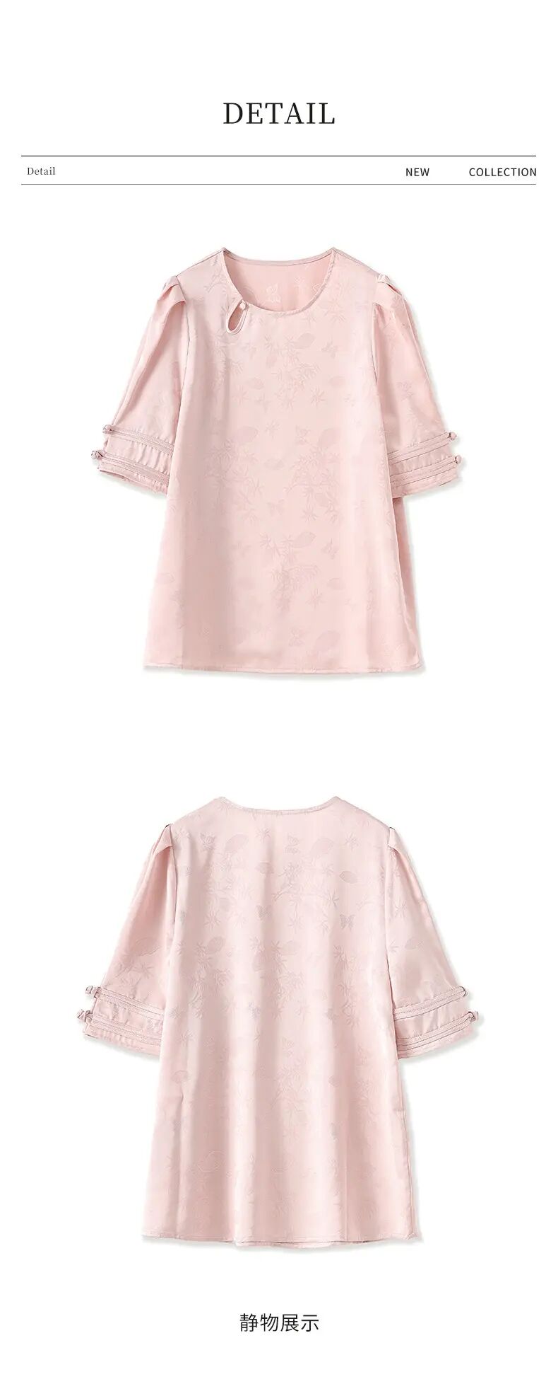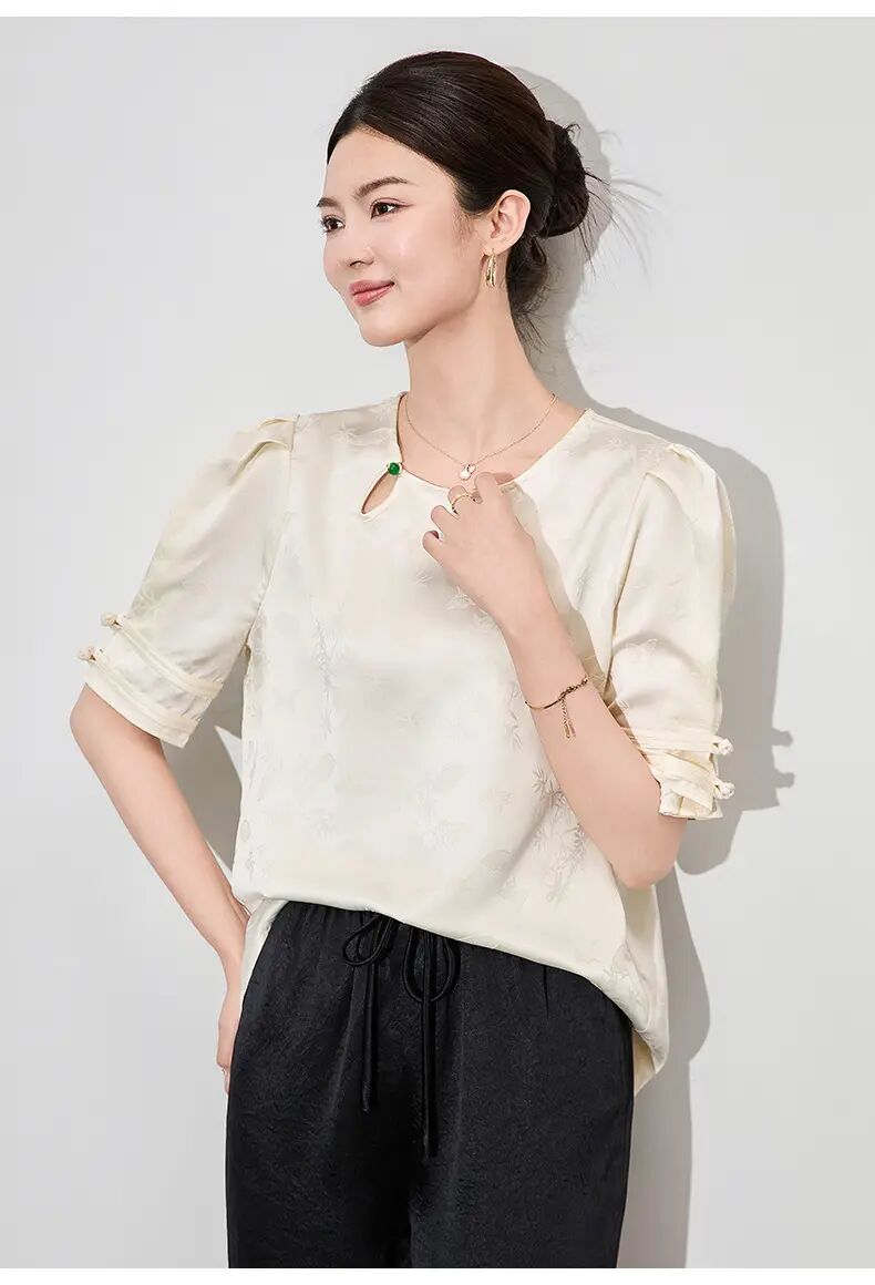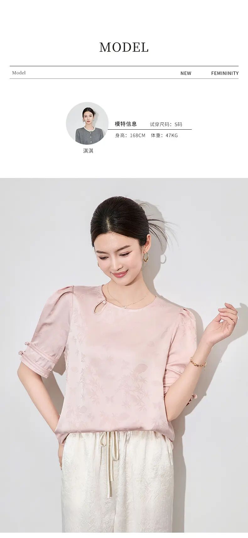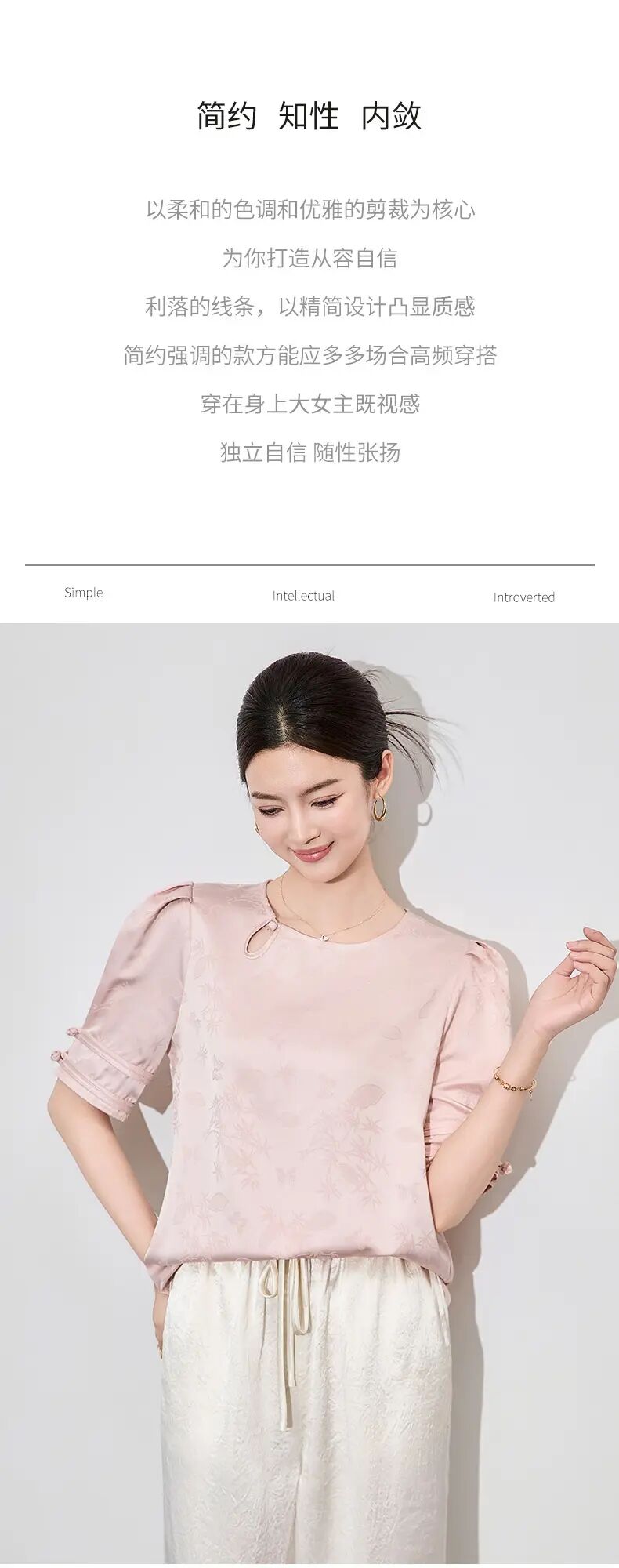 【高货wl】全新升级【铂金会员257/天猫339/差价82】(55657) 洛诗琳新中式国风精仿提花醋酸缎上衣女夏盘扣短袖T恤