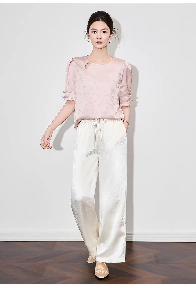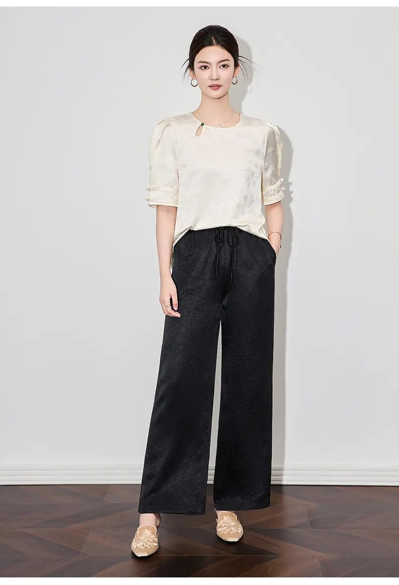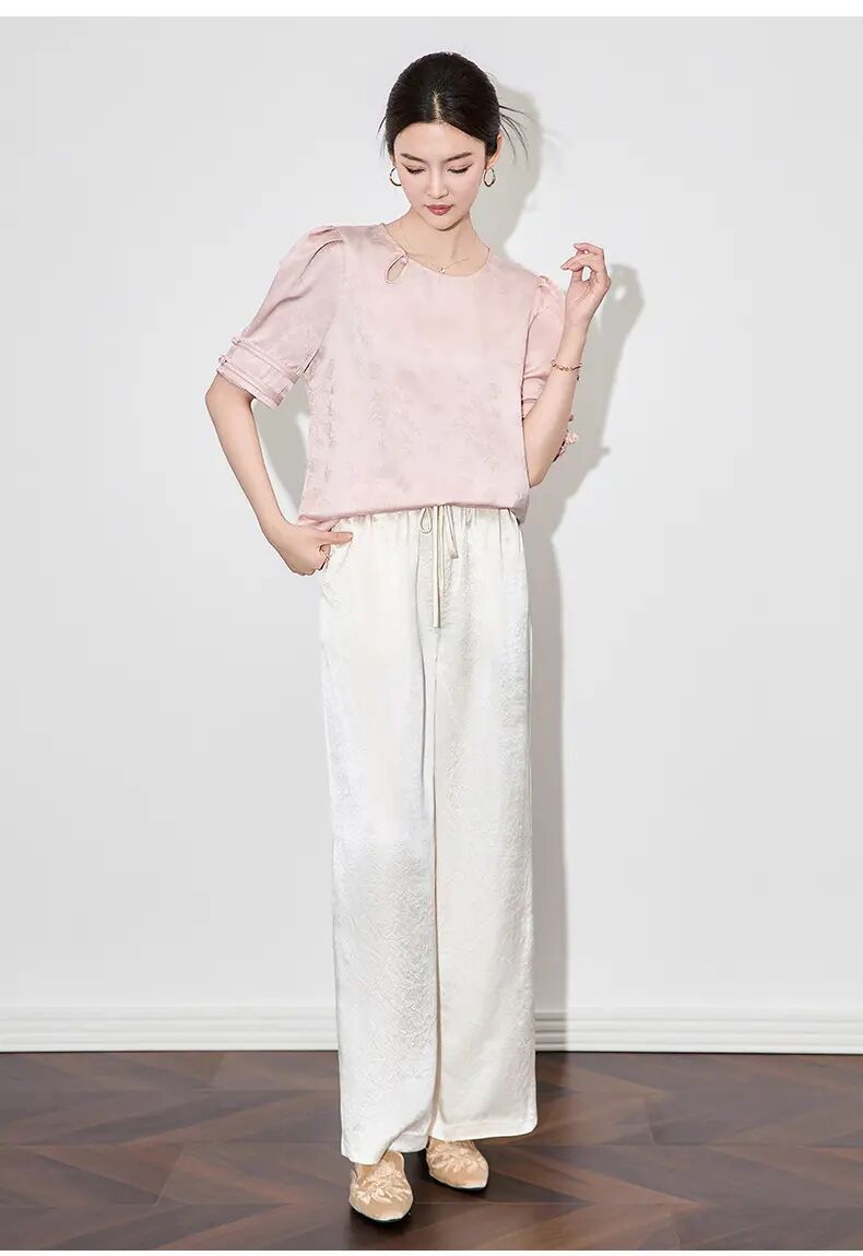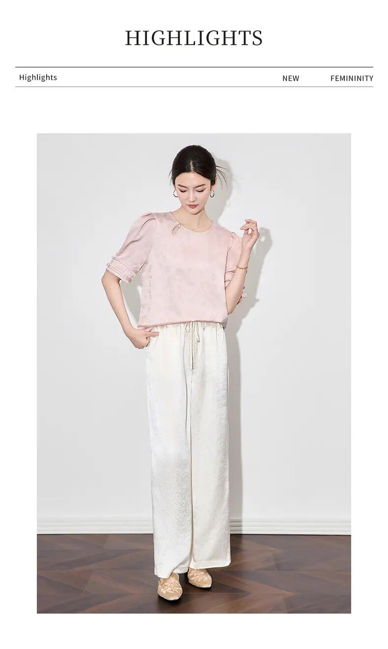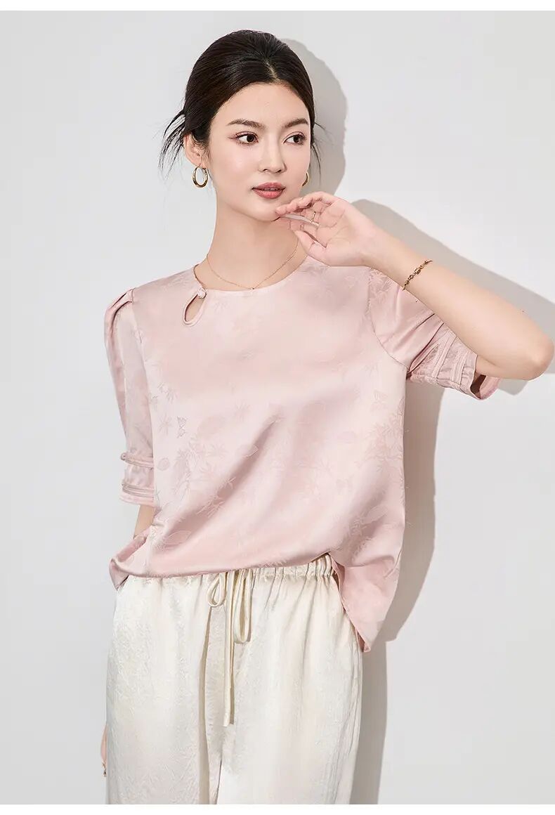 【高货wl】全新升级【铂金会员257/天猫339/差价82】(55657) 洛诗琳新中式国风精仿提花醋酸缎上衣女夏盘扣短袖T恤
