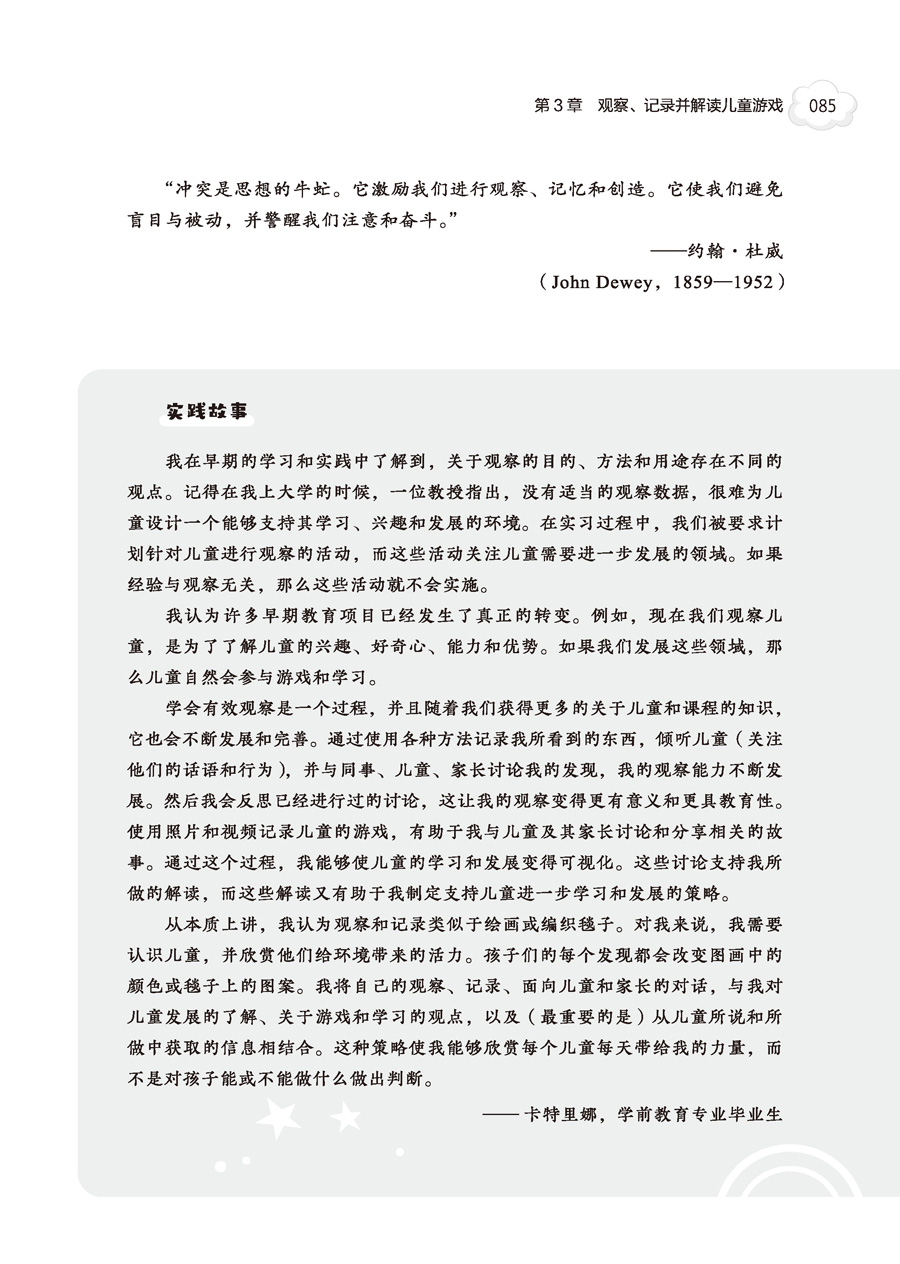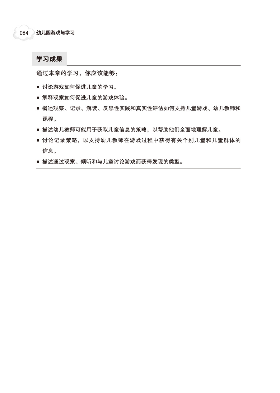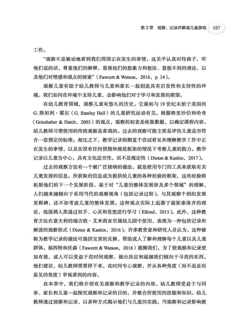 重视游戏对于幼儿学习与发展的价值,强调以游戏为基本活动,是现代幼儿教育实践的基本立场。正是基于游戏与学习的密切关联,本书从多个视角深入探讨了幼儿教师如何科学而有质量地支持和促进幼儿的游戏及其相关的学习。对于幼儿园游戏实践中的热点与难点问题,诸如幼儿游戏行为的观察与记录、户外游戏和自然游戏的组织与开展、游戏空间的创设与优化、开放性材料的价值与利用等,本书都提供了有针对性的思考与可行性建议。本书对幼儿的语言和读写、数学和科学以及音乐律动等学习领域的探讨,同样令人颇受启发。在教师支持幼儿游戏的策略中,对如何运用现代技术工具和信息软件的关注与建议,本书也显示出回应信息化时代的积极意识。