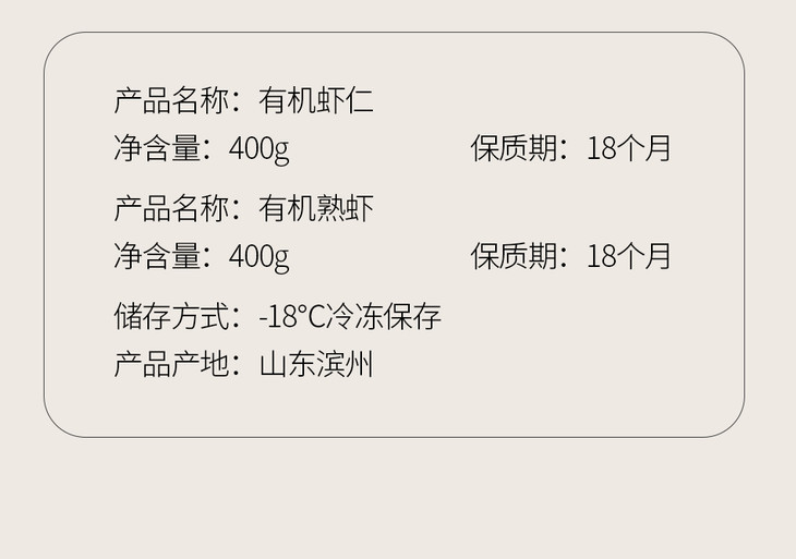 品名: 有机盐田生虾仁熟虾仁规格1:盐田熟虾400g/盒规格2:盐田生虾仁400g/盒 规格3:盐田熟虾400g/盒*3盒 规格4:盐田熟虾*2盒+盐田虾仁*1盒(400g/盒) 规格5:盐田熟虾*1盒+盐田虾仁*2盒(400g/盒) 规格6:盐田生虾仁400g/盒*3盒 包装:彩袋+彩盒+泡沫箱+冰袋 发货快递:顺丰/京东 发货地/产地:山东济南仓 售卖期:全年 保质期:冷冻18个月 发货时效:48小时 运费模板:新疆、西藏、甘肃、青海、宁夏、云南、海南、港澳台不发货;其他区域包邮周六周天、节假日除外,早上十点之前的订单是48小时发货 ,到货时间约为2-5天,请您耐心等待 |