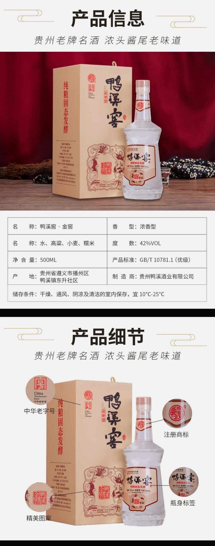 【推荐】贵州鸭溪窖酒 金窖 浓香型白酒 42度500ml*6瓶 装箱装