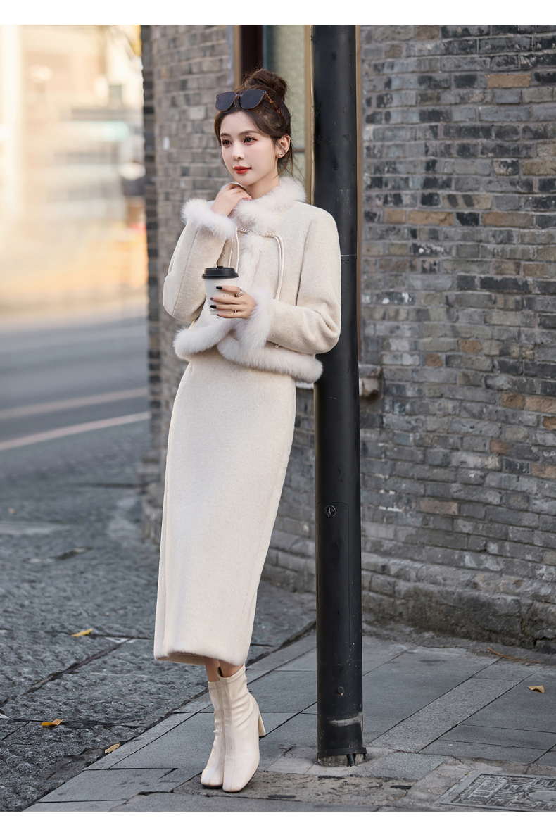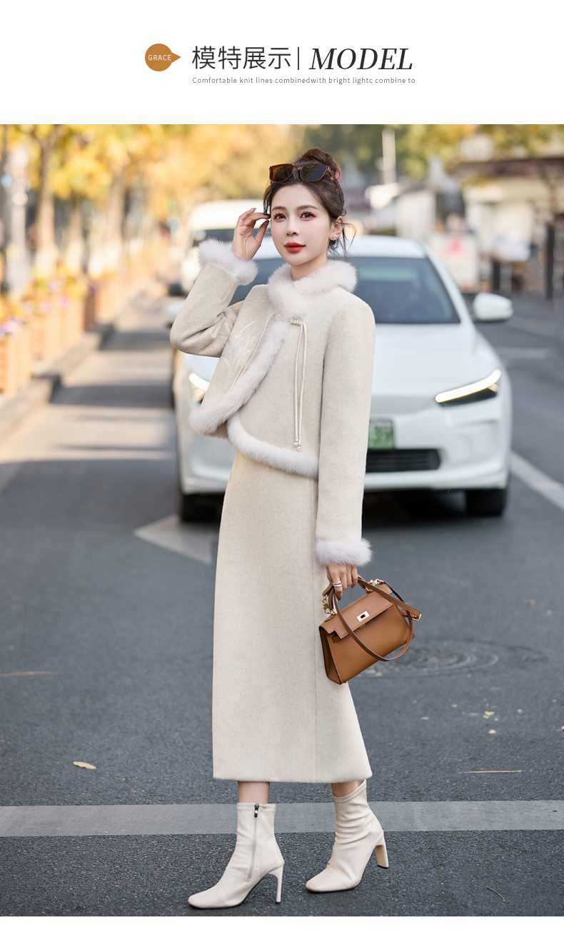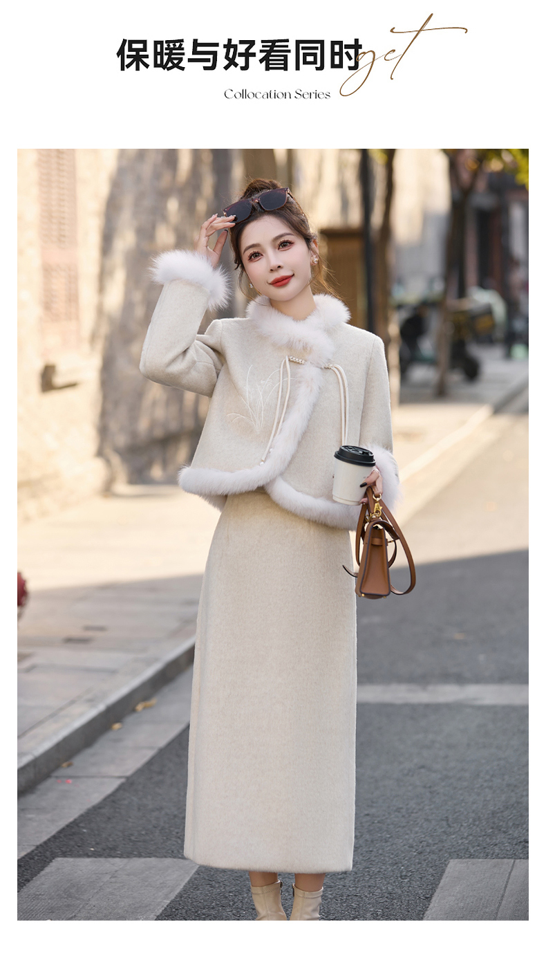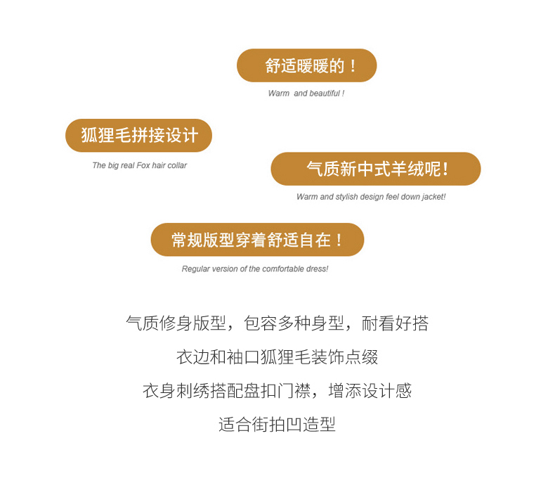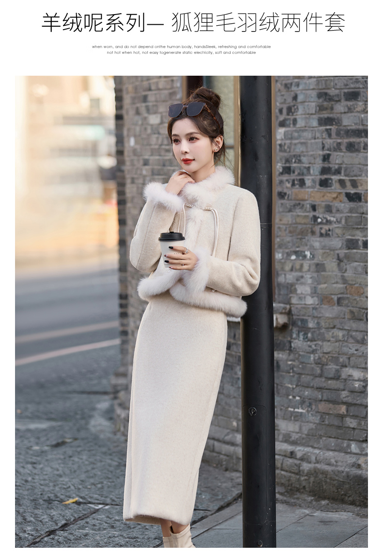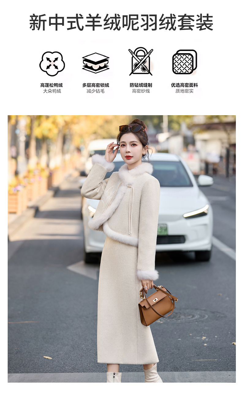 冬季新款,配真毛领配袖毛羽绒服套装白鸭狐狸毛领新中式羊绒泥料套装HRYZ9586