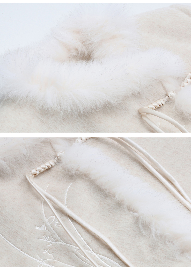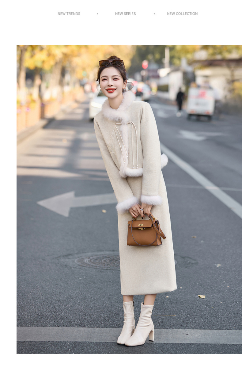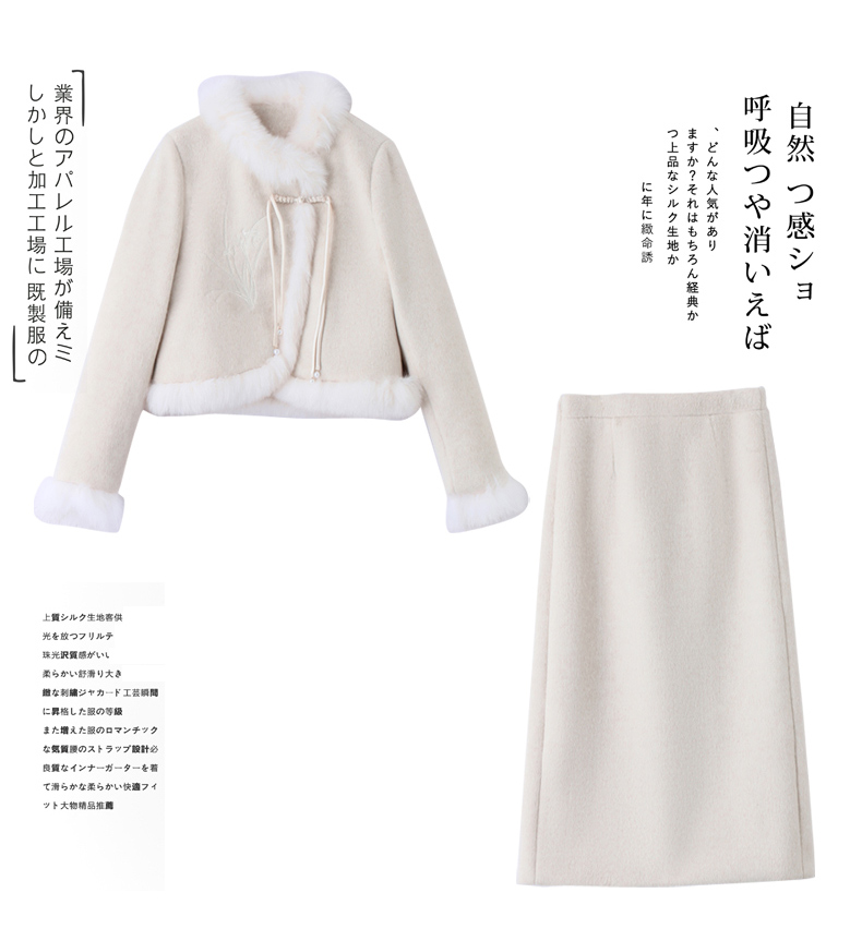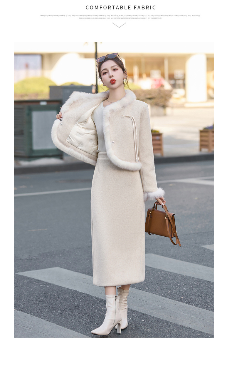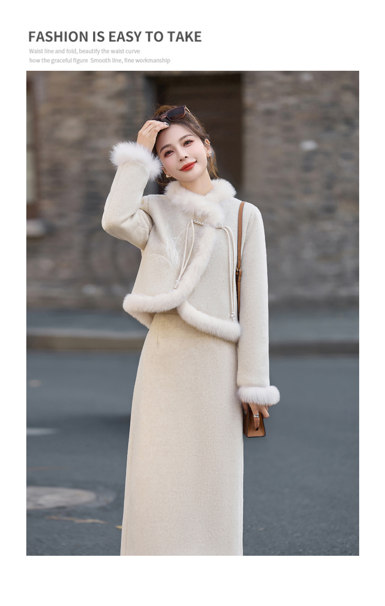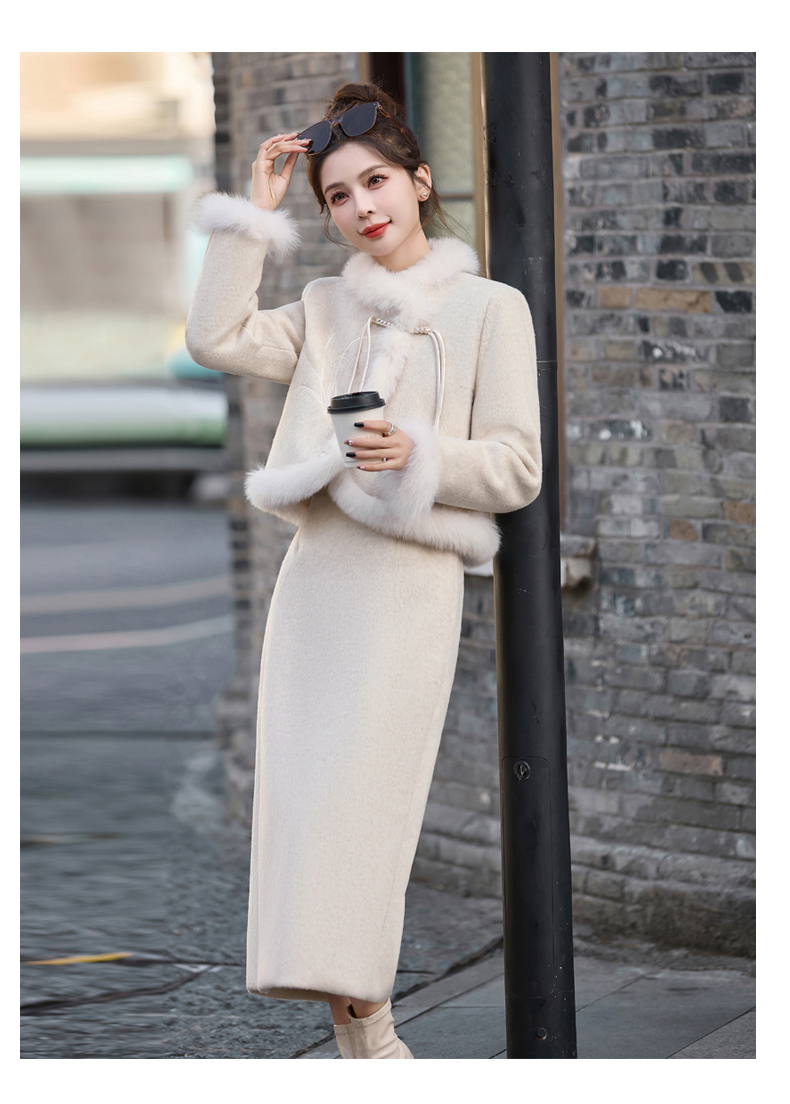 冬季新款,配真毛领配袖毛羽绒服套装白鸭狐狸毛领新中式羊绒泥料套装HRYZ9586