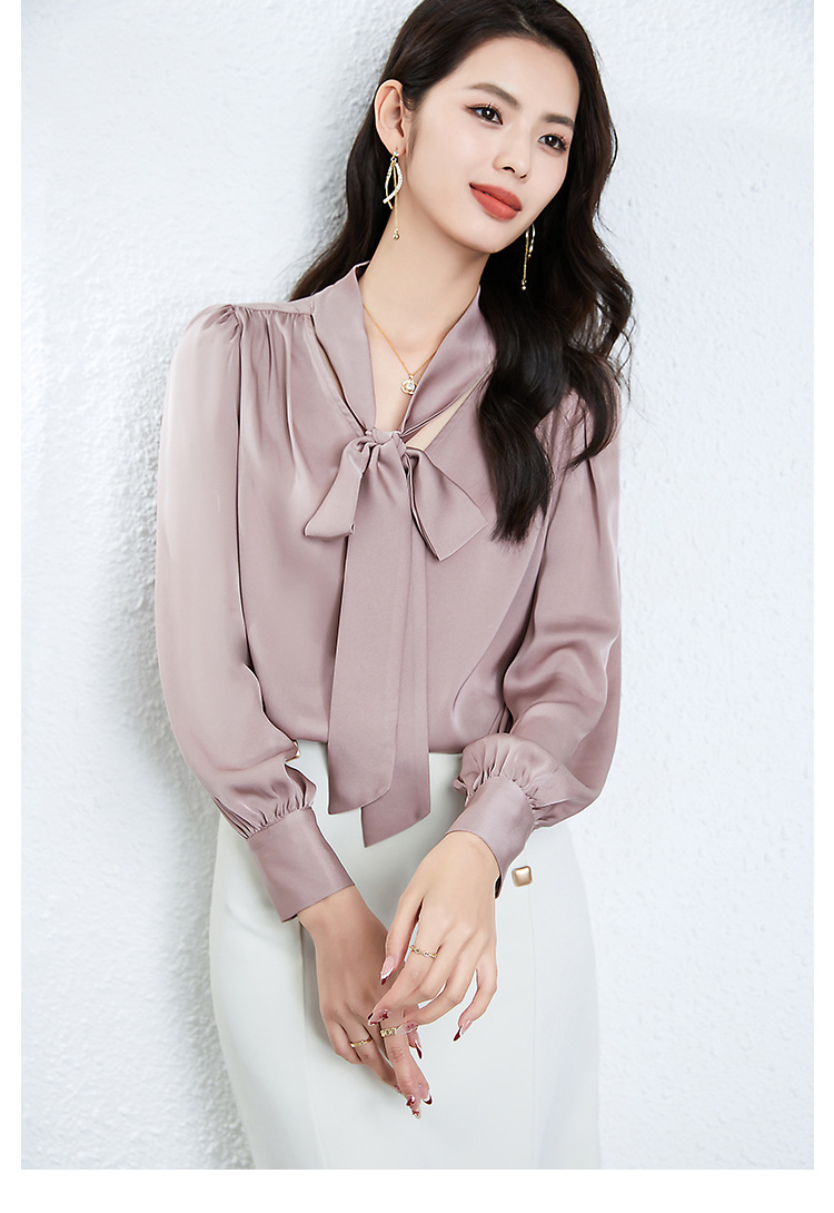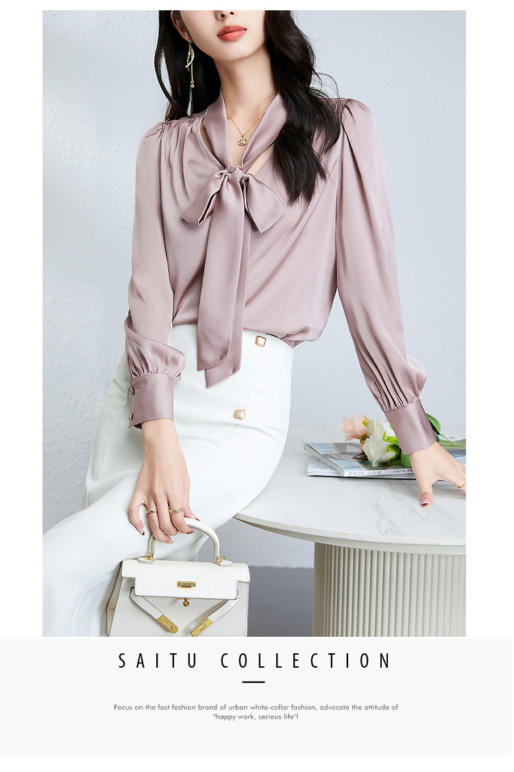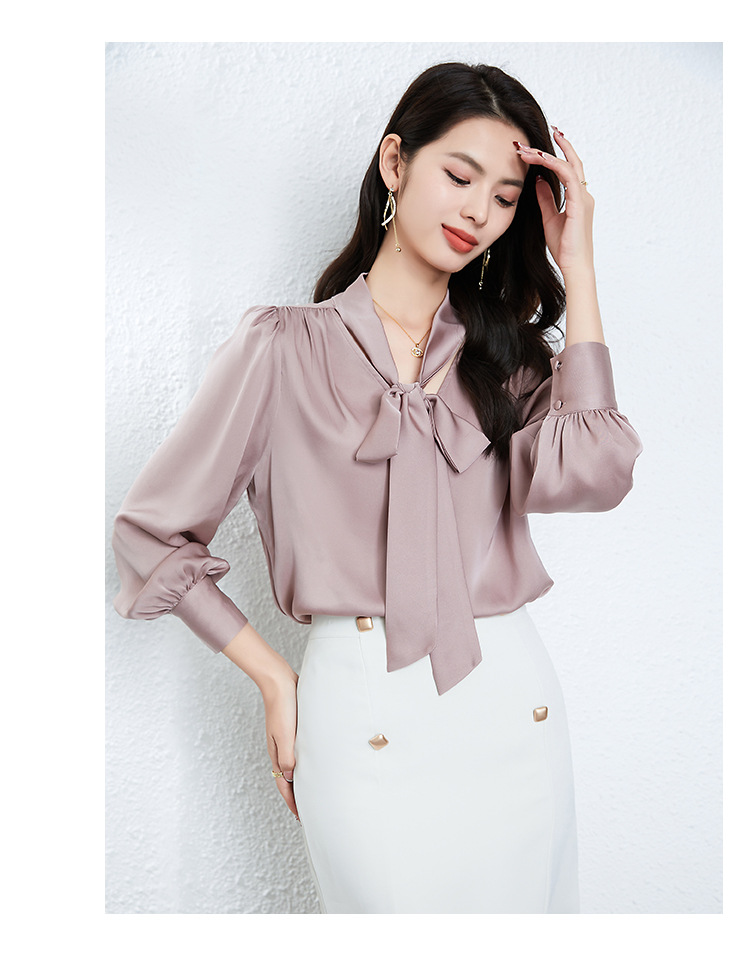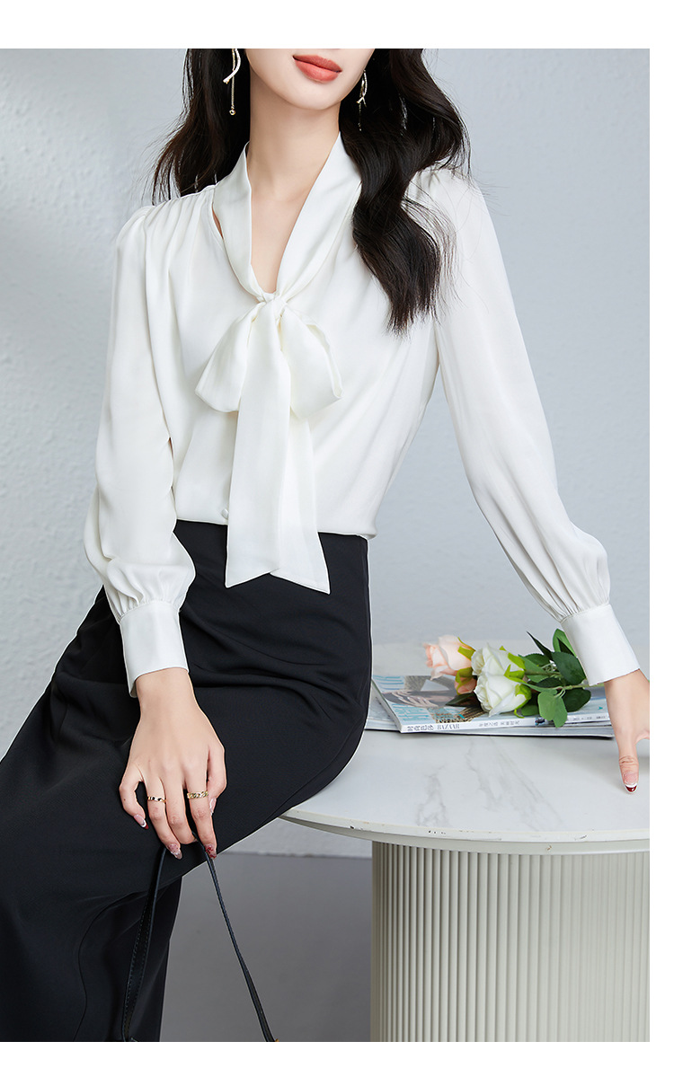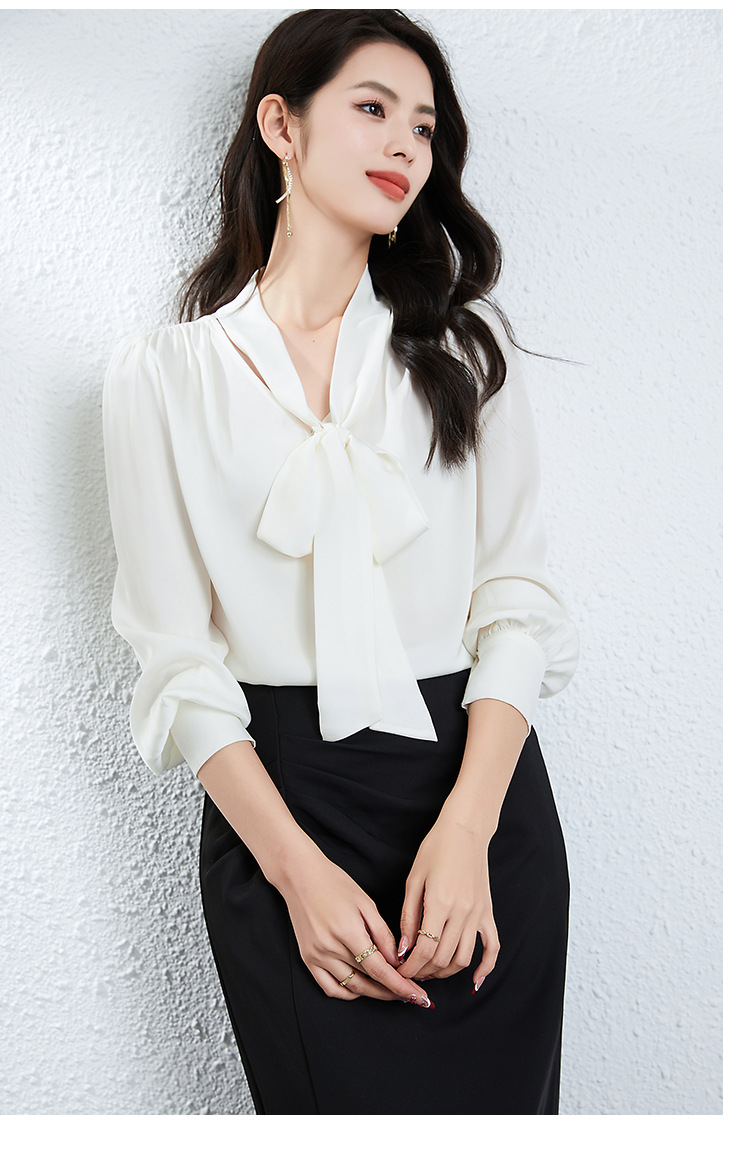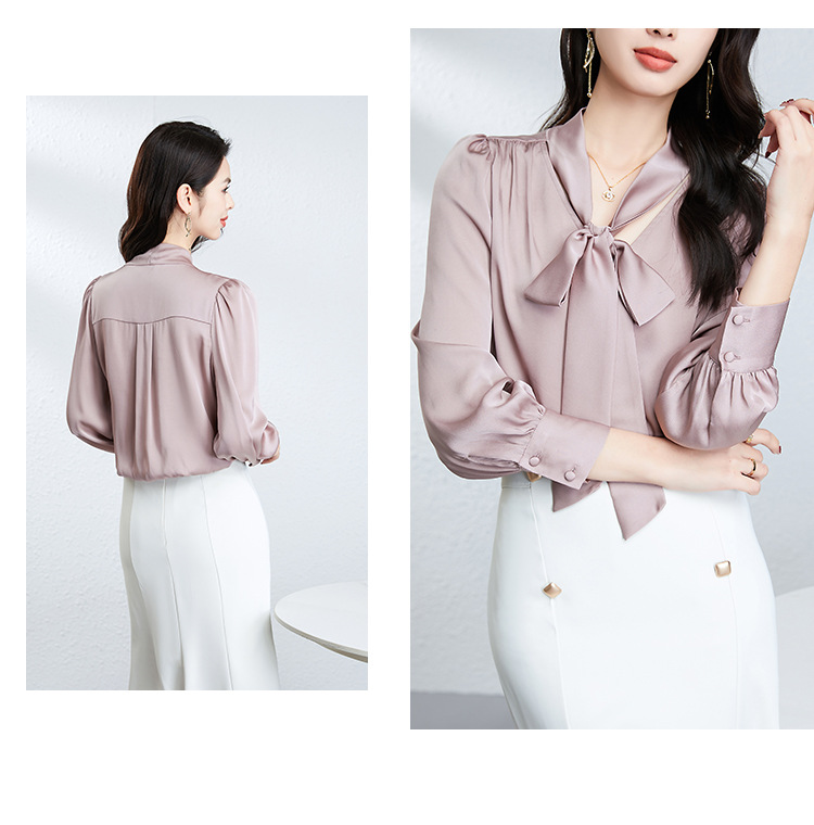 丁摩桑蚕丝衬衣女春季新款重磅真丝双乔法式V领蝴蝶结衬衫高级感上衣AL25013