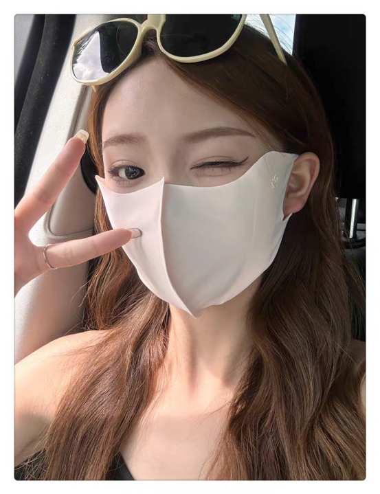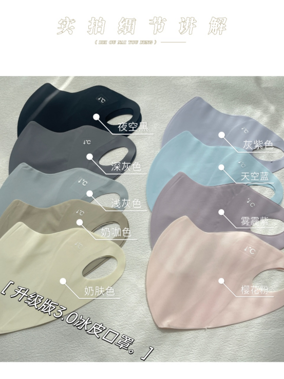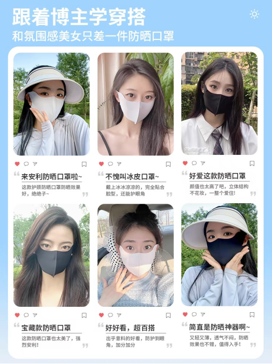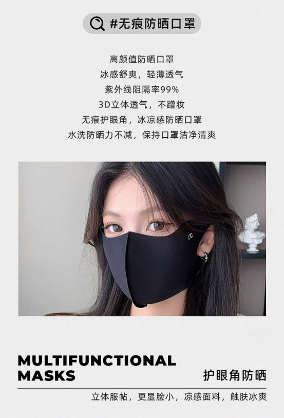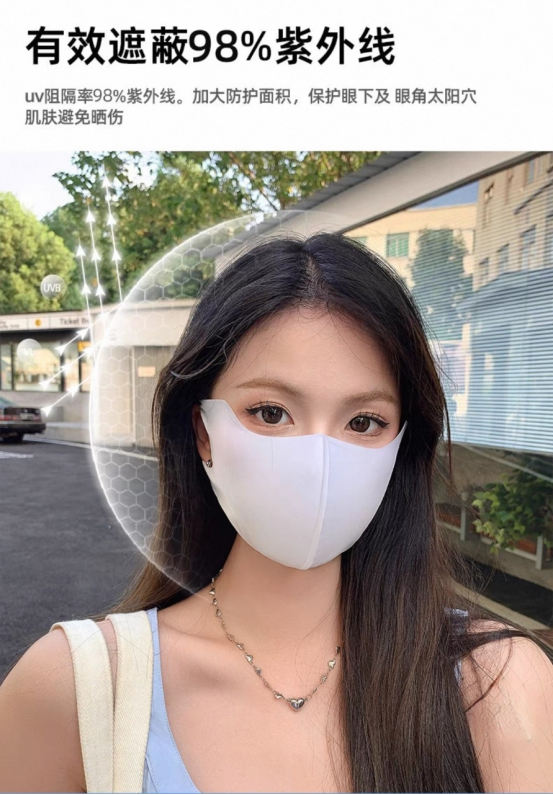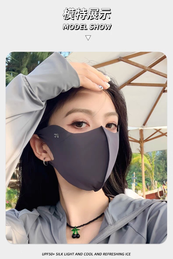 口罩届的卷王 真正能防晒的口罩 真正做到USF50+防晒效果 冰冰凉凉的冰丝面料夏季透气不闷热! 真正硬核防晒口罩 关键还很修饰脸型 面料轻薄柔软 透气不闷热 一体式剪裁 更贴合脸部设计 从眼角一直遮到下巴 整个脸都能全方位包裹 防晒力max 重点是戴上它是真显脸小 懂得都懂超适合夏天戴的凉皮口罩面料和牛奶一般丝丝滑滑! 戴上又凉快又显瘦! 做了护眼角设计保护眼周 防止晒伤真的很加分 男生也可以冲