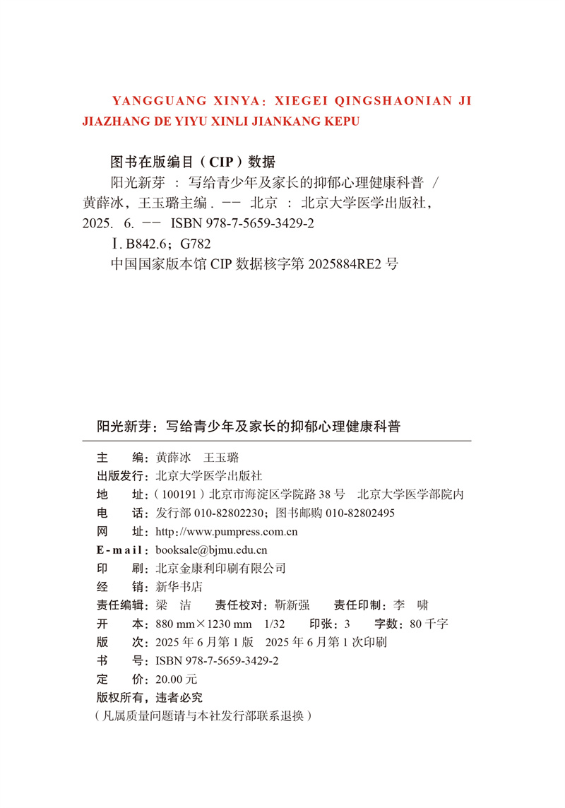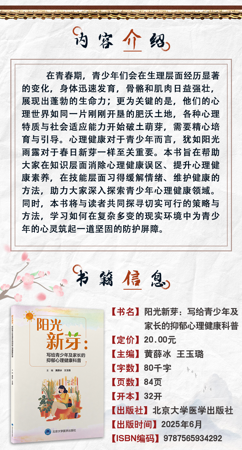 阳光新芽:写给青少年及家长的抑郁心理健康科普 黄薛冰 王玉璐 消除青少年心理健康误区 介绍维护情绪健康方法北京大学医学出版社
