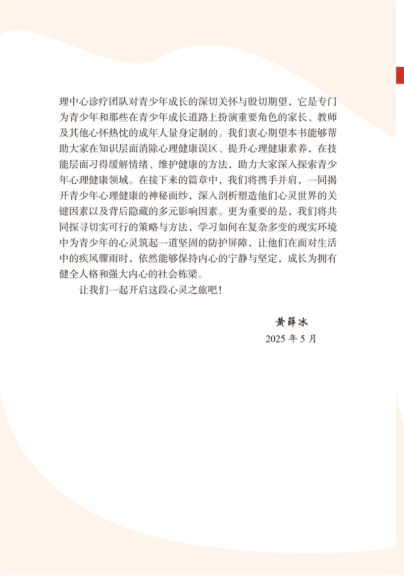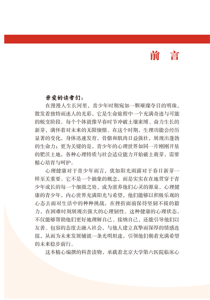 在青春期,青少年们会在生理层面经历显著的变化,身体迅速发育,骨骼和肌肉日益强壮,展现出蓬勃的生命力;更为关键的是,他们的心理世界如同一片刚刚开垦的肥沃土地,各种心理特质与社会适应能力开始破土萌芽,需要精心培育与引导。心理健康对于青少年而言,犹如阳光雨露对于春日新芽一样至关重要。本书旨在帮助大家在知识层面消除心理健康误区、提升心理健康素养,在技能层面习得缓解情绪、维护健康的方法,助力大家深入探索青少年心理健康领域。同时,本书将与读者共同探寻切实可行的策略与方法,学习如何在复杂多变的现实环境中为青少年的心灵筑起一道坚固的防护屏障。