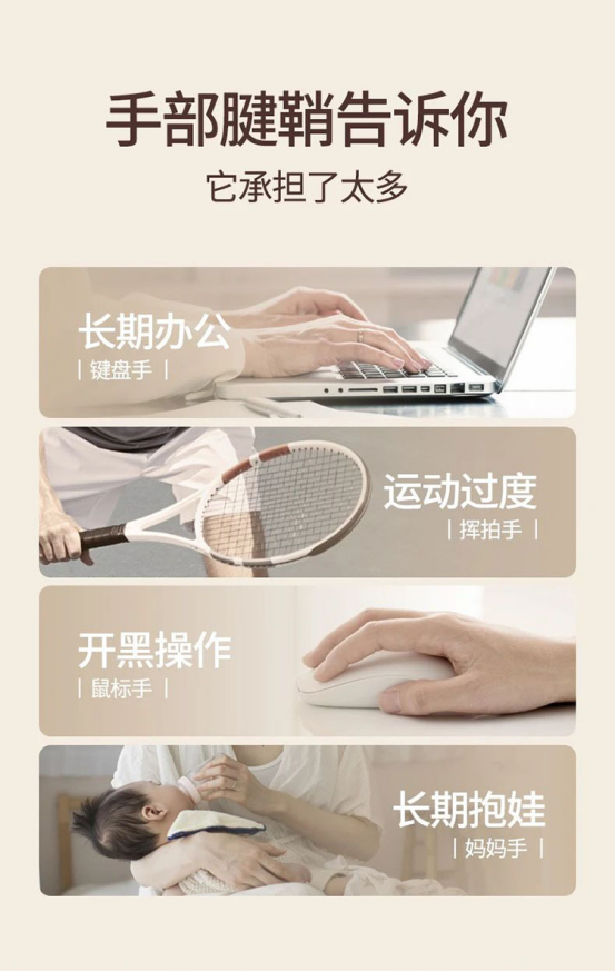 现代人的常态:码字刷剧打游戏,手机电脑不离身。 手指、手腕长期频繁快速地重复一个动作,例如,用鼠标、玩游戏、抱娃……时间一长, 就很容易导致腱鞘炎,也就是常说的“鼠标手” 一开始可能只是每天手腕僵硬、隐隐作痛,但时间长了,就会感到手指和手掌发麻, 像被容嬷嬷用针扎似的。 连晚上睡觉的时候,手掌和腕部也会发胀发麻,让你辗转反侧,无法入睡。 这些问题加重的话,还能让你充分理解什么叫做「手无缚鸡之力」, 到时候连开个瓶盖、拧个水龙头都会变得很困难。