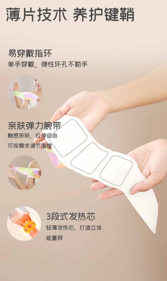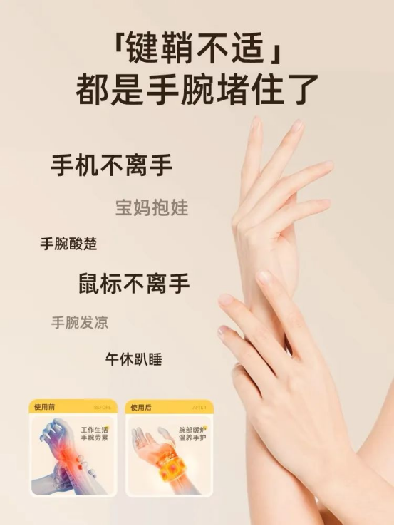 恐怖的是,腱鞘炎不分年龄,老中青都可能患上,它的得病率高,发病率在1.7%-2.6%之间! 日常生活中,我们不自觉的一些动作,持续手腕或手指固定姿势, 反复的屈伸旋转活动,导致关节劳损,挤压腱鞘, 腱鞘被挤压变形后可出现无菌性的炎性反应,炎症刺激后伴有局部麻木、活动受限等症状 有这样一些人,他们的肌腱使用频率高,活动量大,腱鞘炎发生的可能性也更高: ①勤快的家庭主妇 ②新任妈妈、姥姥、奶奶 ③长期操作鼠标、电脑的人员 ④手机游戏沉迷者 ⑤反复活动手和手腕的劳动者/运动员 这个护腕贴有点牛 因长期抱着宝宝手腕频繁处于某一负重 体位会导致手腕肌腱发炎、疼痛、肿帐 这个手腕贴,专为妈妈们设计,通过蒸汽热敷 对手腕进行防护, 有效缓解不适 它采用自发热技术 无需等待,贴上就能感受到温暖 坚持热敷,手腕真的不疼了。