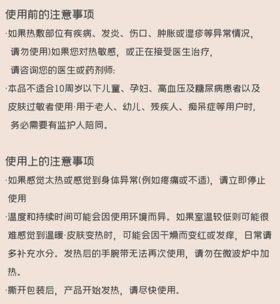 【使用方法】 当需要使用时,撕开包装。牢固地贴于痛处,压实。用于手腕时,小心不要使加热片交叠。 使用时经常检查你的皮肤,如果有任何不适和烫伤,立即拿掉此热敷贴。 如果你已经55岁以上了,使用热敷贴时要隔着一层布料,不要直接贴在皮肤上,也不要再睡觉时使用。
