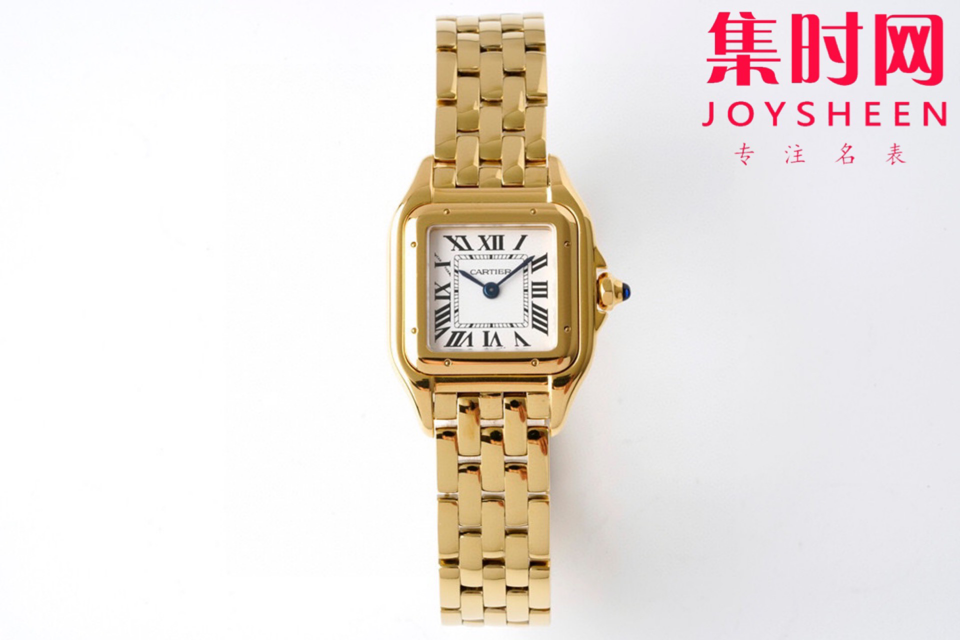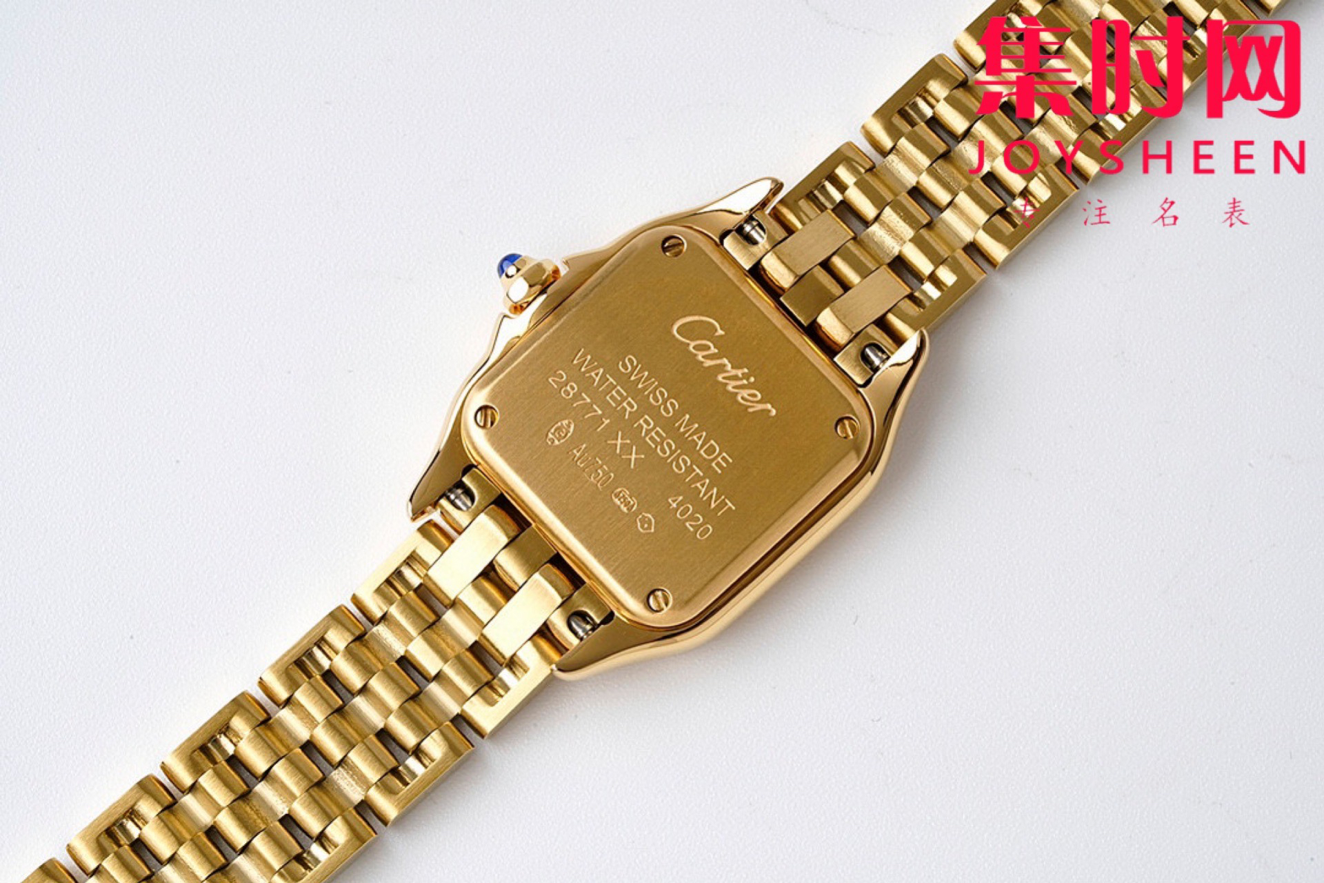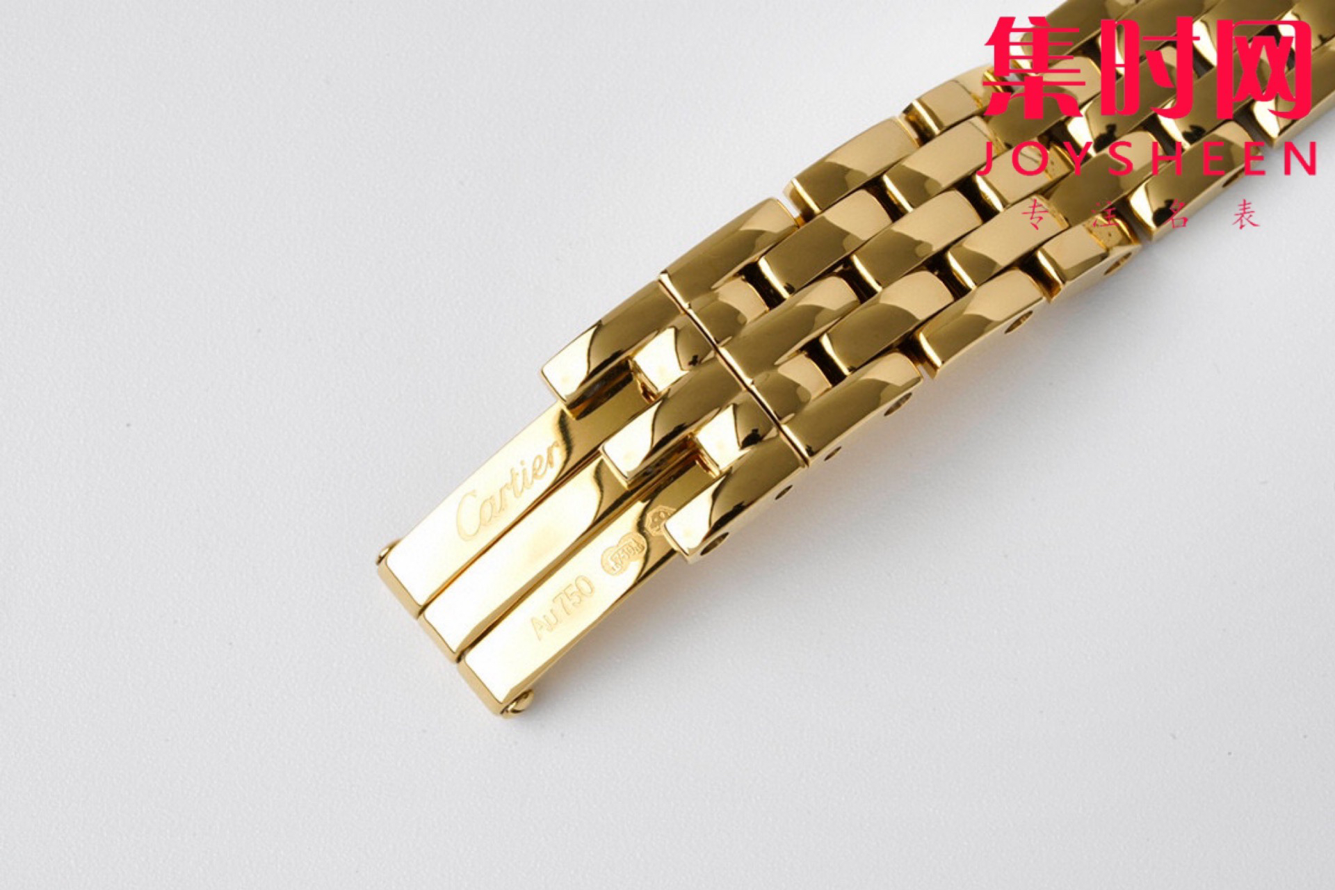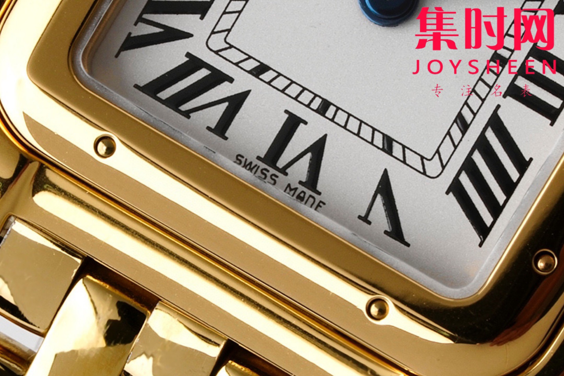 卡地亚Panthère de Cartier猎豹系列腕表 小号22X30mm 使用方形双层表壳看起来更加立体大方,更加突显出腕表的优雅与经典。白色表盘上,卡地亚式时标设计更为腕表注入一份品牌的 魅力。蓝色中央时分针宛若在两只随时间而舞动的精灵,为整款腕表再填华彩。 与传统卡地亚腕表一样,表冠上镶嵌有一颗具有品牌代表性的蓝宝石,向观表者展现高级钟表珠宝品牌卡地亚的独有魅力。表冠采用防滑纹理设计,方便对腕表的调试。两边的表冠护桥也为腕表增添了一份安全防护。 相比背透设计,密底工艺可以保障腕表机芯安全性。灵活自如的链节表链是腕表另一大亮点,处处都散发着曜目而饱满的光芒,从上到下都充满着独特的优雅奢华气质。