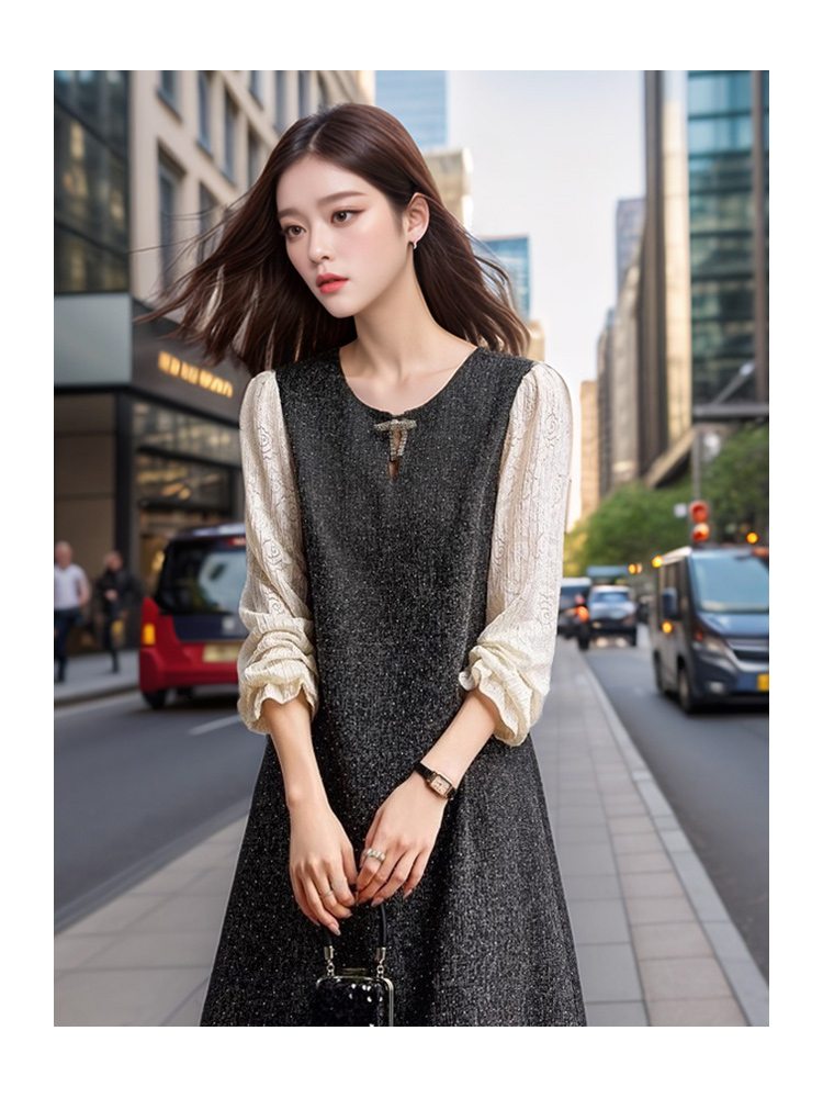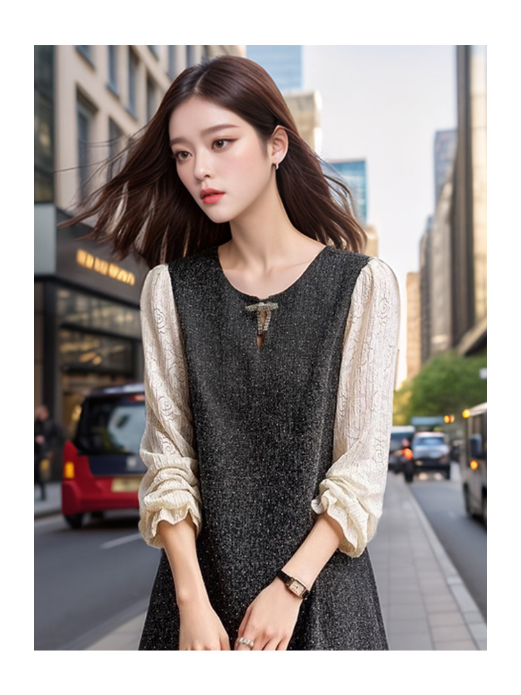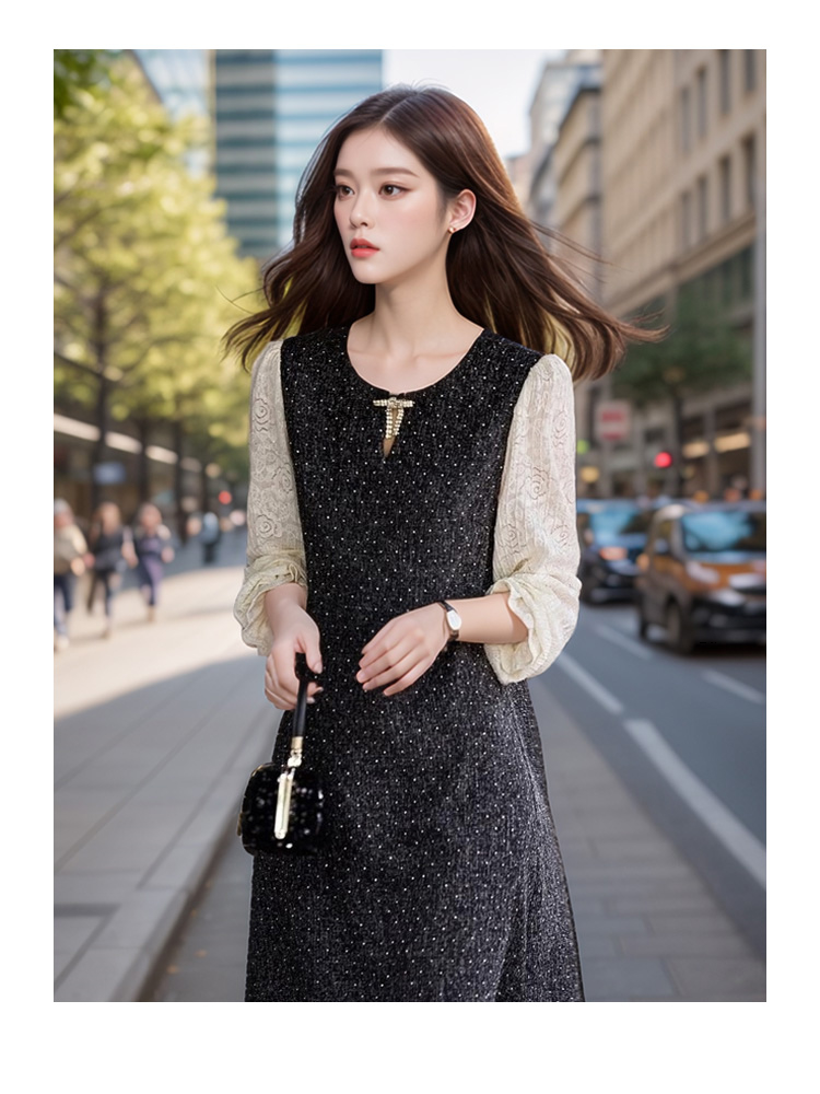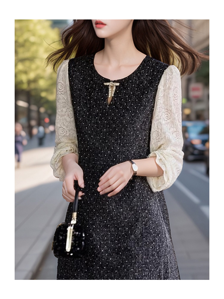 奢姿2024年秋季新款大码女装圆领蝴蝶结裙子胖妹妹拼接蕾丝连衣裙9943853671