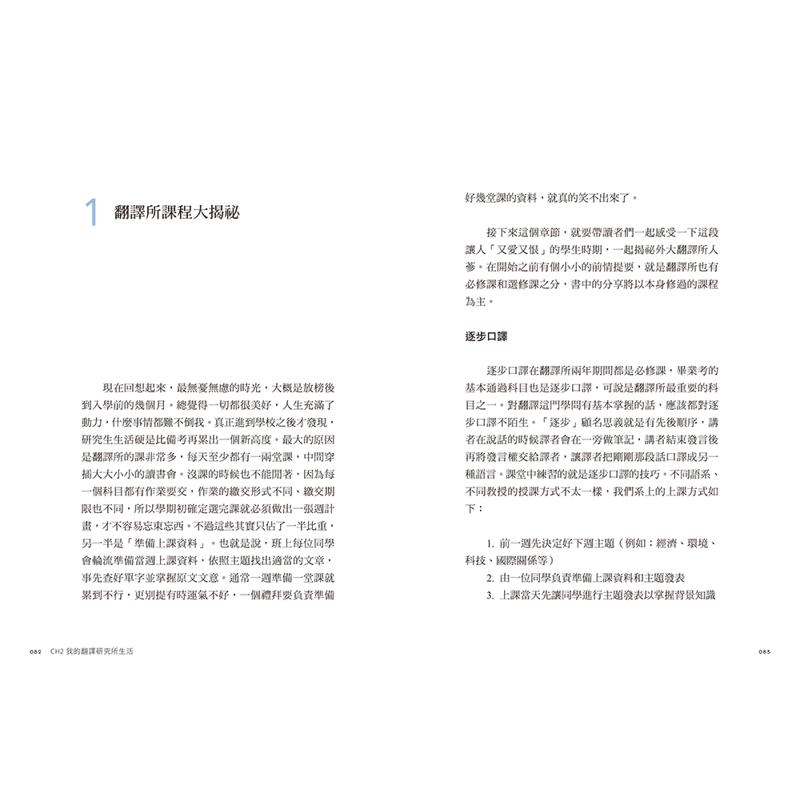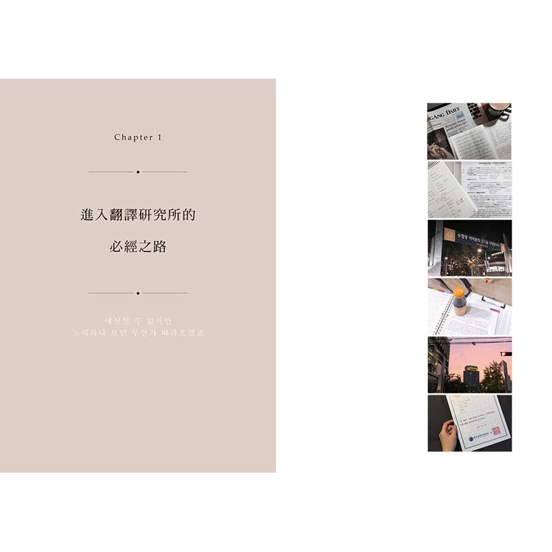 书中简单介绍韩国外大、梨大、中央大与首尔外大四间韩国主要的翻译研究所,针对作者就读的外大,从备考、面试、学校课程到毕业考都详细记录。并分享外大「听说读写」练功方法,例如「听力」除了要能听懂对方在说什么,更需要短暂将内容记住并翻译,于是做「记忆训练」就格外重要。除此之外,还教你视译、跟读、笔记、读书会等具体练习做法,完整呈现专业翻译员的实力养成之路。