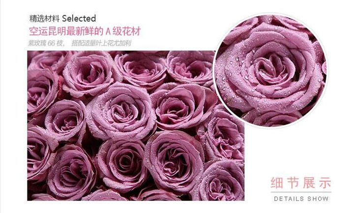 紫玫瑰66枝,搭配适量叶上花、尤加利