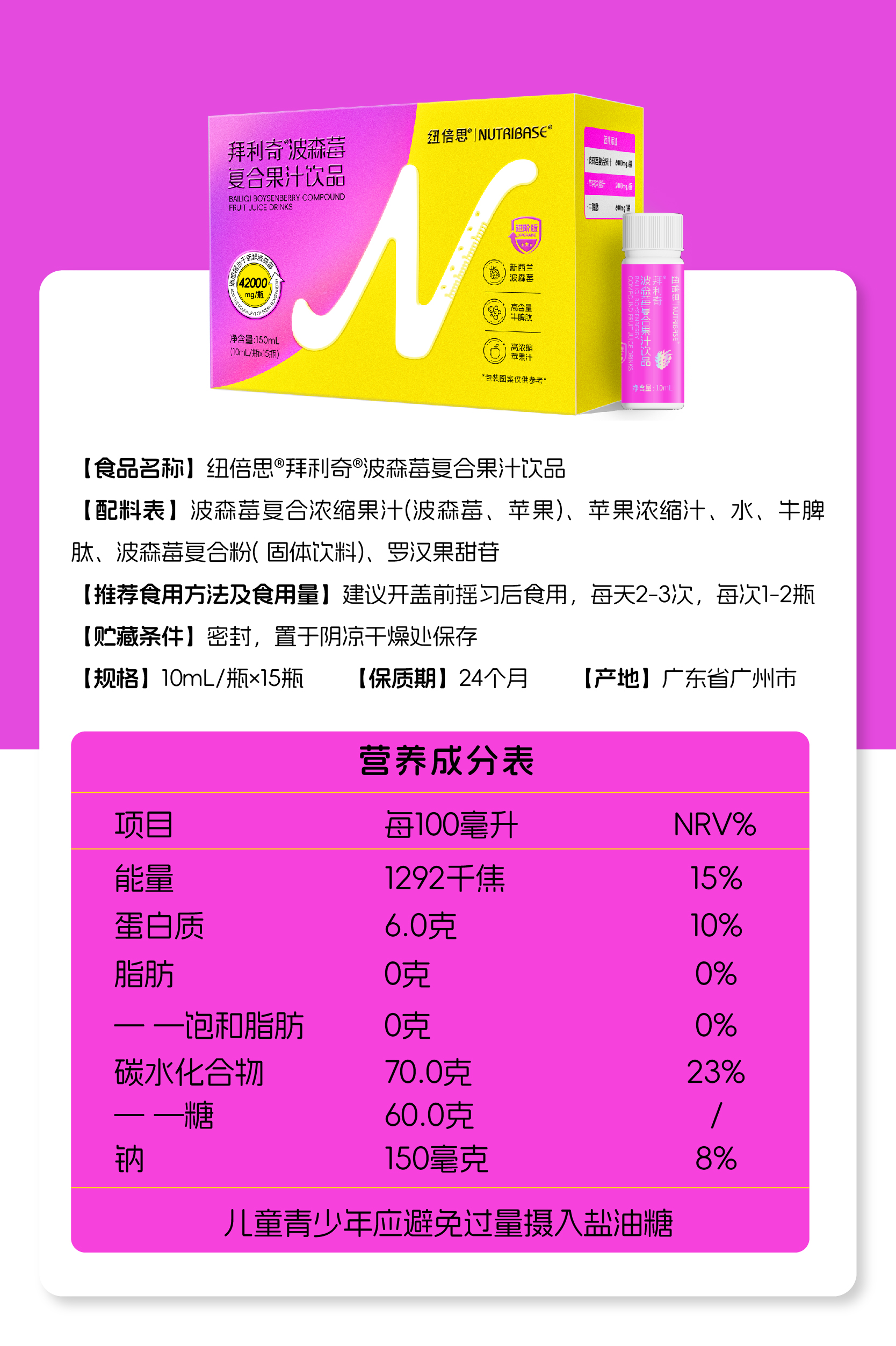 每瓶含6000mg浓缩波森莓+牛脾肽600mg 酸酸甜甜 果汁口感 10ml*15瓶/盒