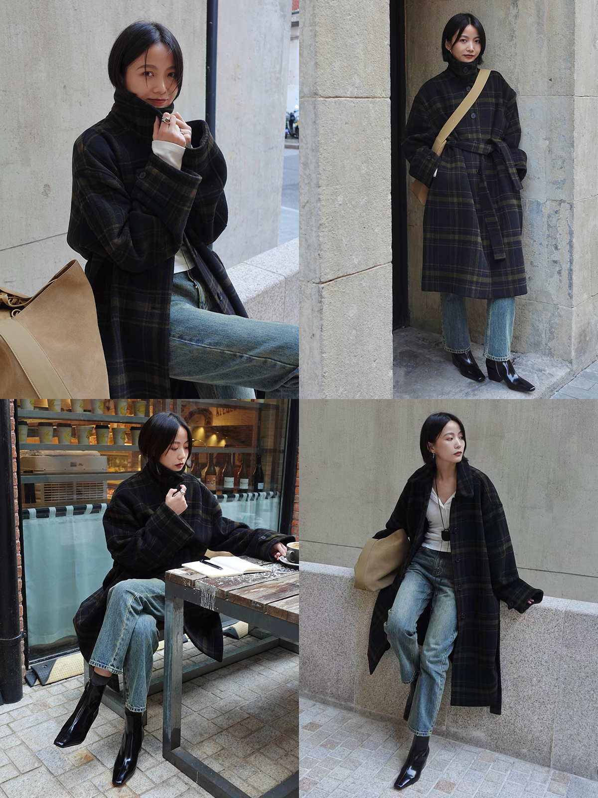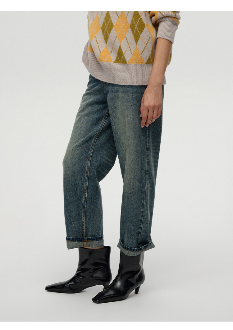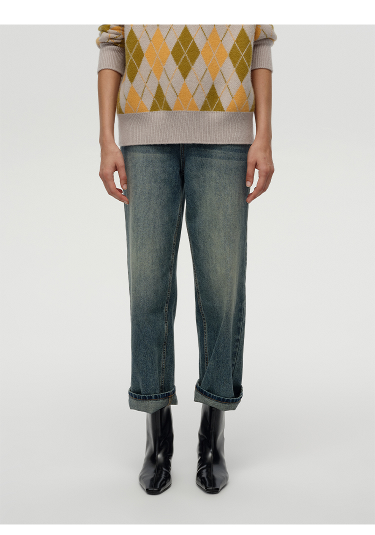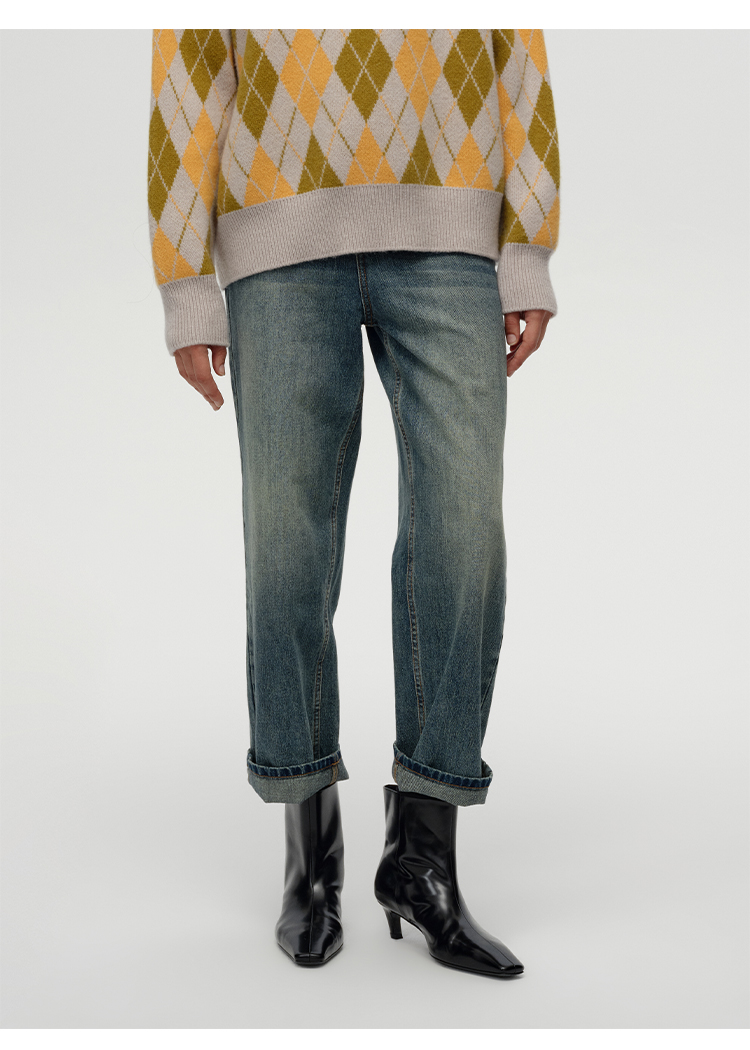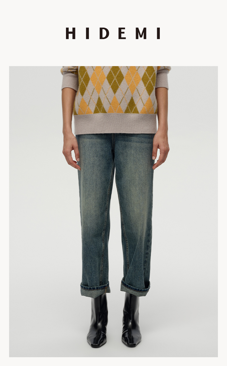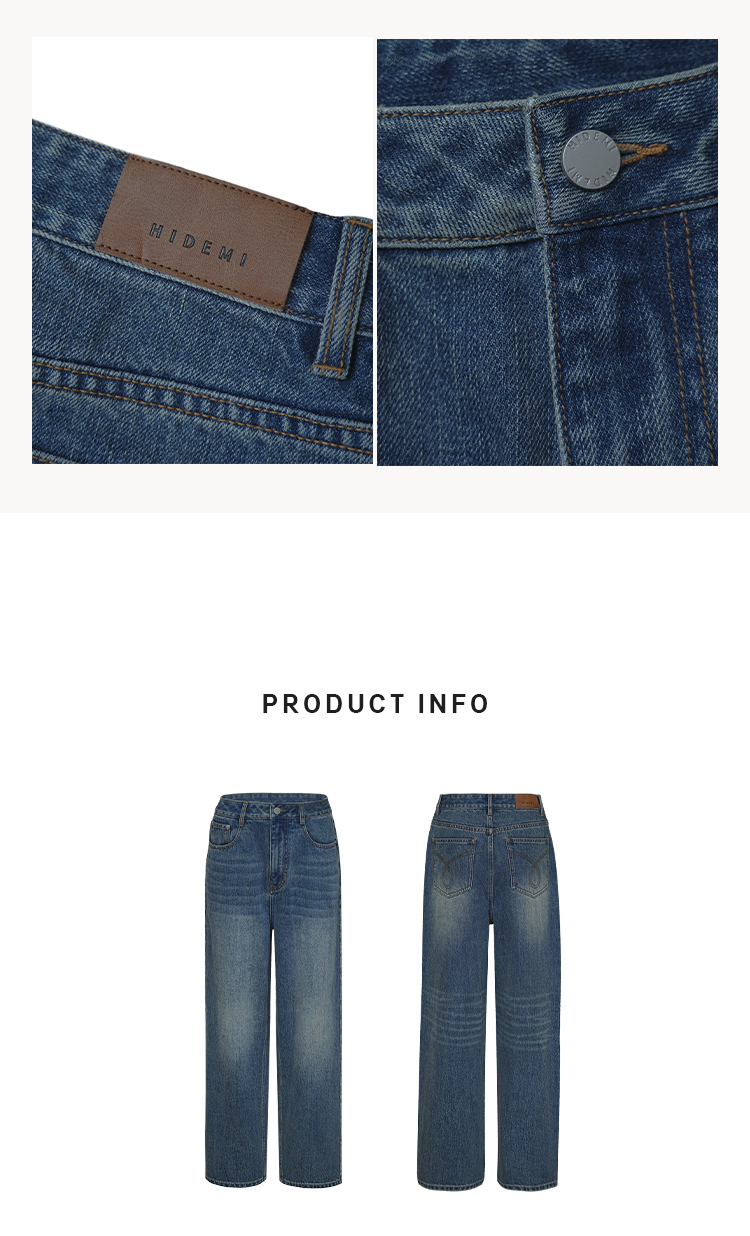 HIDEMI 多重水洗复古感做旧牛仔蓝宽腿长裤牛仔裤