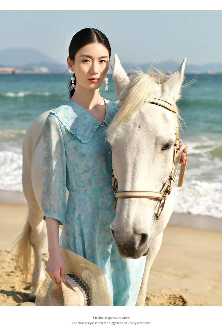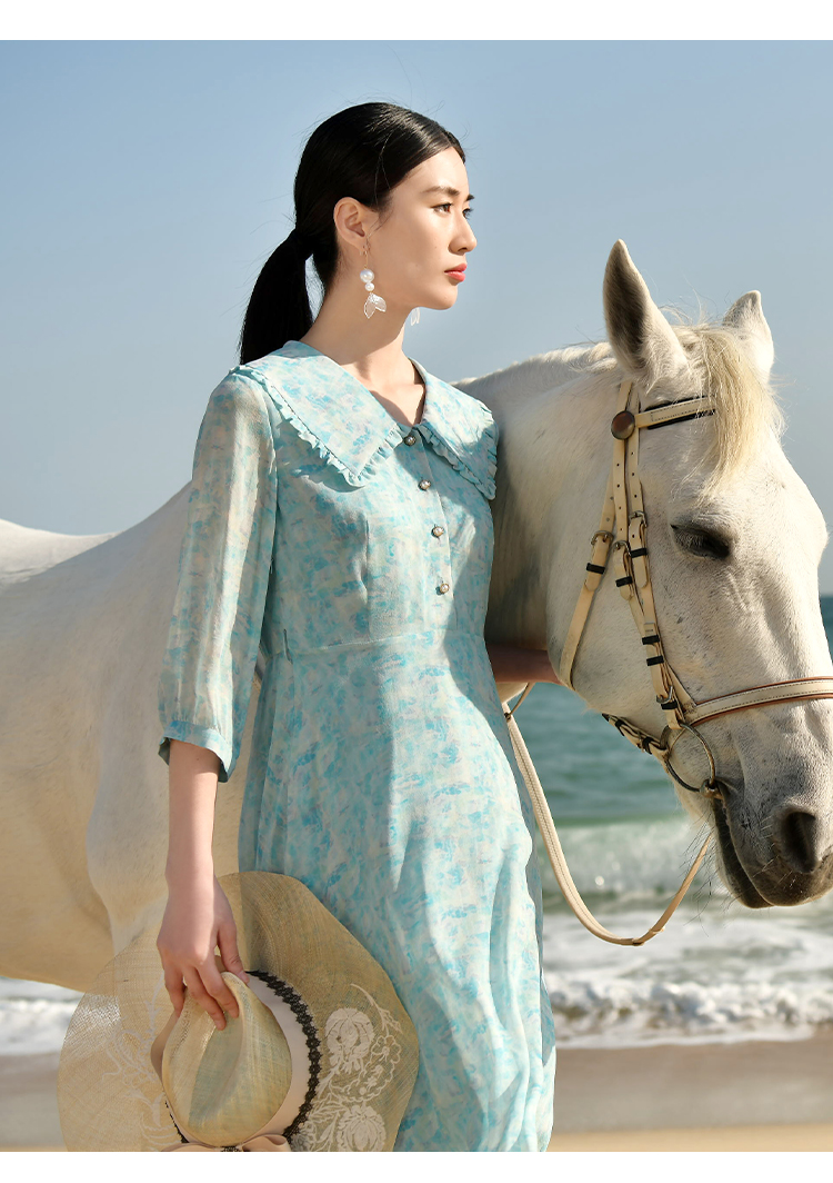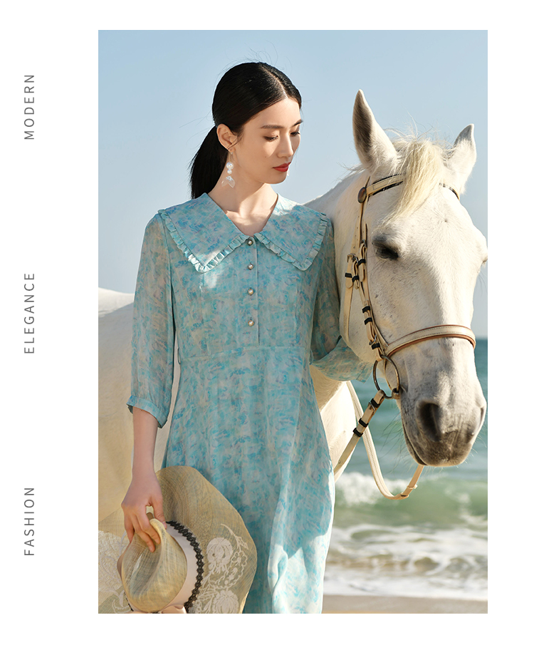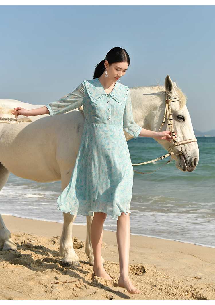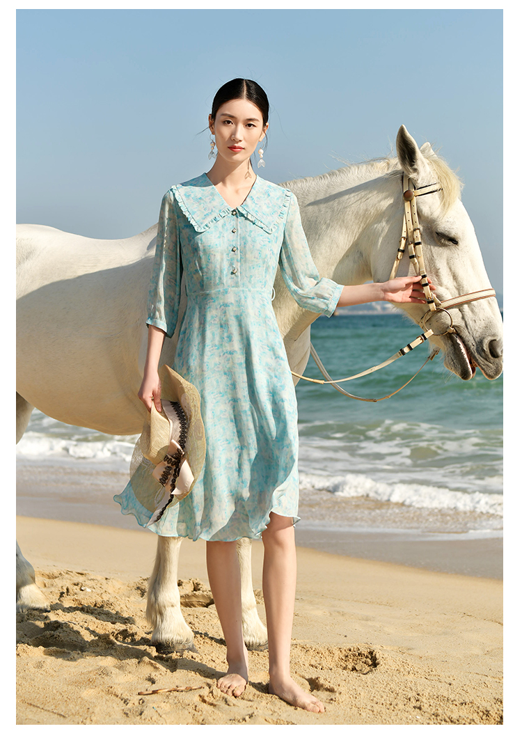 佐尔美夏季新款优雅气质乔其印花7分袖荷叶领碎花连衣裙女E32LS48
