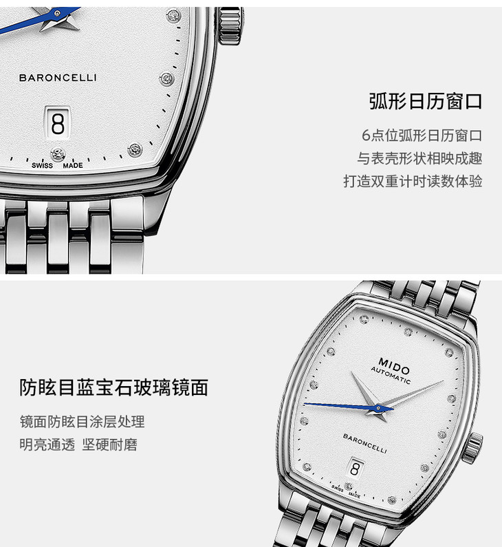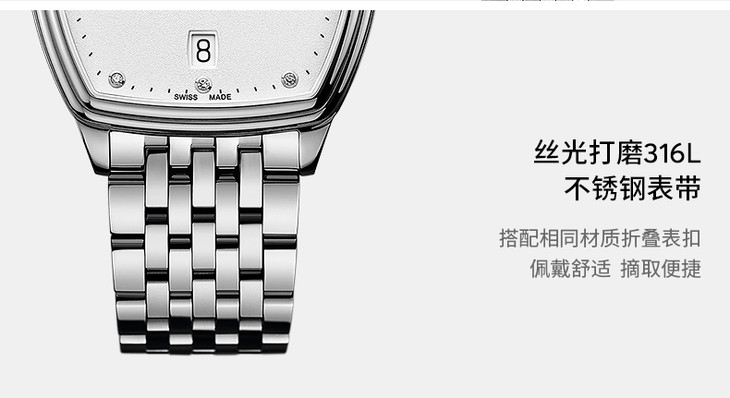白色粒面酒桶型表盘,镶嵌12颗钻石(0.045克拉)时标