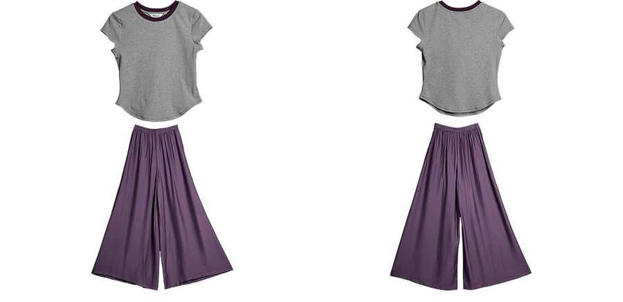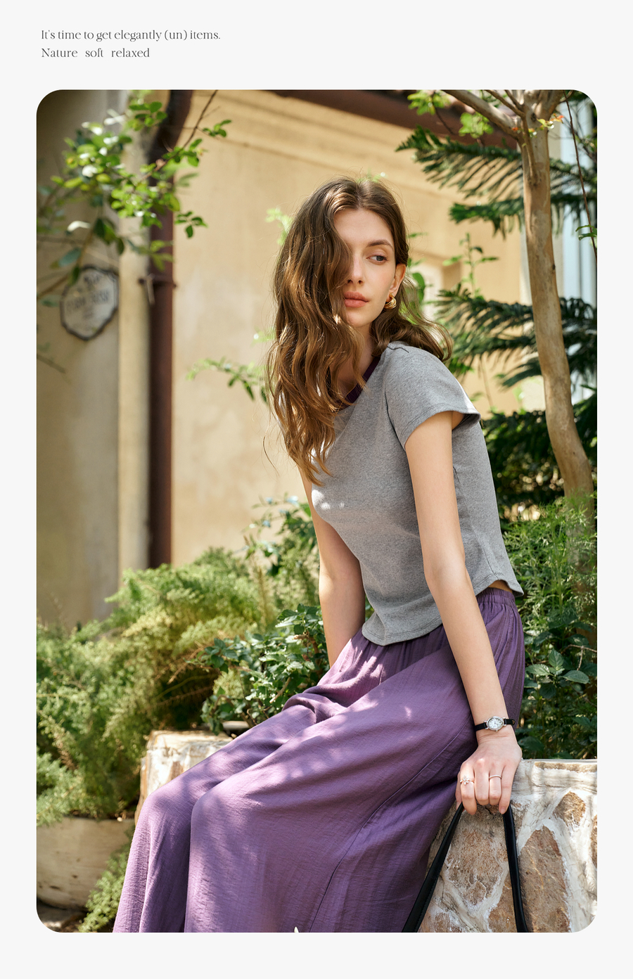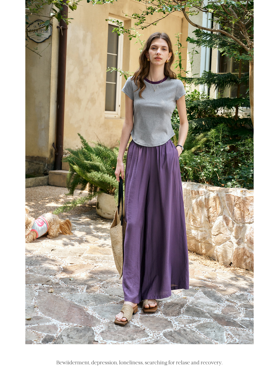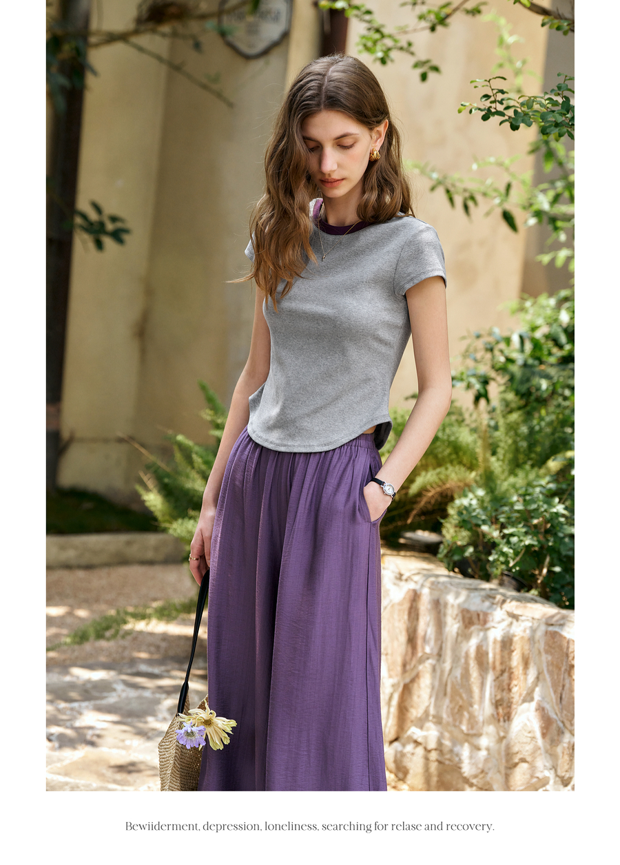OLrain欧芮儿灰色修身上衣紫色慵懒风裤子女夏季2025新款两件套装