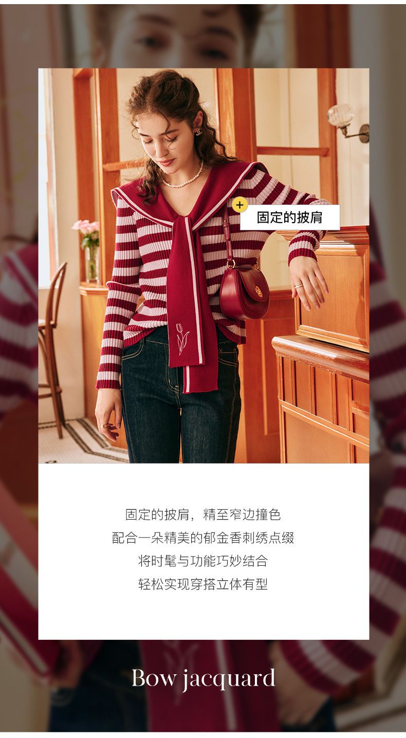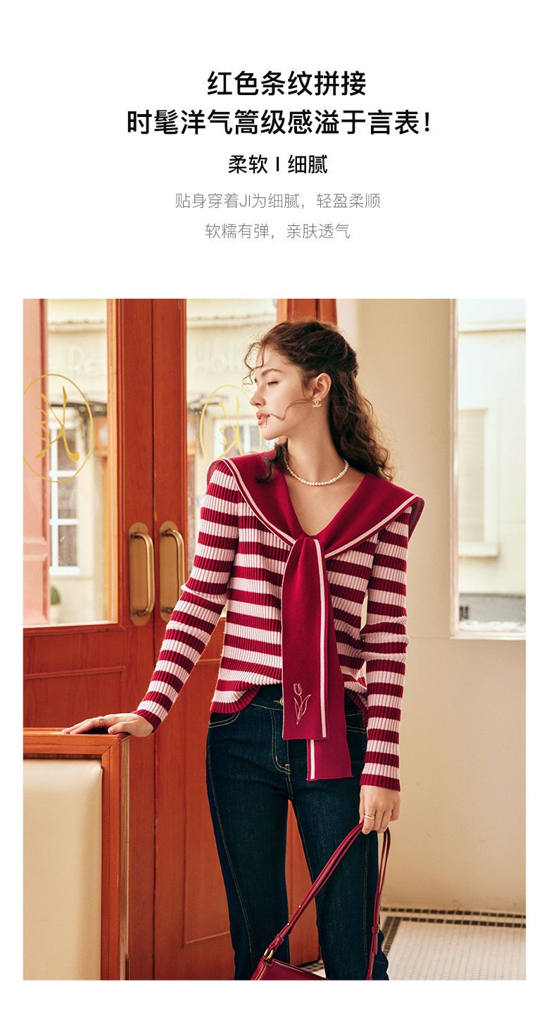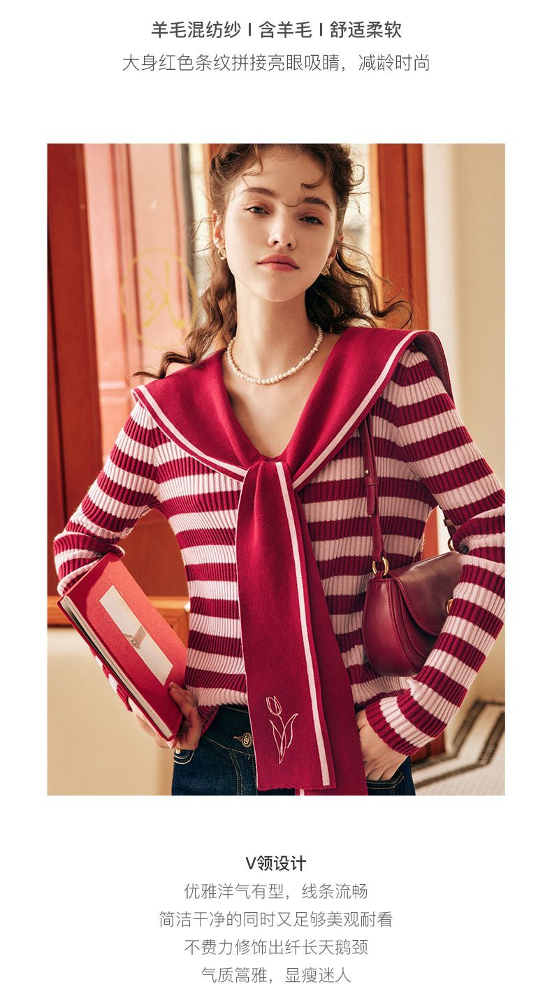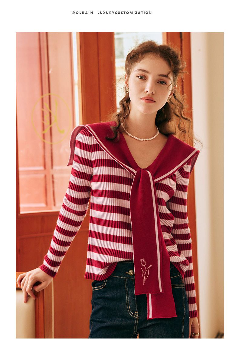 OLrain欧芮儿法式条纹毛衣女秋季2025年新款刺绣v领披肩款针织衫