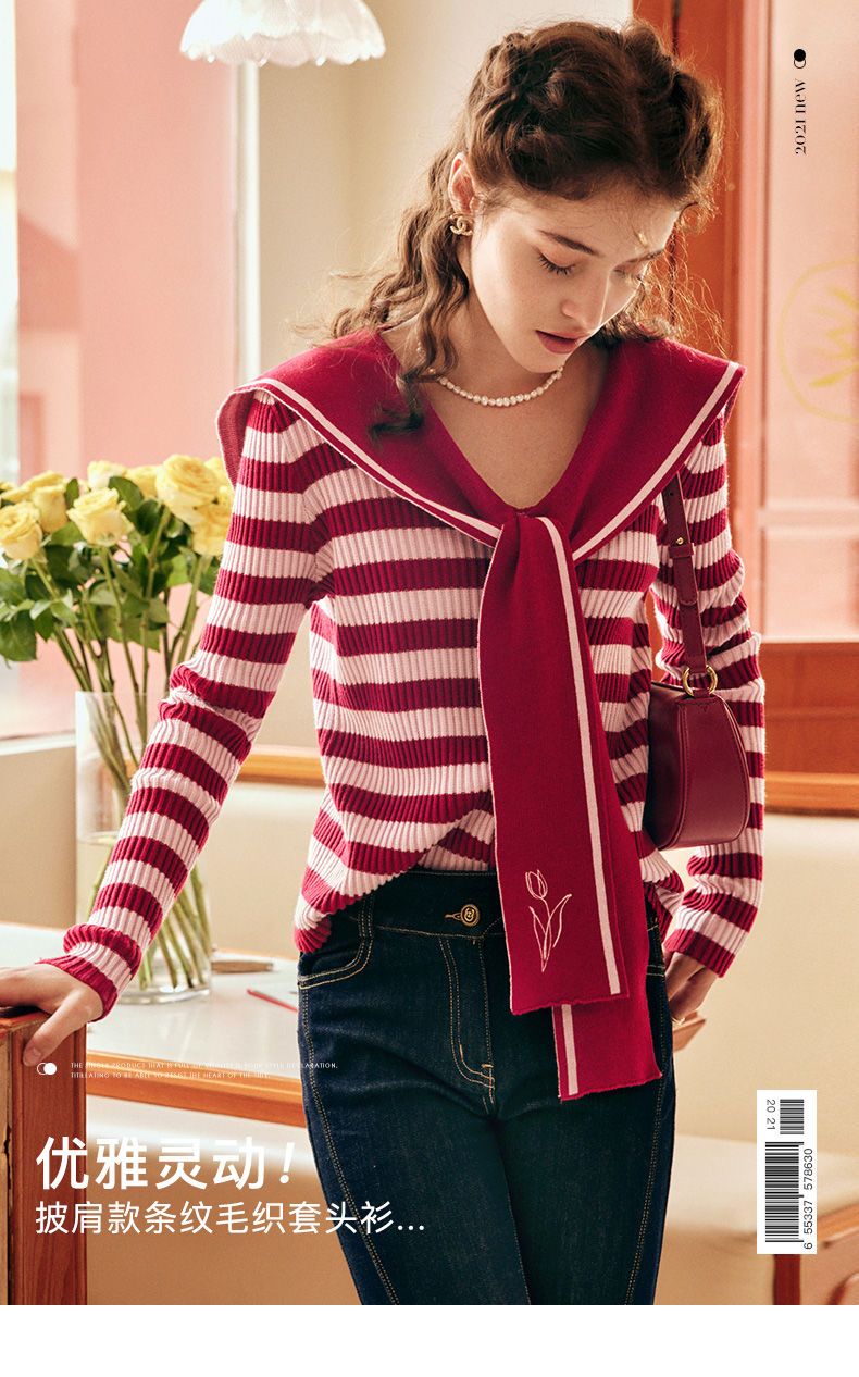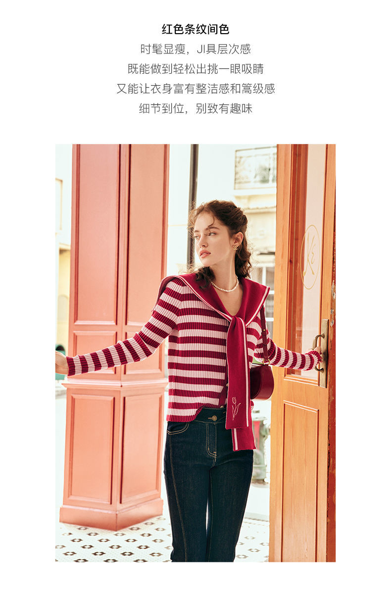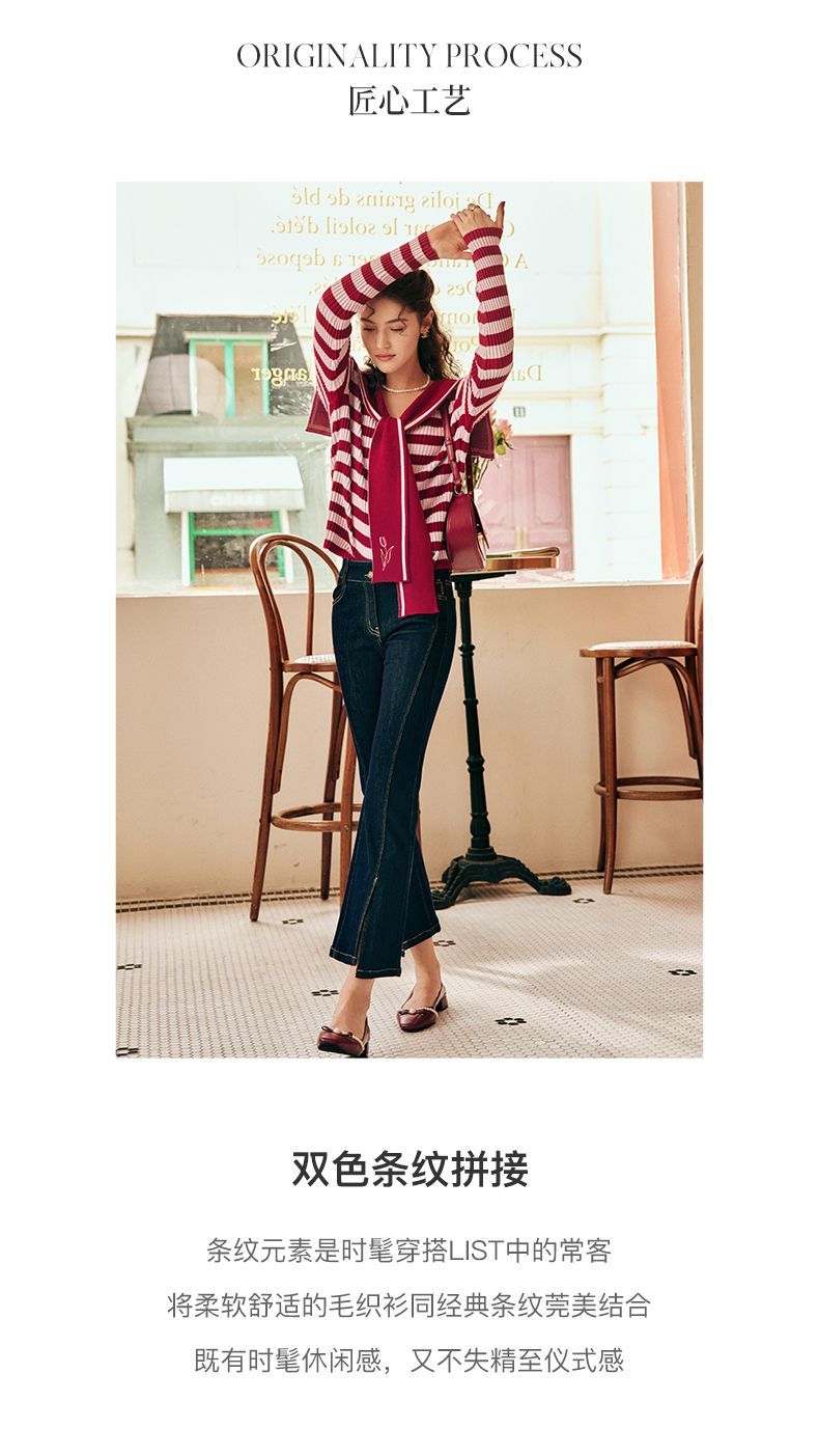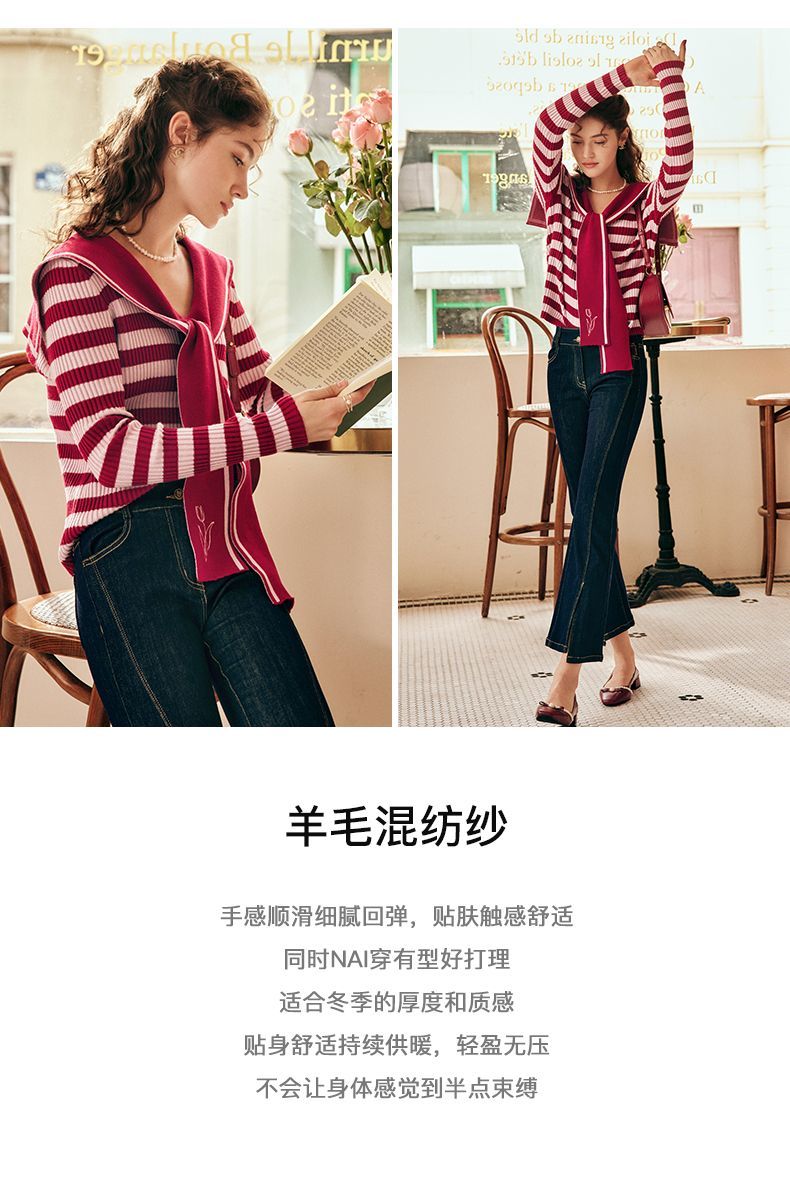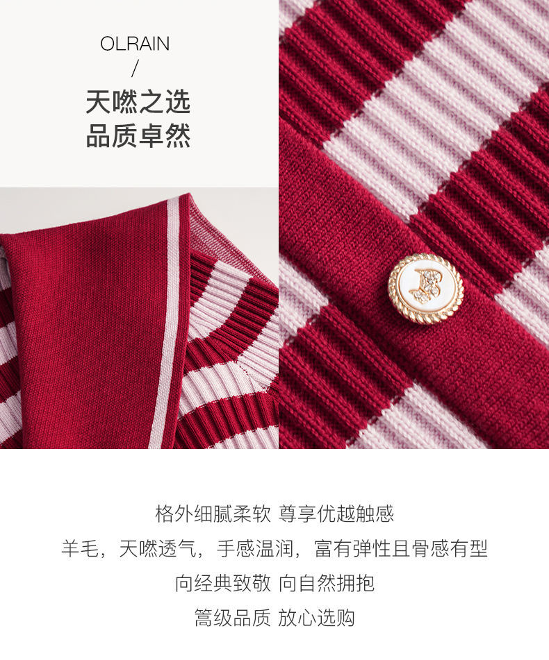 OLrain欧芮儿法式条纹毛衣女秋季2025年新款刺绣v领披肩款针织衫