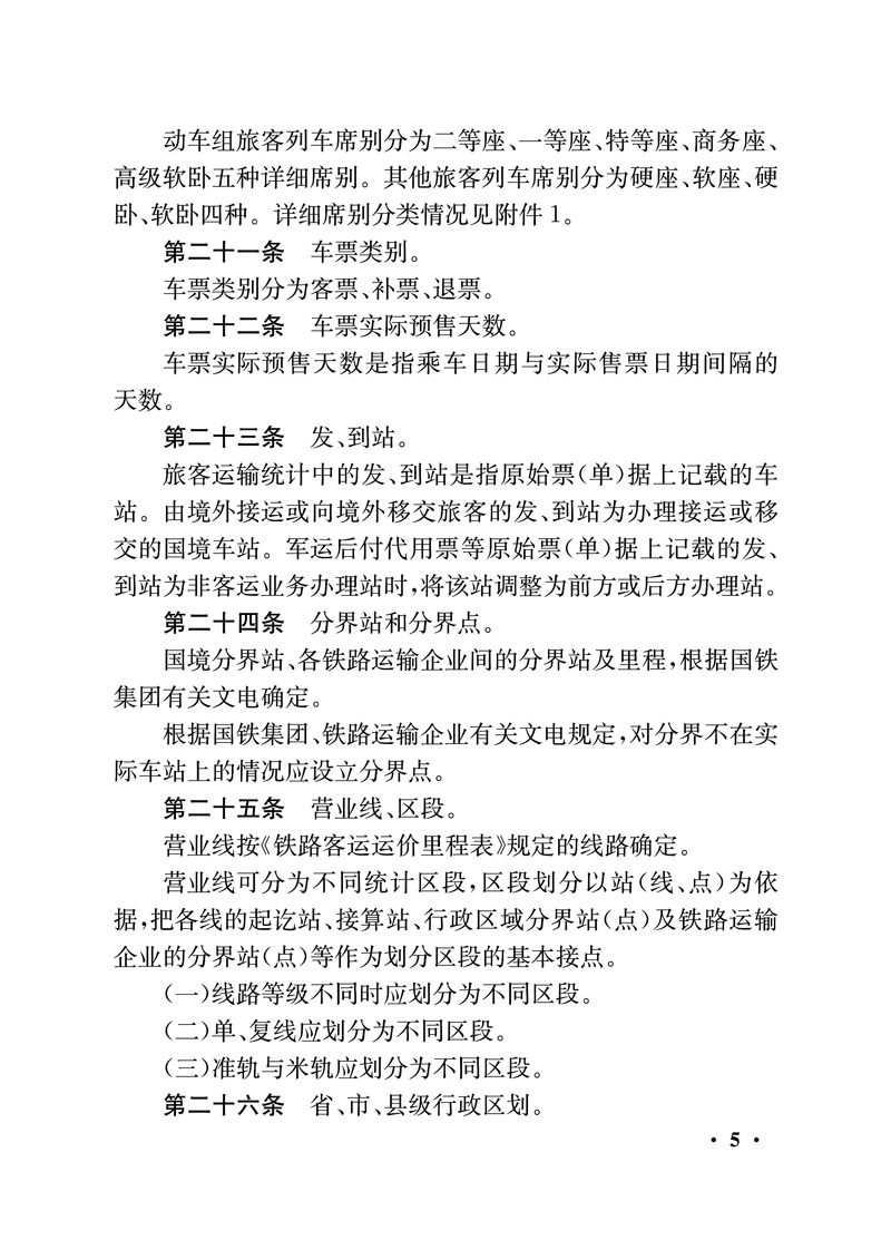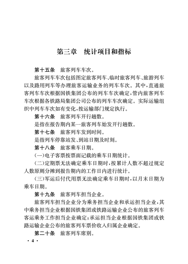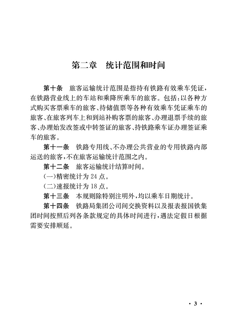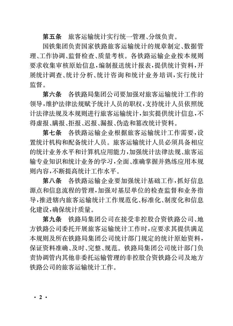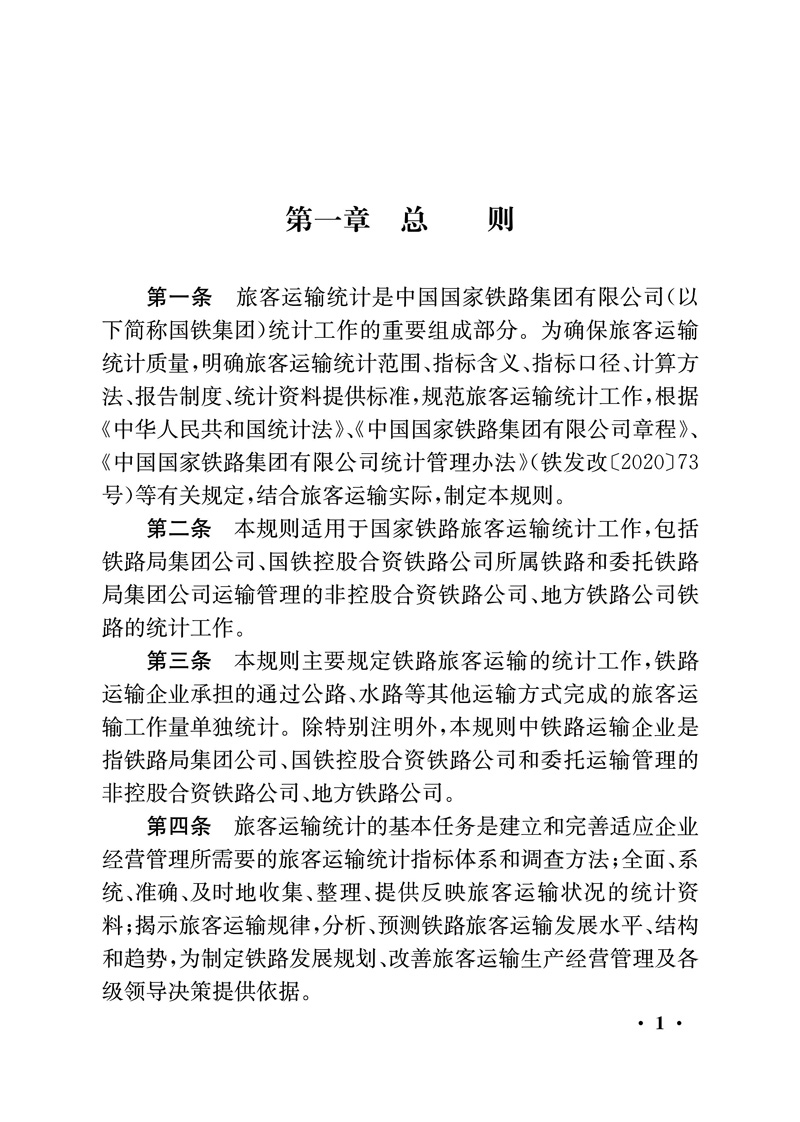 旅客运输统计是中国国家铁路集团有限公司统计工作的重要组成部分。为确保旅客运输统计质量,明确旅客运输统计范围、指标含义、指标口径、计算方法、报告制度、统计资料提供标准,规范旅客运输统计工作,根据《中华人民共和国统计法》《中国国家铁路集团有限公司章程》《中国国家铁路集团有限公司统计管理办法》(铁发改〔2020〕73号)等有关规定,结合旅客运输实际,制定本规则。本规则主要规定铁路旅客运输的统计工作,铁路运输企业承担的通过公路、水路等其他运输方式完成的旅客运输工作量单独统计。除特别注明外,本规则中铁路运输企业是指铁路局集团公司、国铁控股合资铁路公司和委托运输管理的非控股合资铁路公司、地方铁路公司。