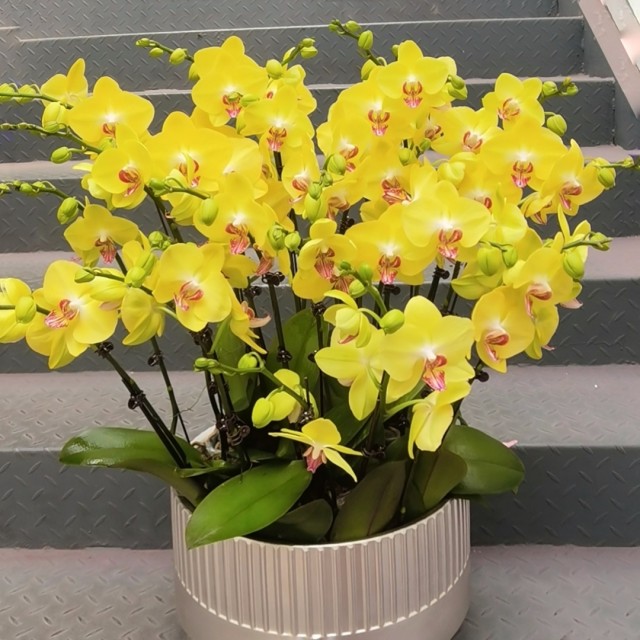 花材:精品黄色蝴蝶兰10株,类似雅致花器