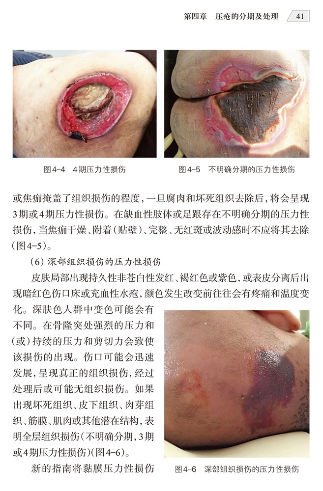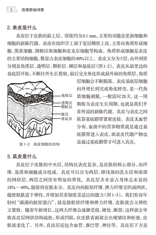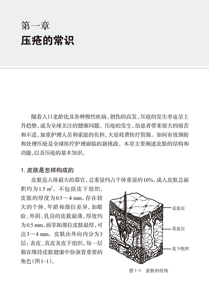 *章 压疮的常识 1.皮肤的结构是什么? 2.表皮是什么? 3.真皮是什么? 4.皮下组织是什么? 5.皮肤附属器有哪些? 6.皮肤的生理功能有哪些? 7.什么是皮肤的屏障功能? 8.什么是皮肤的吸收功能? 9.什么是皮肤的分泌和排泄功能? 10.什么是皮肤的体温调节功能? 11.什么是皮肤的感觉功能? 12.什么是皮肤的代谢功能? 13.什么是皮肤的免疫功能? 14.什么是压疮? 15.压疮发生的原因是什么? 16.压疮形成的外源性因素有哪些? 17.压疮形成的内源性因素有哪些? 18.压疮形成的相关因素有哪些? 19.压疮发生的机制是什么? 20.压疮的发生率如何? 21.哪些人容易发生压疮? 22.压疮容易发生在哪些部位? 23.压疮发生之后应该怎么办? 24.压疮会导致哪些并发症? 25.压疮并发症有什么危害? 26.压疮伤口多久会愈合? 第二章 压疮的危险评估 1.压疮危险评估有什么意义? 2.压疮危险评估的常用量表有哪些? 3.压疮危险评估的有哪些内容? 4.压疮危险评估有哪些步骤? 5.适用于儿童的压疮评估量表有哪些? 6.不同评估量表有什么区别? 7.压疮监控体系如何建立,是否存在有效监督? 第三章 压疮的预防 1.预防压疮的方法有哪些? 2.什么是正确的卧位? 3.怎样正确的改变体位? 4.翻身的间隔时间应该是多久? 5.仰卧位时的注意点和适合的运动有什么? 6.侧卧位时的注意点和适合的运动有什么? 7.俯卧时的注意点和适合的运动有什么? *章 压疮的常识 随着人口老龄化,以及各种慢性疾病、创伤的高发,压疮的发生率也呈上升趋势,成为全球关注的健康问题。压疮的发生,给患者带来很大的痛苦和不适,加重护理人员和家庭的负担,大量耗费医疗资源。如何有效预防和处理压疮是全球医疗护理面临的新挑战。本章我们主要了解皮肤的结构和功能,以及压疮的基本知识。 1.皮肤的结构是什么? 皮肤是人体*的器官,总重量约占个体重量的16%,成人皮肤总面积约为1.5m2。不包括皮下组织,皮肤的厚度为0.5~4mm,存在较大的个体、年龄和部位差异,如眼睑、外阴、乳房的皮肤*薄,厚度约为0.5mm,而掌跖部位皮肤*厚,可达3~4mm。皮肤由外向内分为3层:表皮、真皮及皮下组织,每一层对维持皮肤的健康都扮演着重要的角色(图1-1)。 压疮是一个全球性的健康问题,常见于老年、脊髓损伤、重症和卧床病人。压疮严重影响着患者的健康状况及生活质量,同时增加了其照顾者照顾负荷,给家庭和社会带来巨大压力。大众对压疮预防和护理方面存在很多误区,因此,作者将临床工作中患者及家属经常提出的问题汇编成科普读物,希望能帮助到患者及其家属。