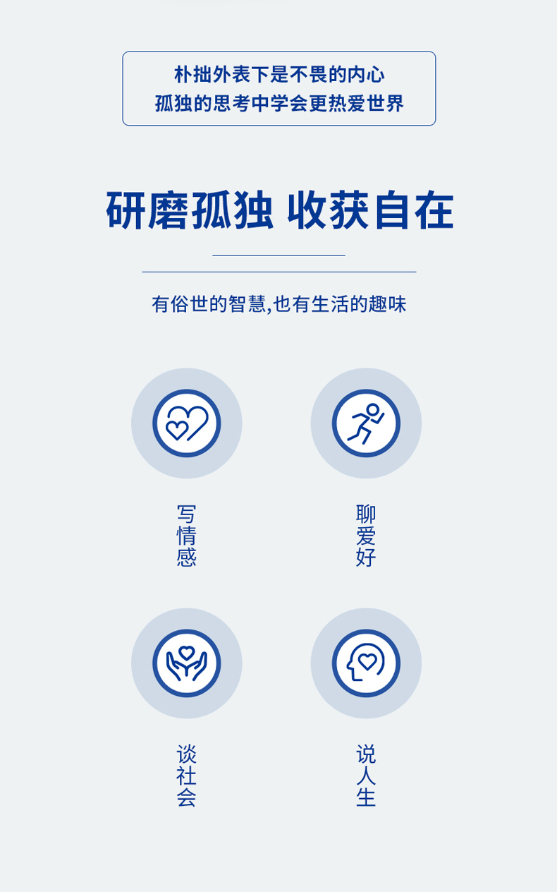 平凹先生素来喜静,最怕有人来敲他的房门。让他觉得自在的,要么就是行走于西北的大地,要么就是隐居在自己的书房。先生其实也喜欢热闹,只是先生的热闹并不是灯火灿烂,而是内心的安宁与独行的自在。这本书写情感、聊爱好、谈社会、说人生。有俗世的智慧,也有生活的趣味。对于匆匆的路人,平凹先生这部文集只是用来附庸风雅的玩物。但这本书却要写给生命的行者。愿他们能懂得孤独的真义,在生活里多一些从容潇洒。