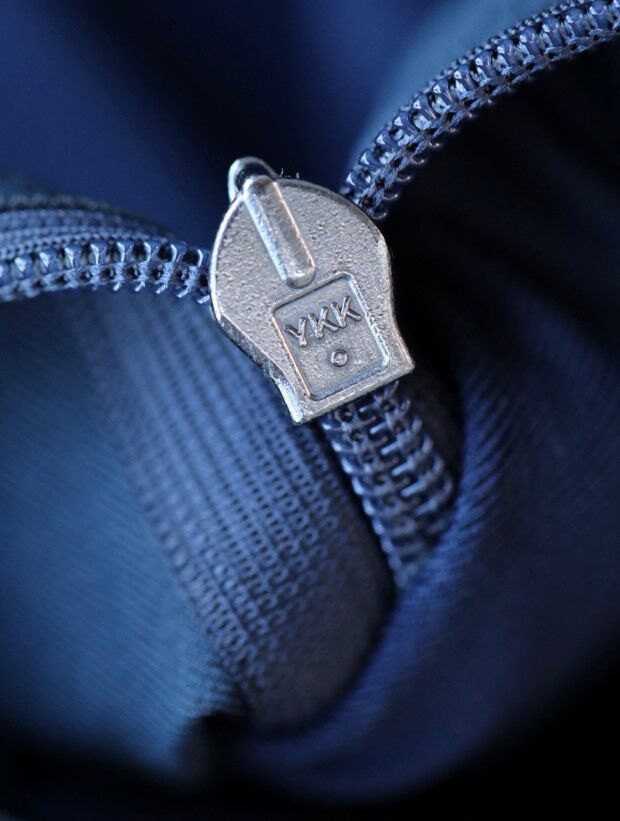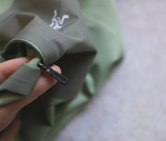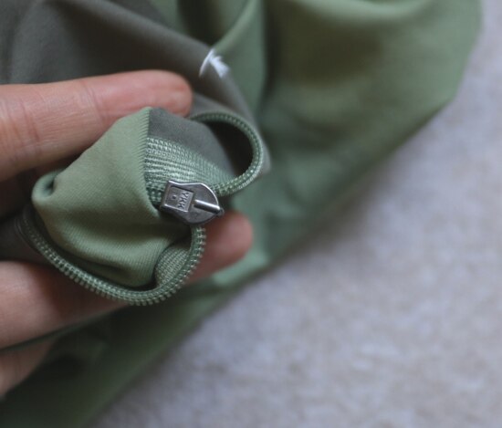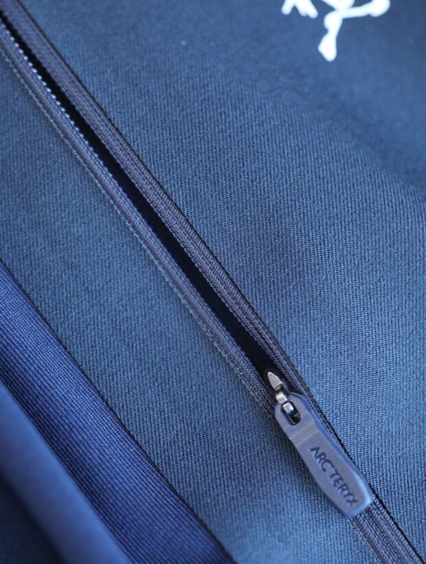 小圆领口 后领口压胶工艺 左侧拉链小口袋 也是热熔压胶的
