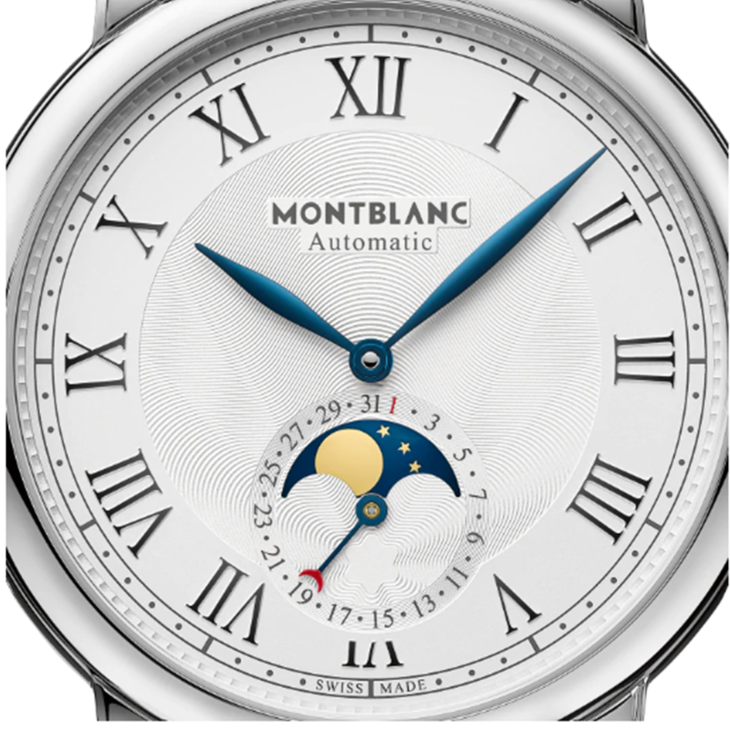 镜面 材质 | 穹形蓝宝石水晶玻璃表镜,防反射涂层 | 表盘 | 精钢表壳 银白色表盘,黑色罗马数字时标 蓝色指针,小时, 分钟, 指针式日历显示, 月相盈亏 |