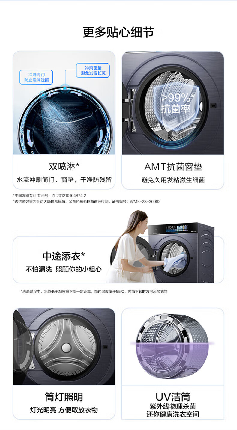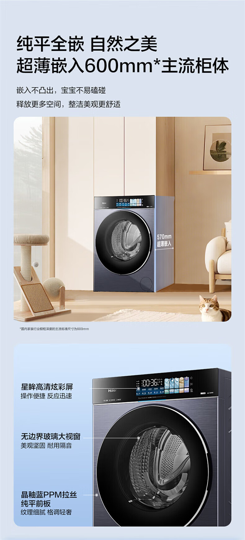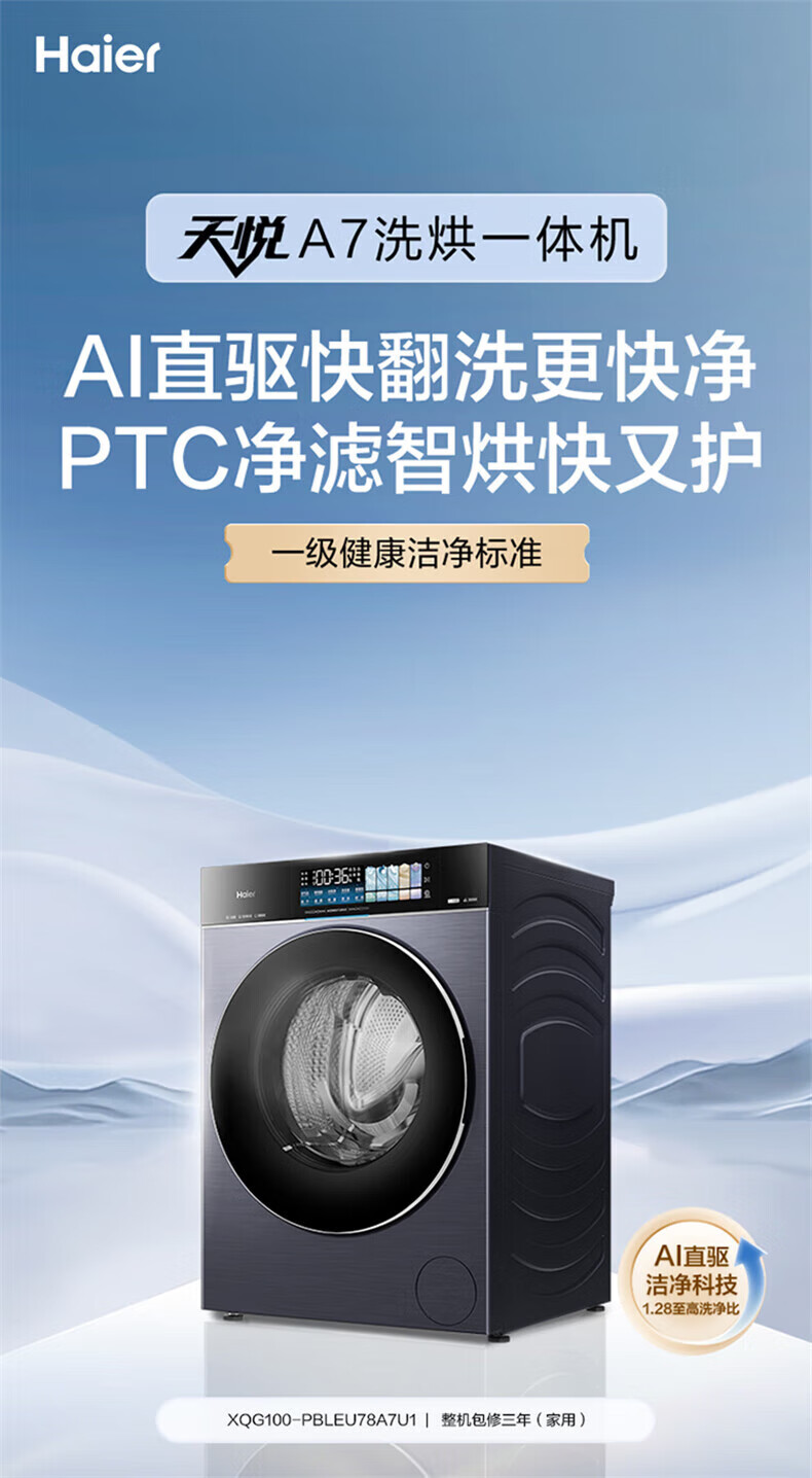 海尔(Haier)重磅新品天悦A7洗烘一体滚筒洗衣机 洗净比1.28 彩屏超薄纯平全嵌AI智能投放除菌 10KG 【25旗舰款】PBLEU78A7U1晶釉蓝洗烘一体