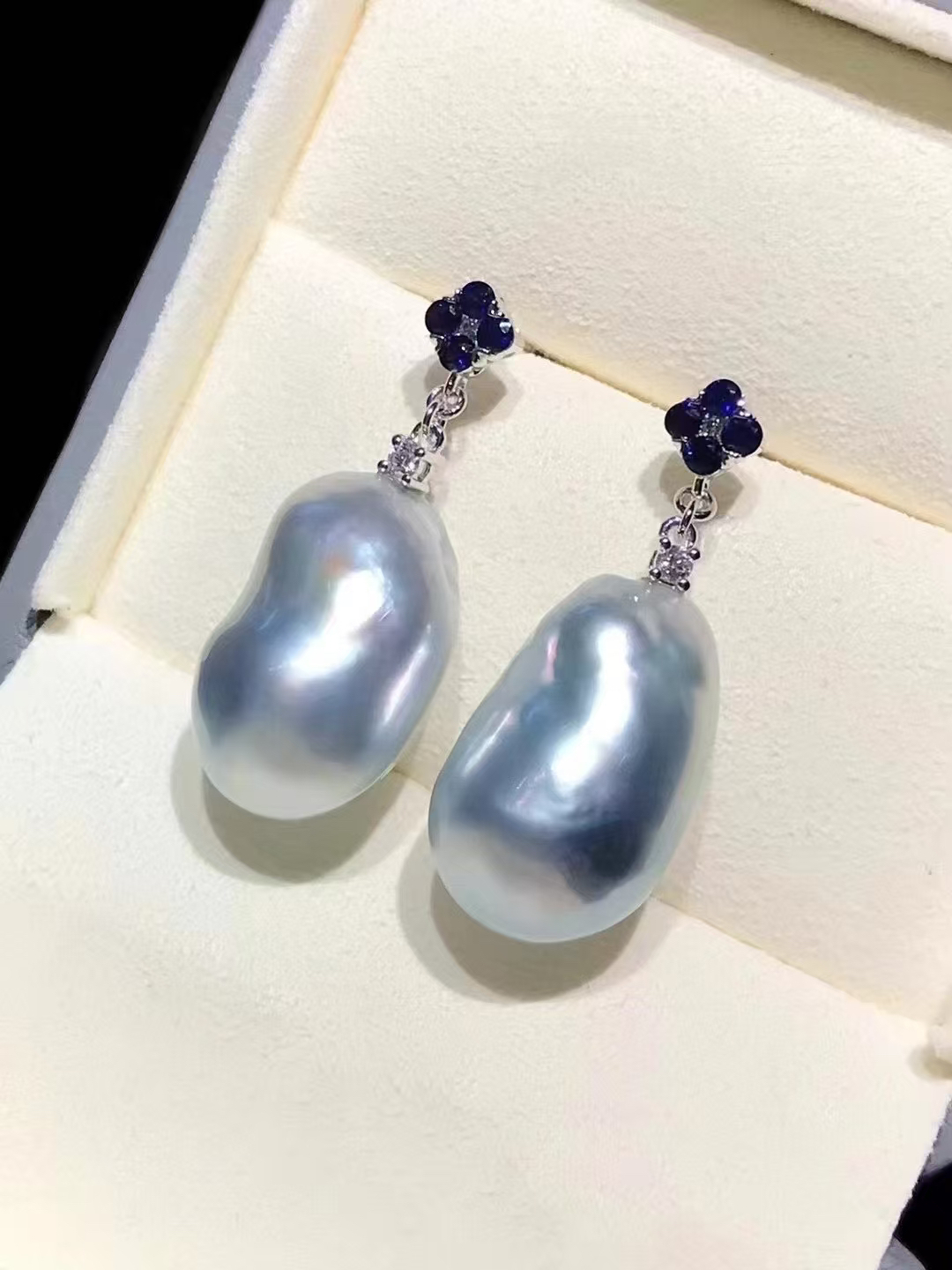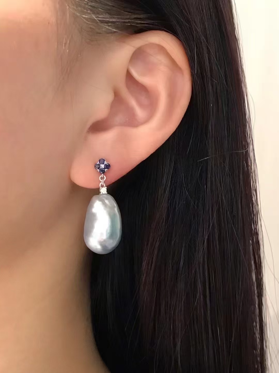 【私席真珠·新年盛宴】18K金镶钻/蓝宝南洋白珍珠耳针,13-14mm巴洛克(孤品)