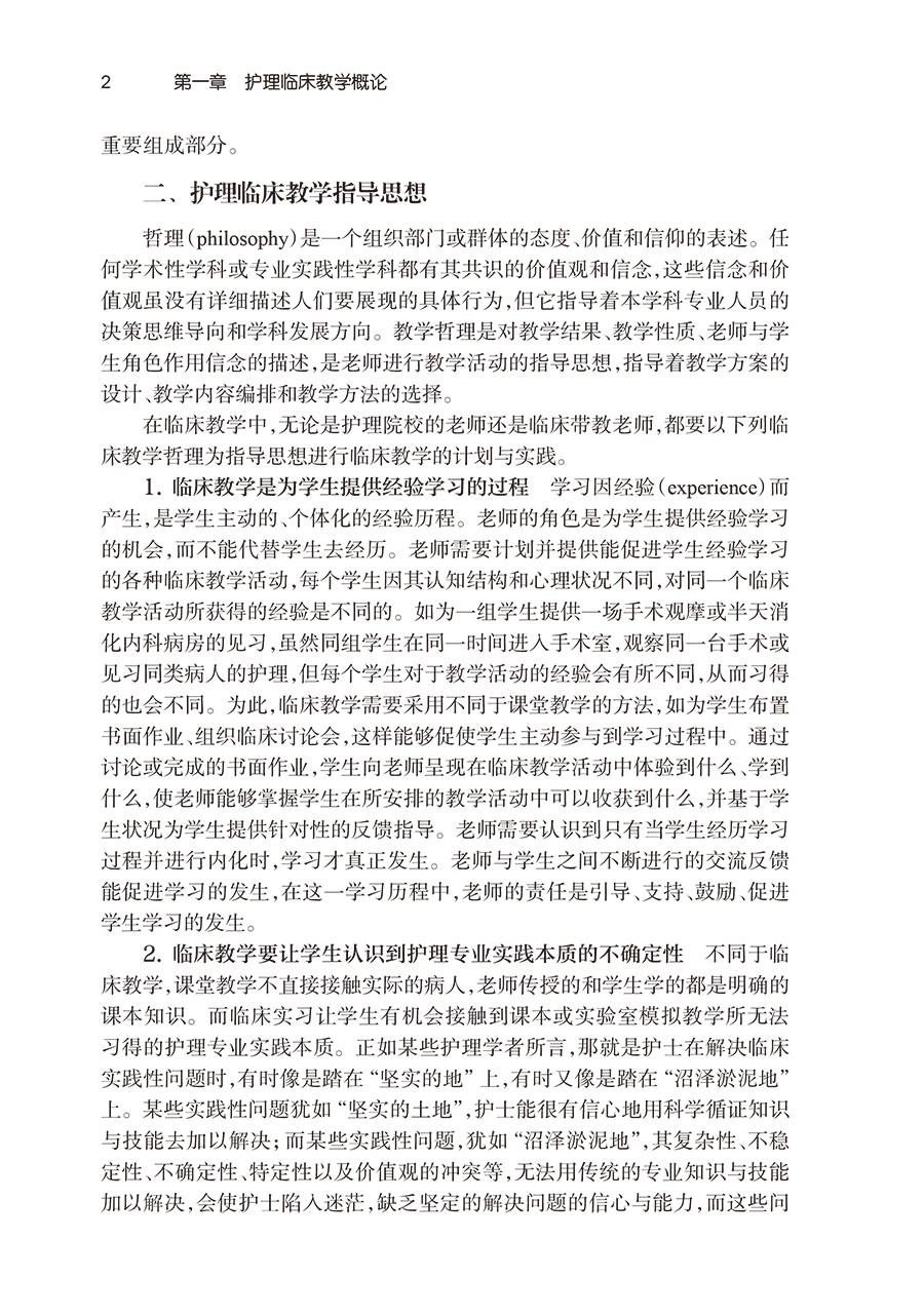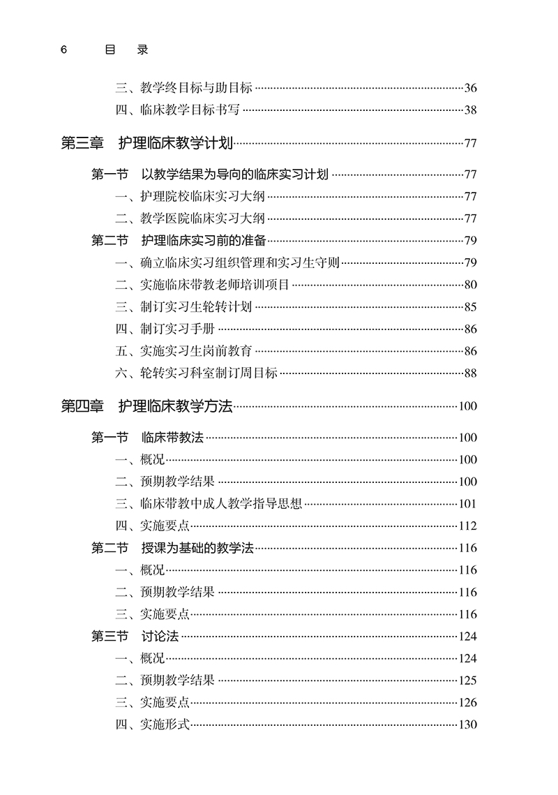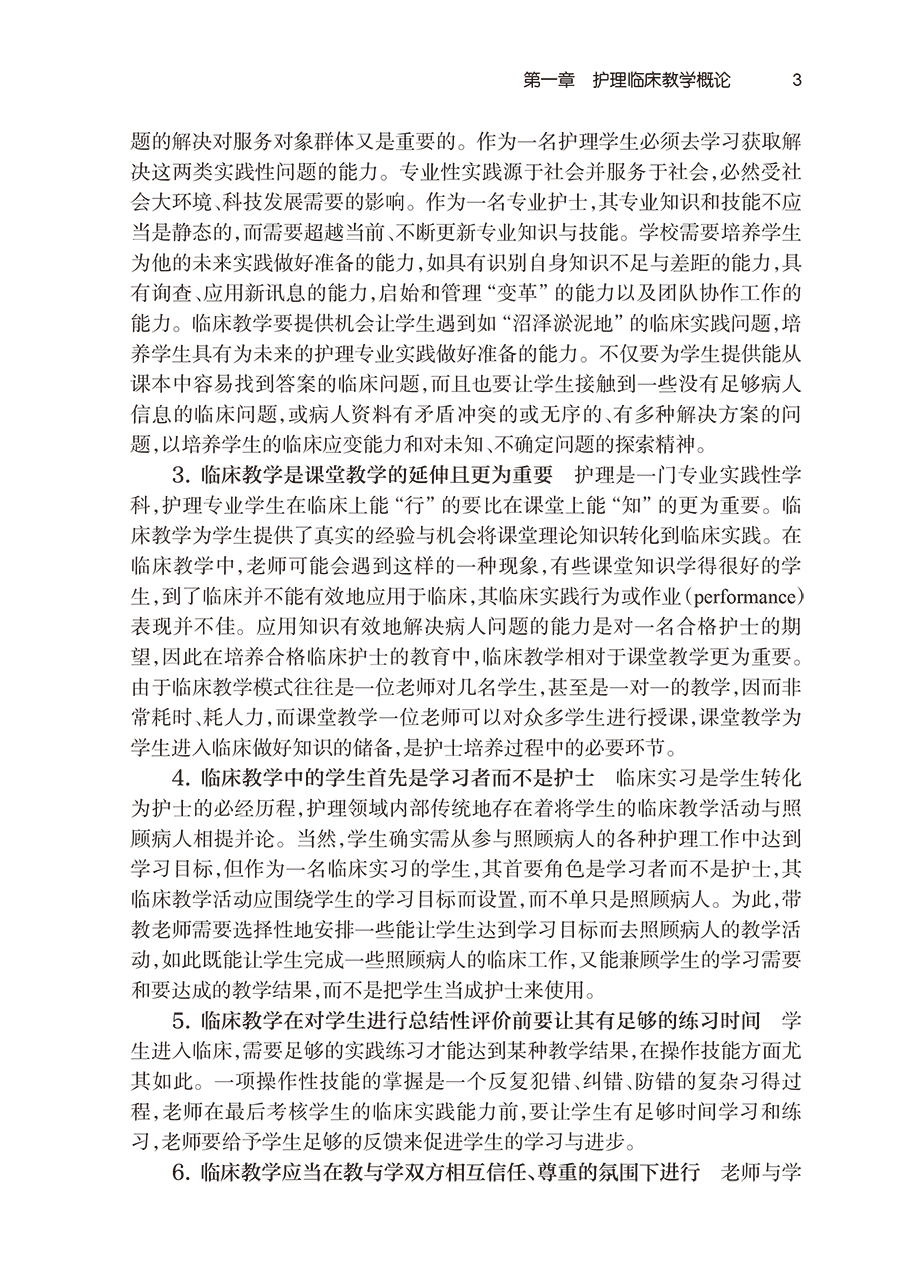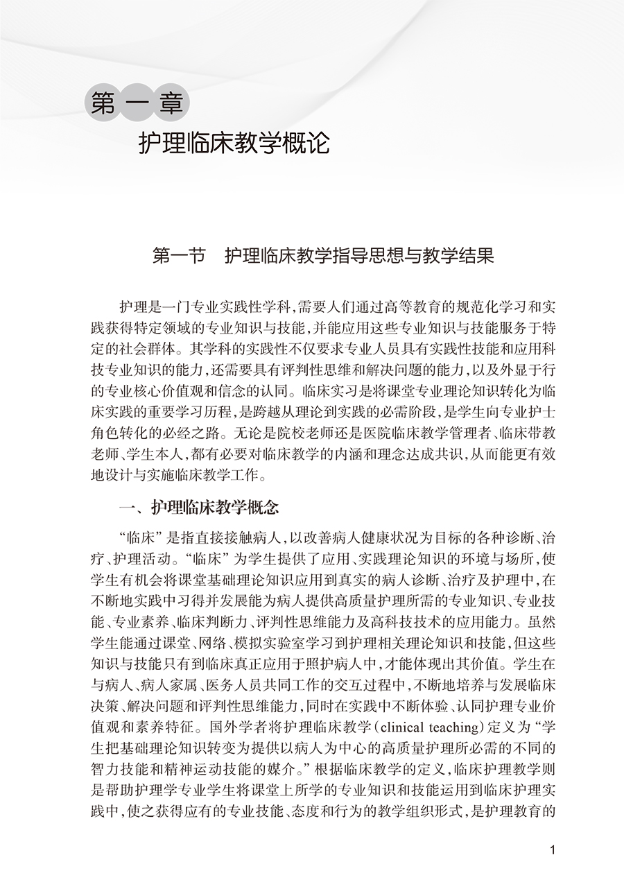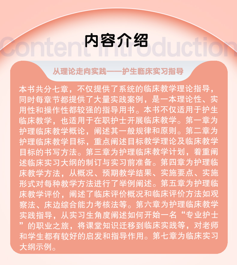 本书共分七章,不仅提供了系统的临床教学理论指导,同时每章节都提供了大量实践案例,是一本理论性、实用性和操作性都较强的指导用书。本书不仅适用于护生临床教学,也适用于在职护士开展临床教学。第一章为护理临床教学概论,阐述其一般规律和原则。第二章为护理临床教学目标,重点阐述目标教学理论及临床教学目标的书写方法。第三章为护理临床教学计划,着重阐述临床实习大纲的制订与实习前准备。第四章为护理临床教学方法,从概况、预期教学结果、实施要点、实施形式对每种教学方法进行了举例阐述。第五章为护理临床教学评价,阐述了临床评价概况和临床评价方法如观察法、床边综合能力考核法等。第六章为护理临床教学实践指导,从实习生角度阐述如何开始一名“专业护士”的职业之旅,将课堂知识迁移到临床实践等,对老师和学生都有较好的启发和指导作用。第七章为临床实习大纲示例。