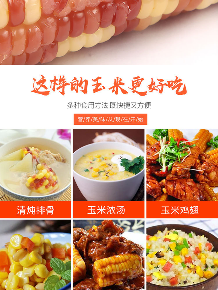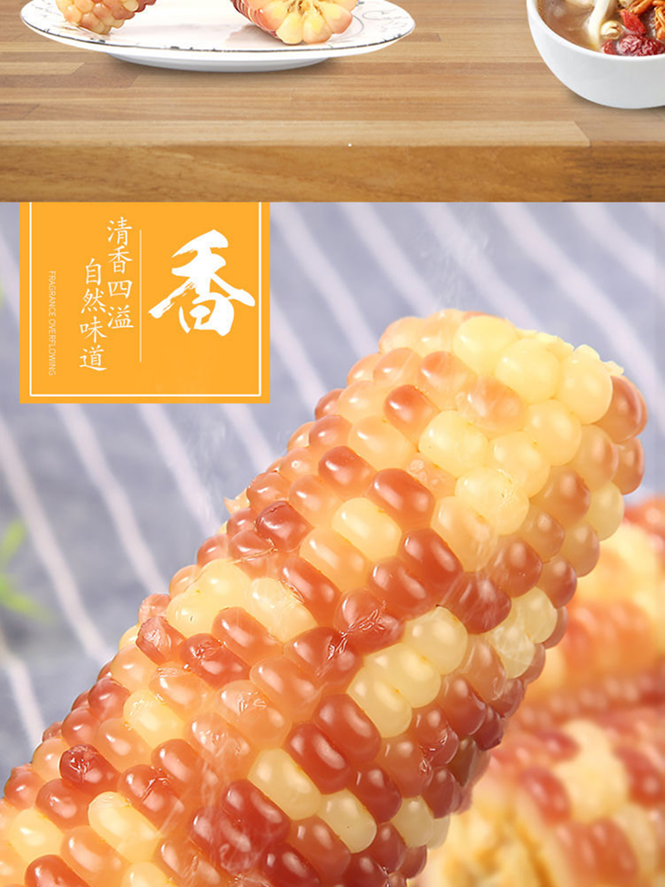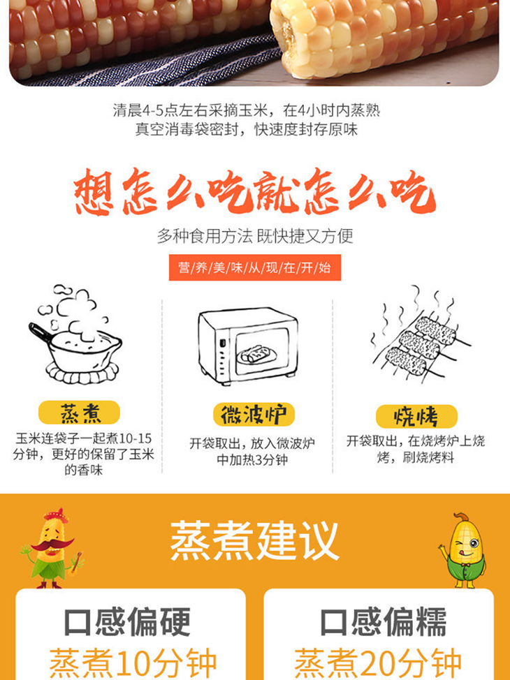 【温馨提示】开袋取出,放入蒸锅中蒸8-10分钟左右,待玉米冷却到适宜温度,即可食用