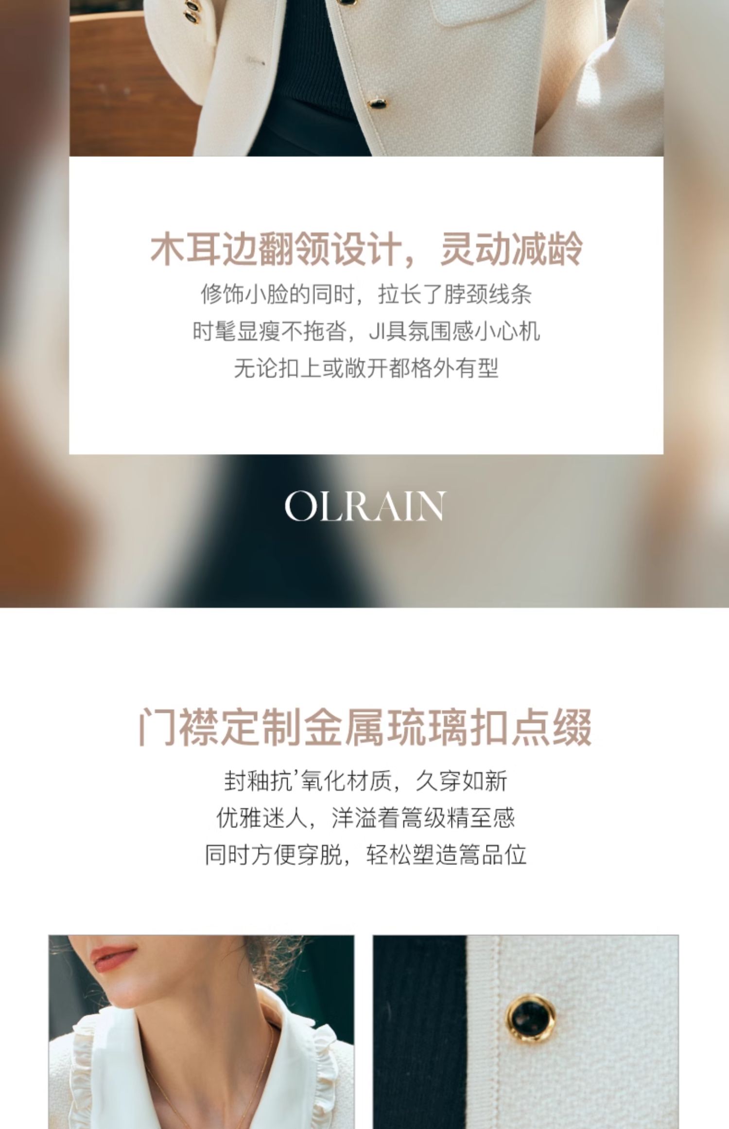 - “精致”是欧芮儿olrain品牌文化的核心,欧芮儿认为,精致的女人,不但要外在动人,更要内在迷人,内外兼修,有魅力、有气质、有内涵,自信而不自傲,优雅而不矫揉,自有万种风情而不轻浮,更不故作矜持。