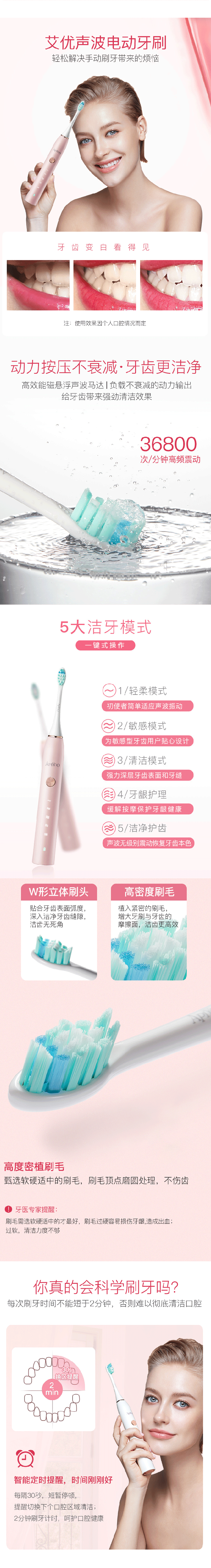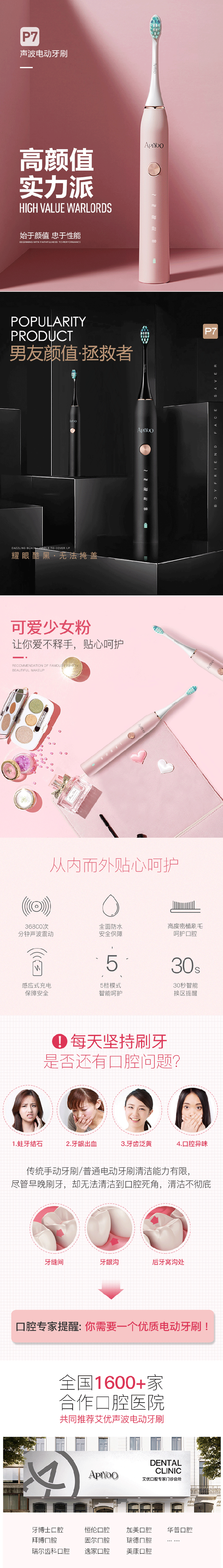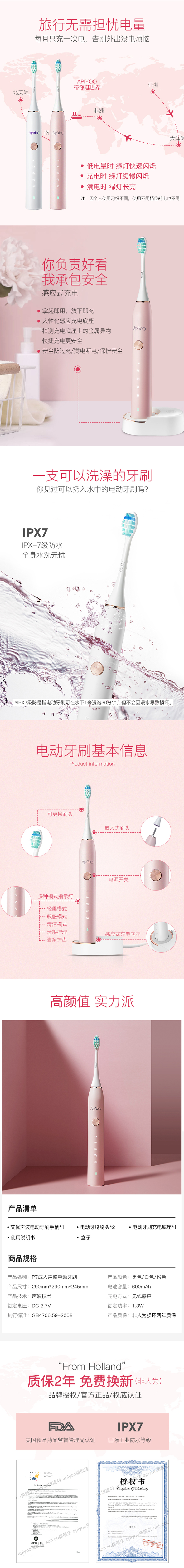 艾优(ApiYoo)电动牙刷 P7系列成人声波充电式牙刷 智能震动情侣防水牙刷 P7皓齿白