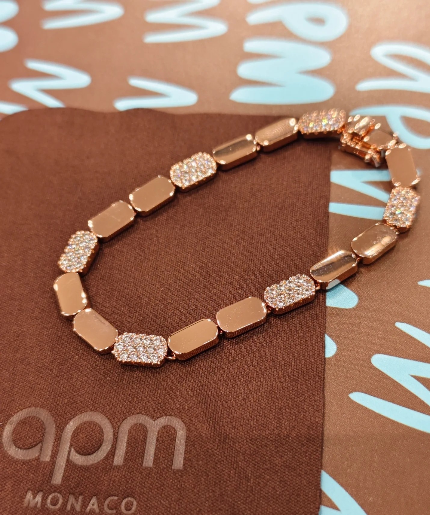 手链设计了几何图形,间隔整片镶钻,很有艺术美感!优雅随性!金色和银色巧妙融合,相互辉映,摩登大气!