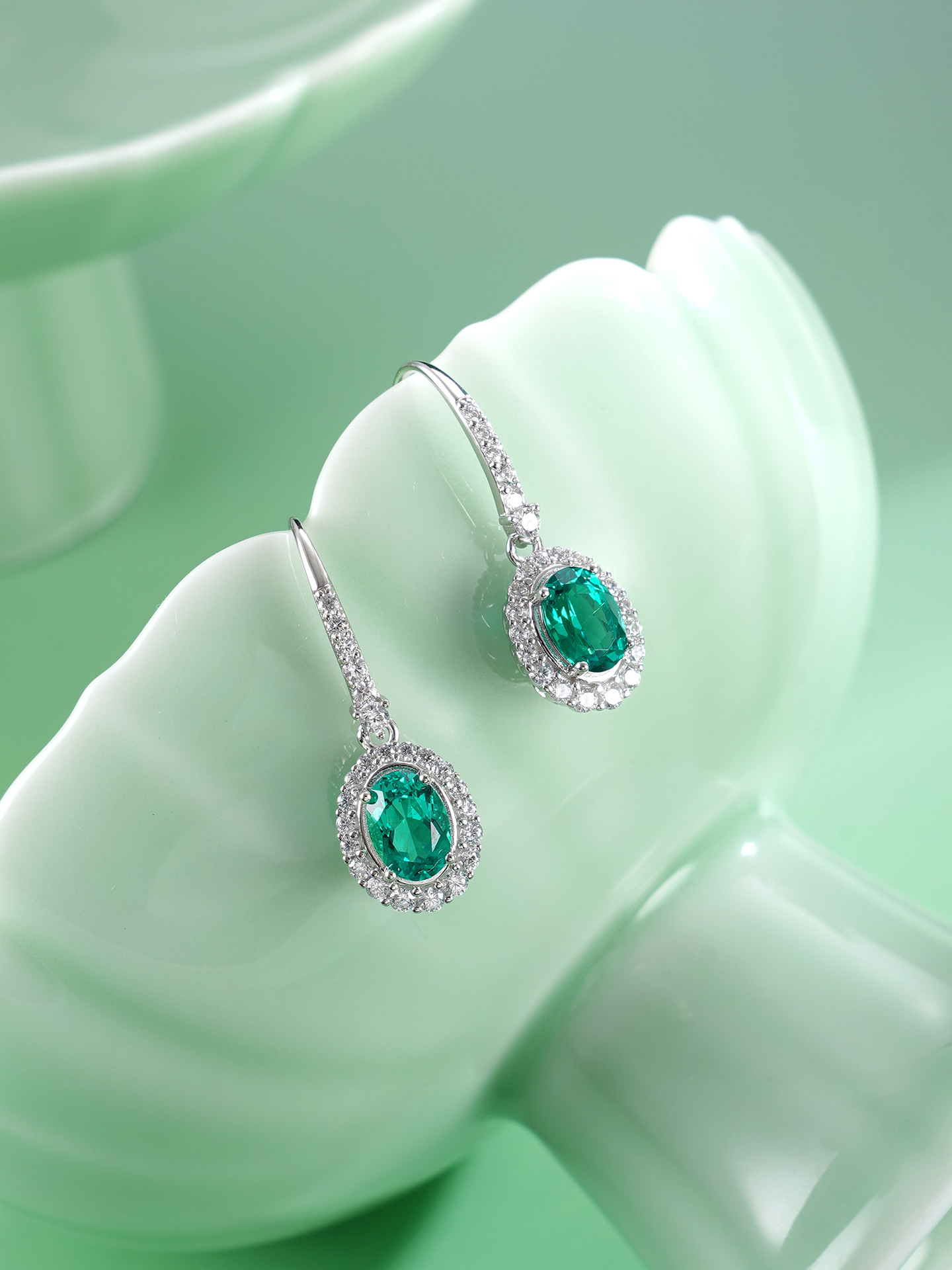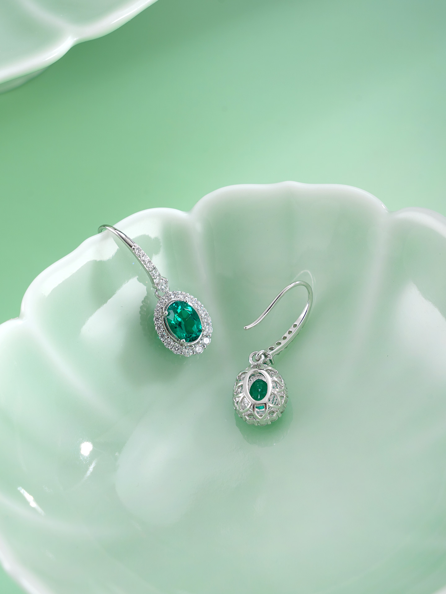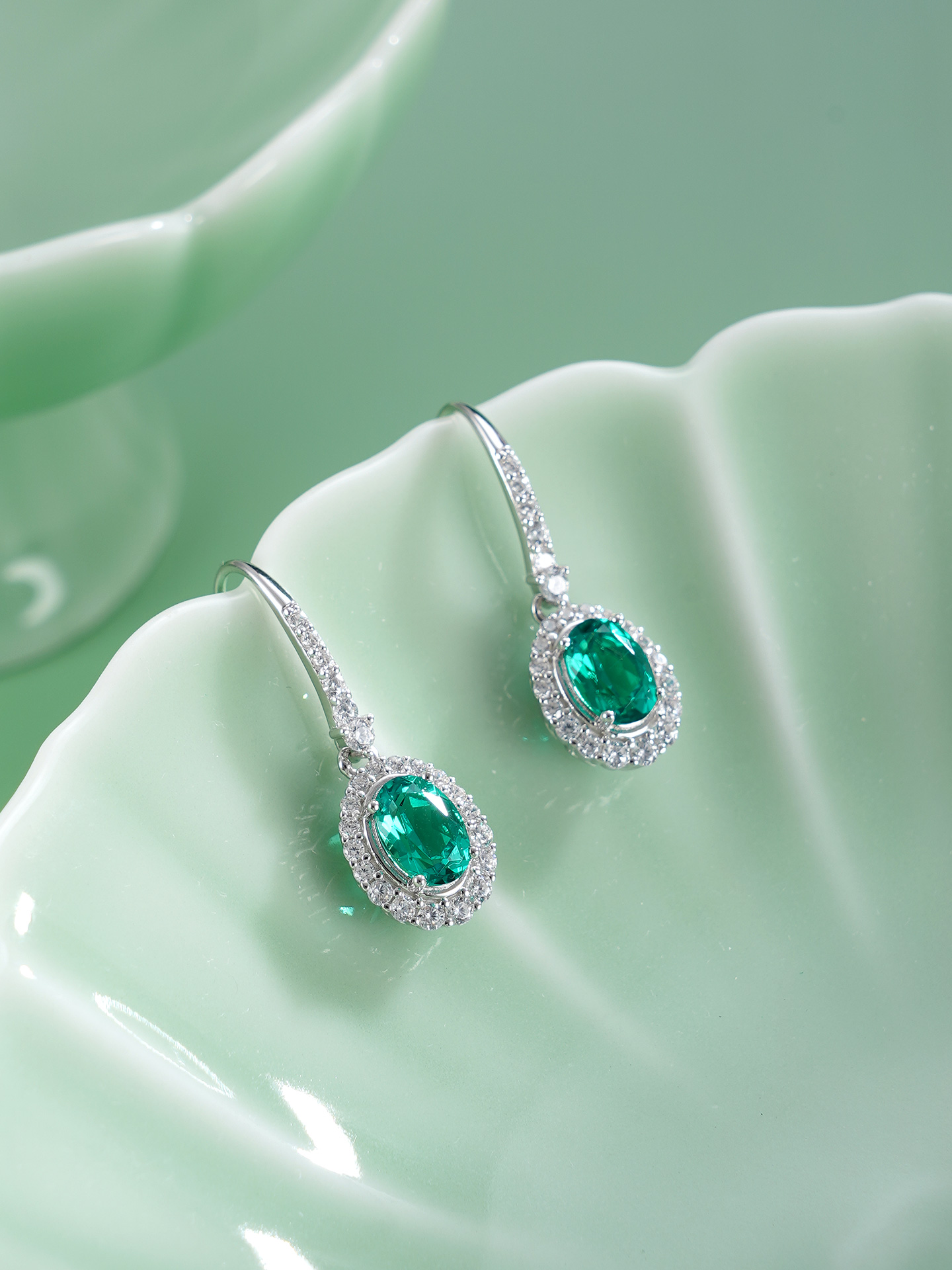 子佩集【翠御玲珑】S925银耳环【EM3085-1-XF】培育宝石祖母绿椭圆耳钩2510