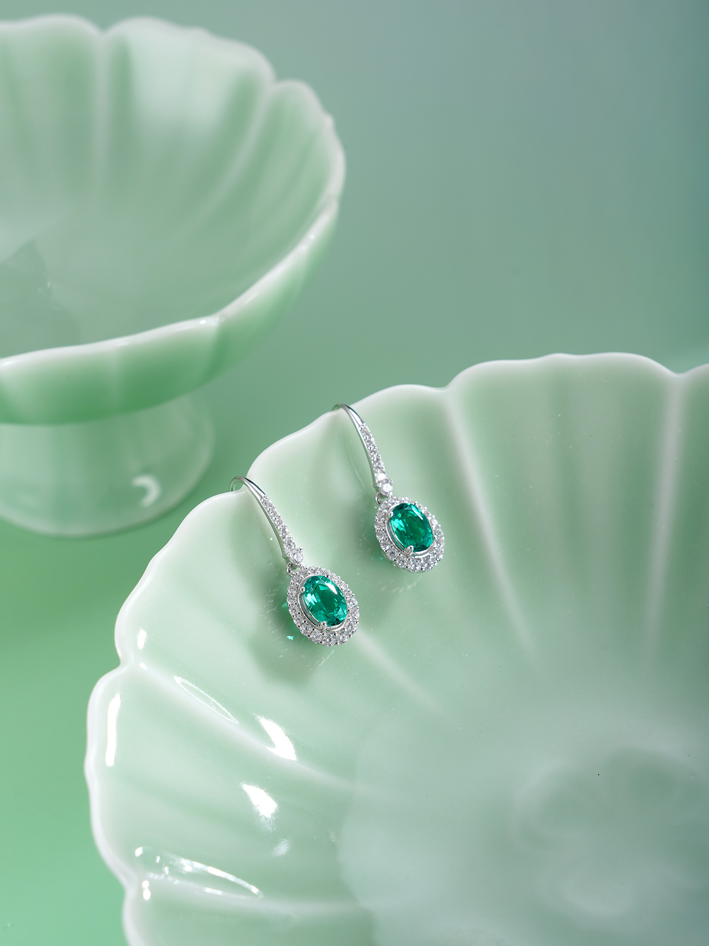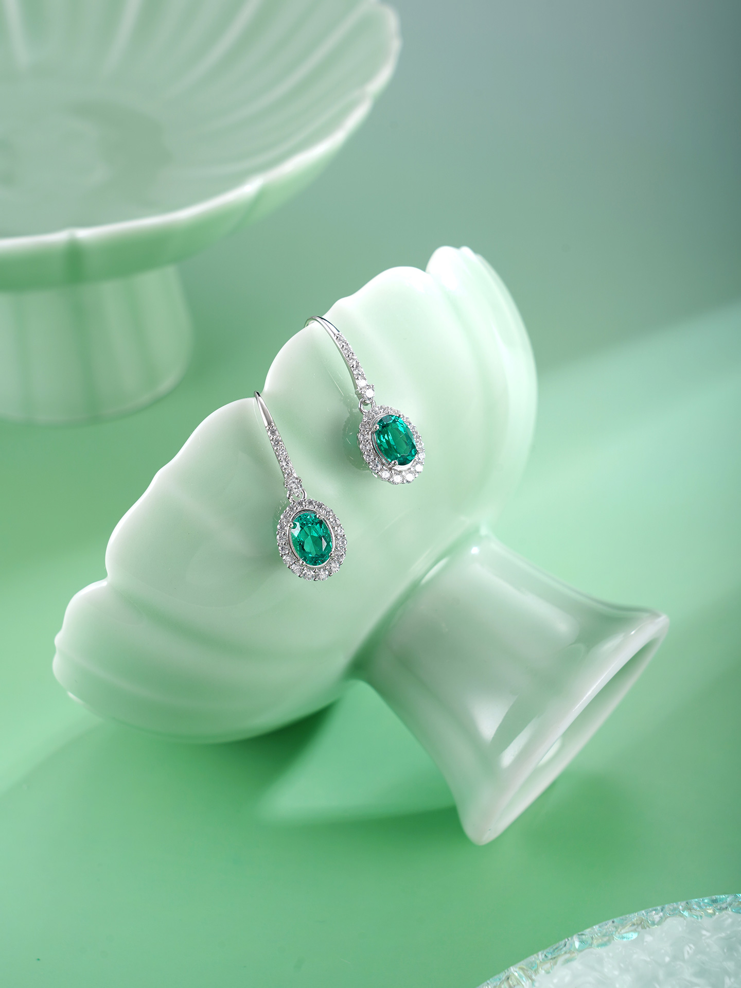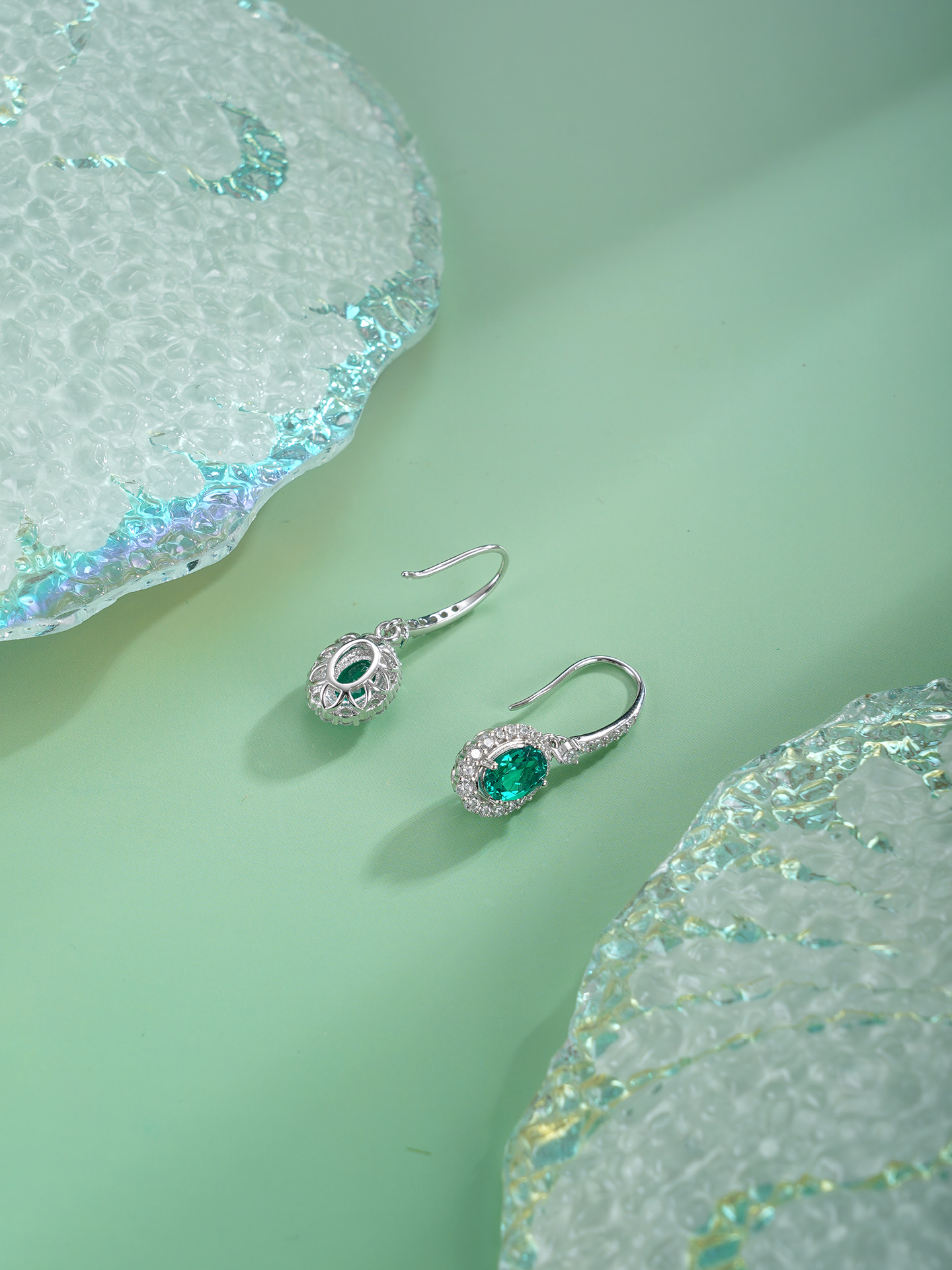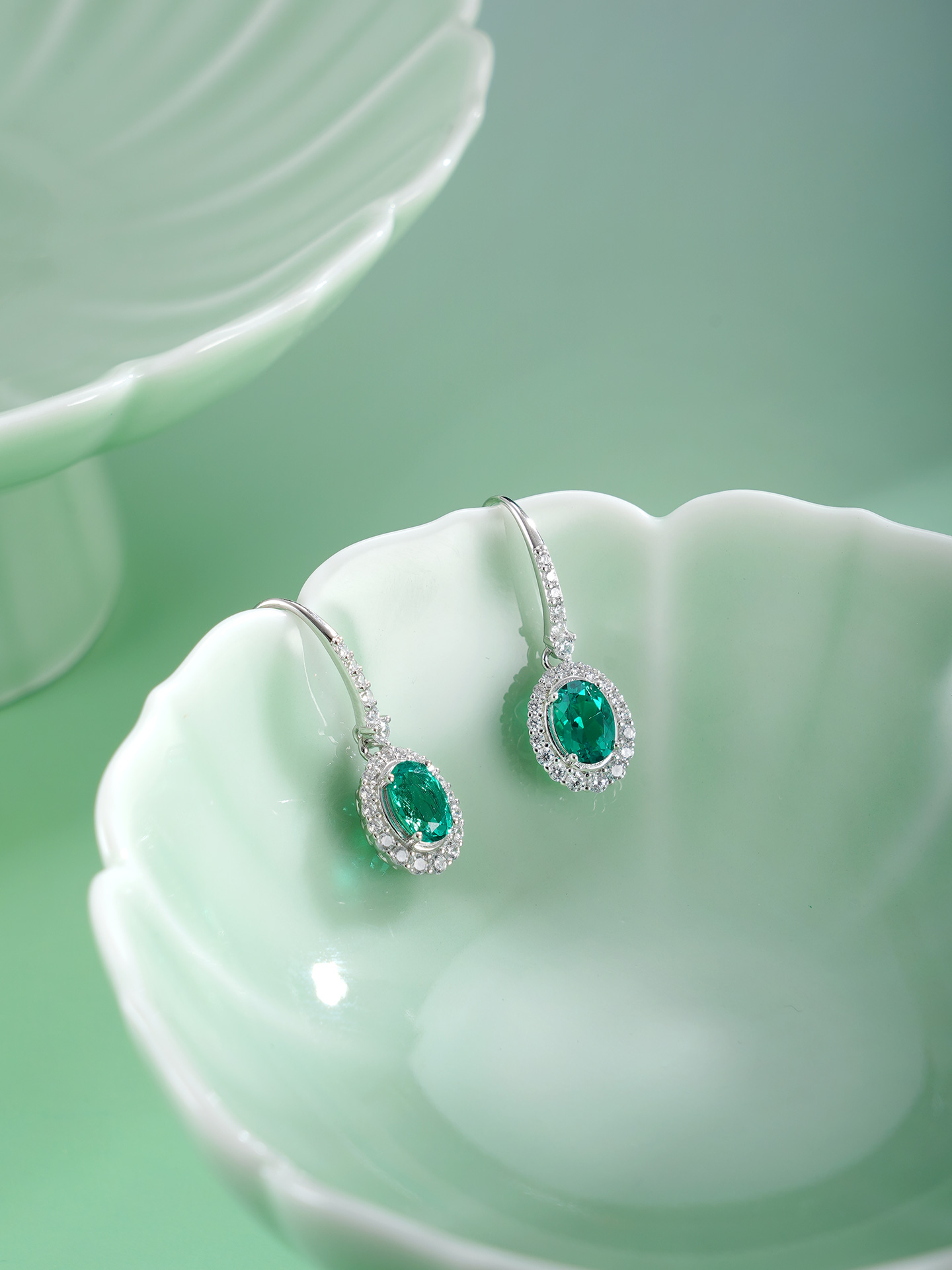 子佩集【翠御玲珑】S925银耳环【EM3085-1-XF】培育宝石祖母绿椭圆耳钩2510