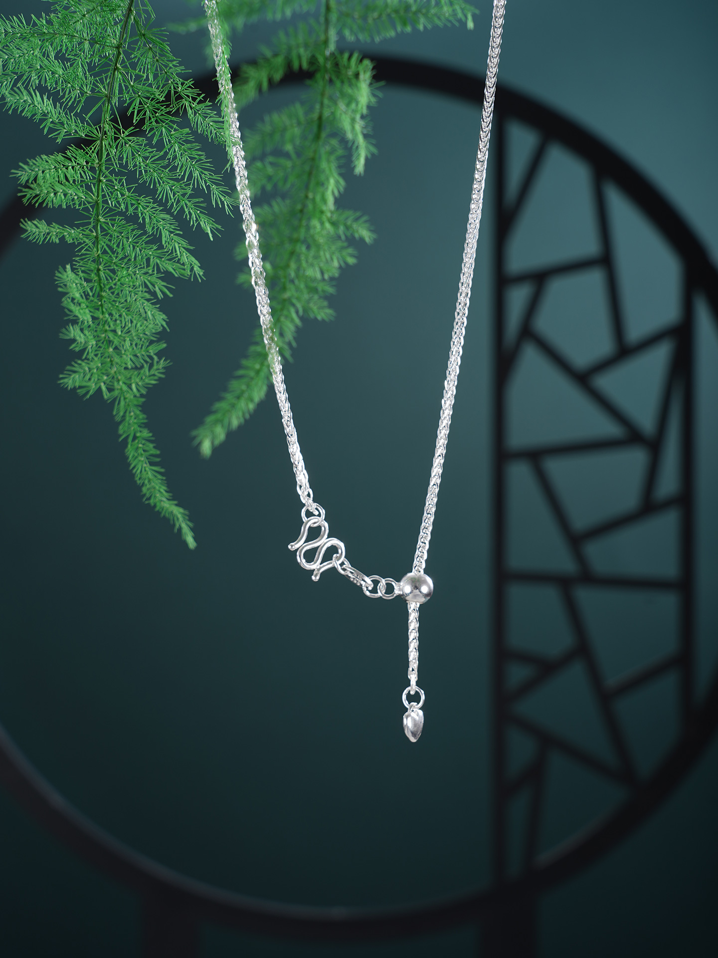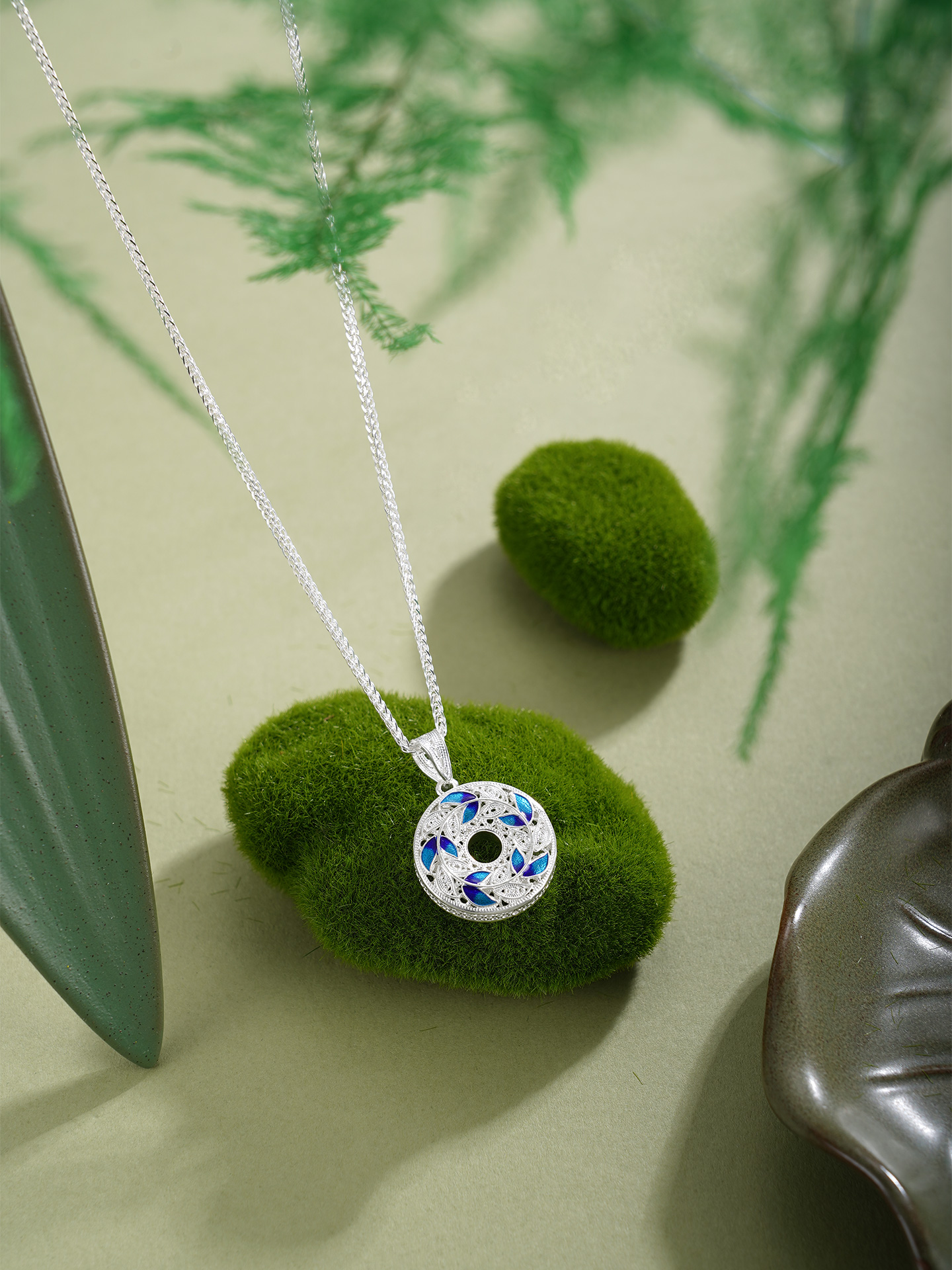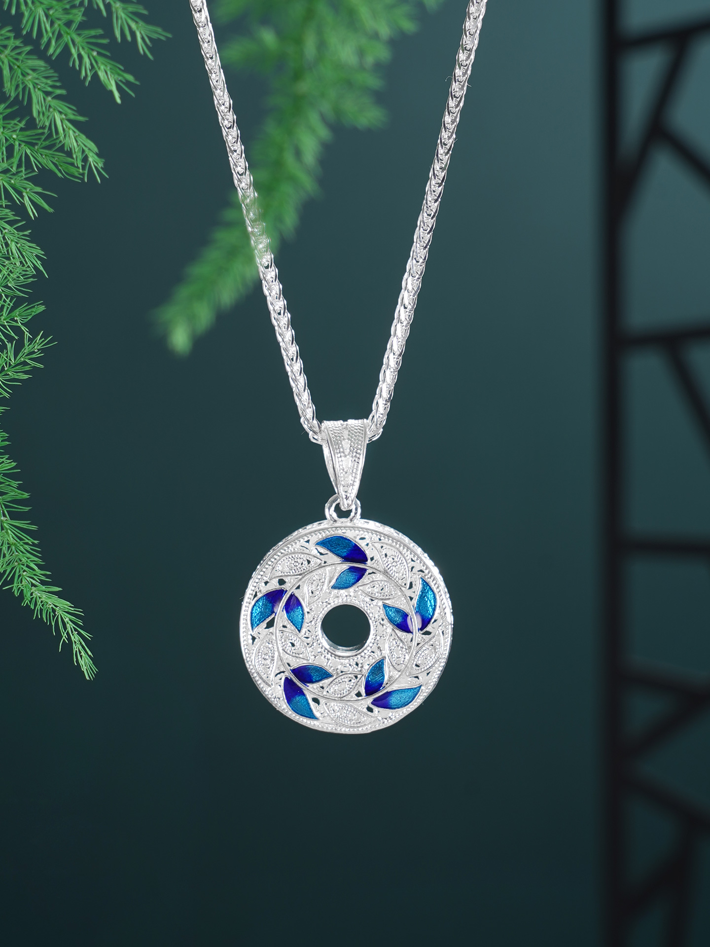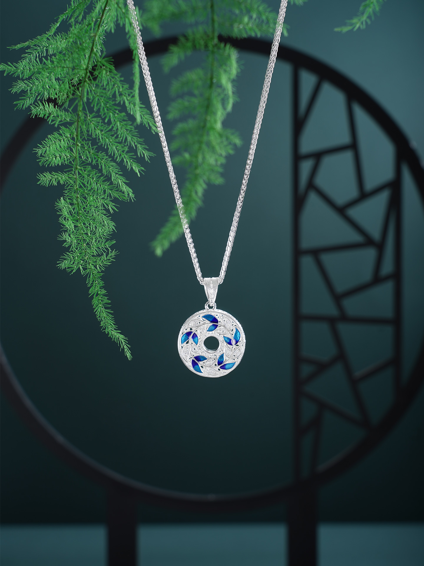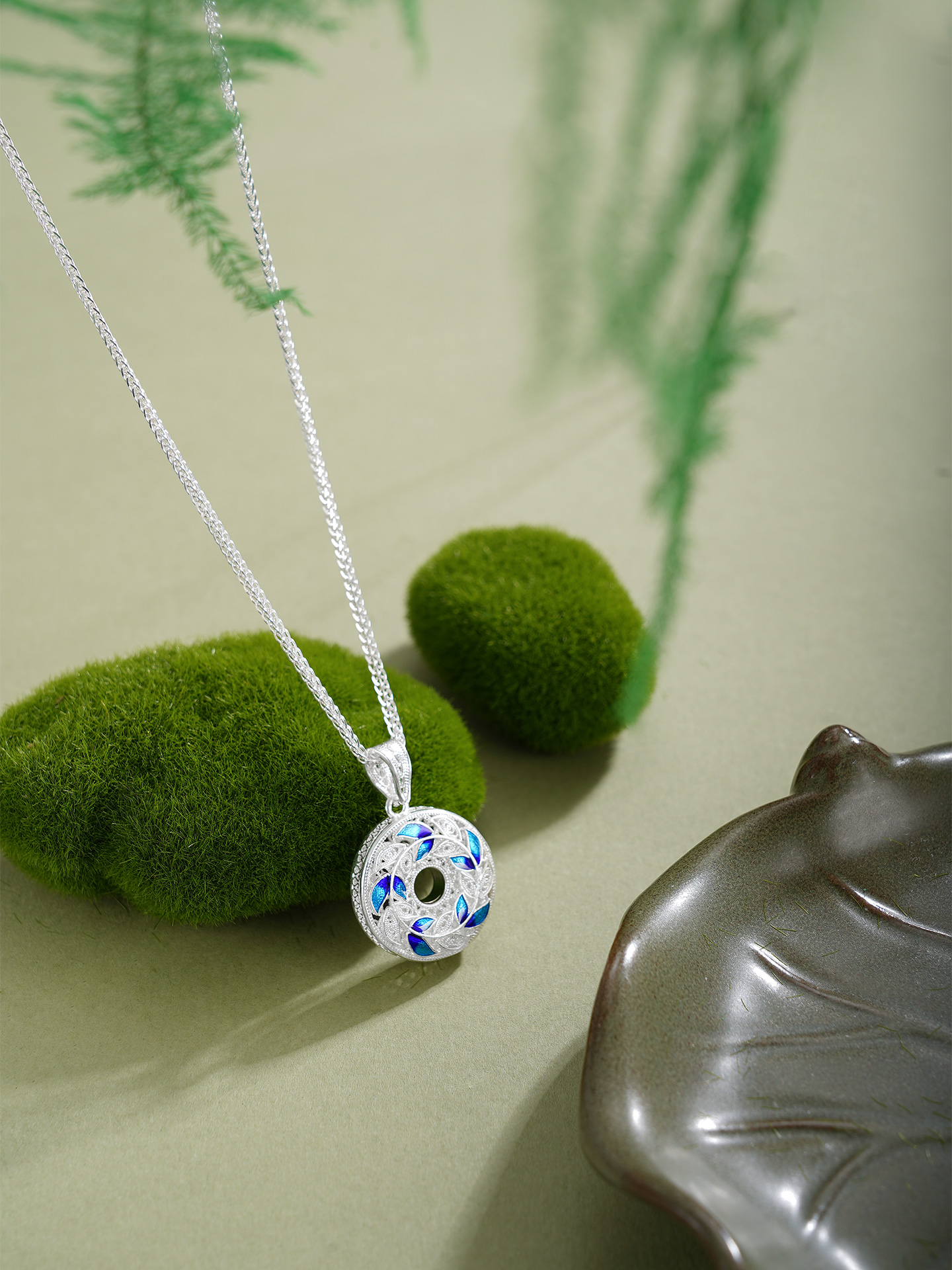 【寓意】:银花丝平安扣吊坠,其上饰以树叶纹样,叶子卷曲成环,光辉流转,象征一叶生财,财富生生不息。