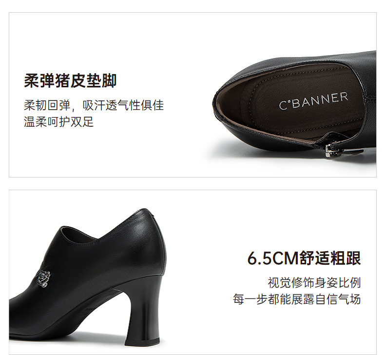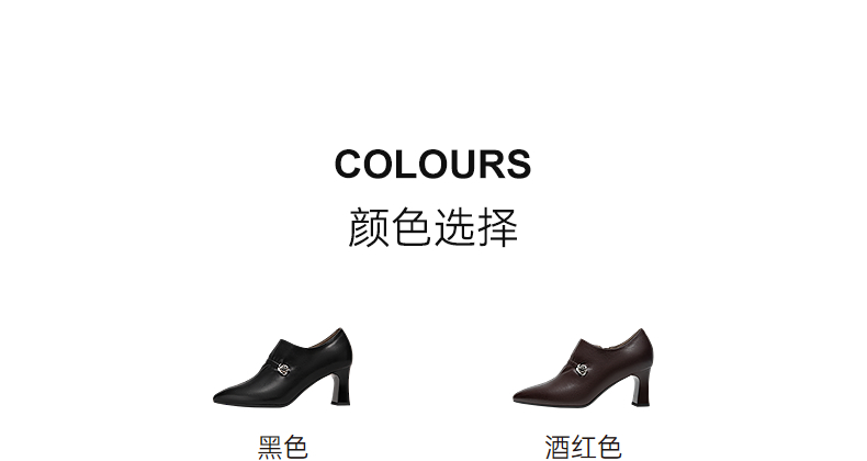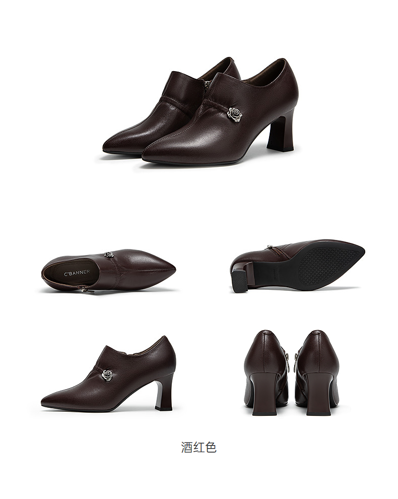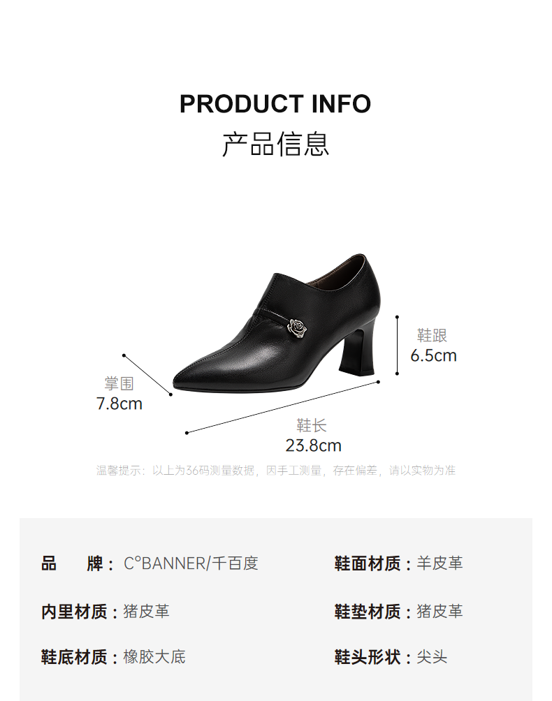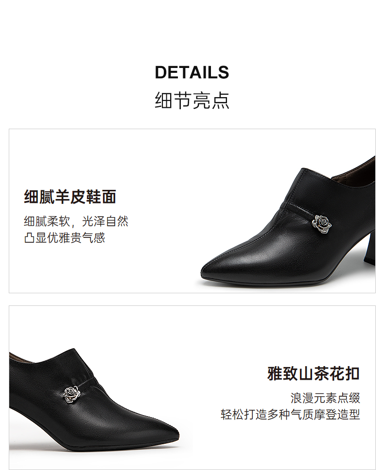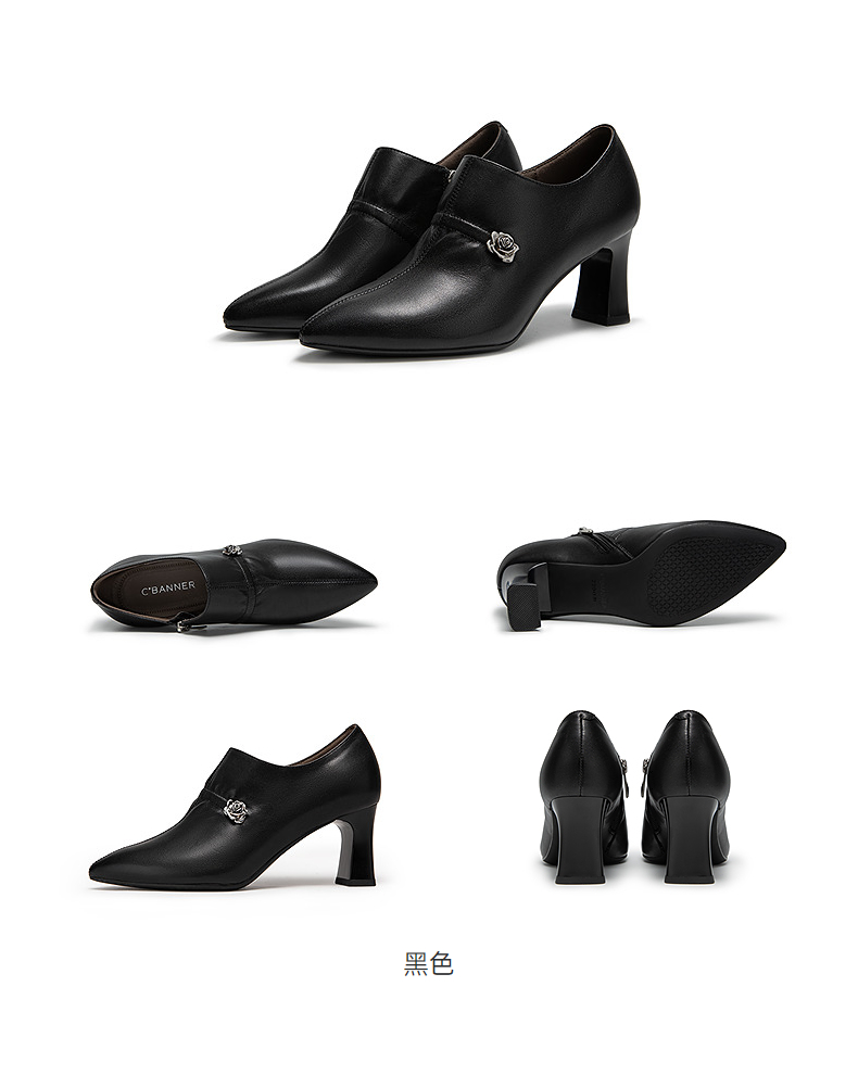 千百度羊皮深口单鞋通勤法式粗高跟鞋尖头小踝靴A25122805