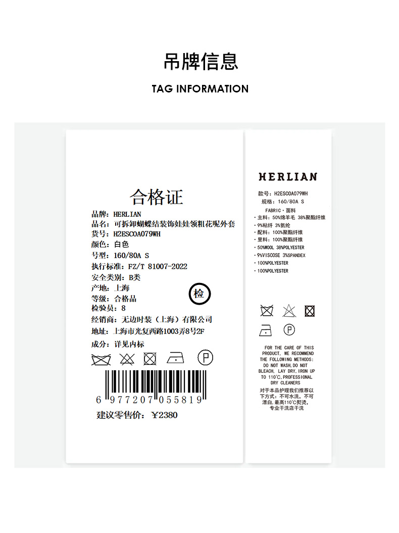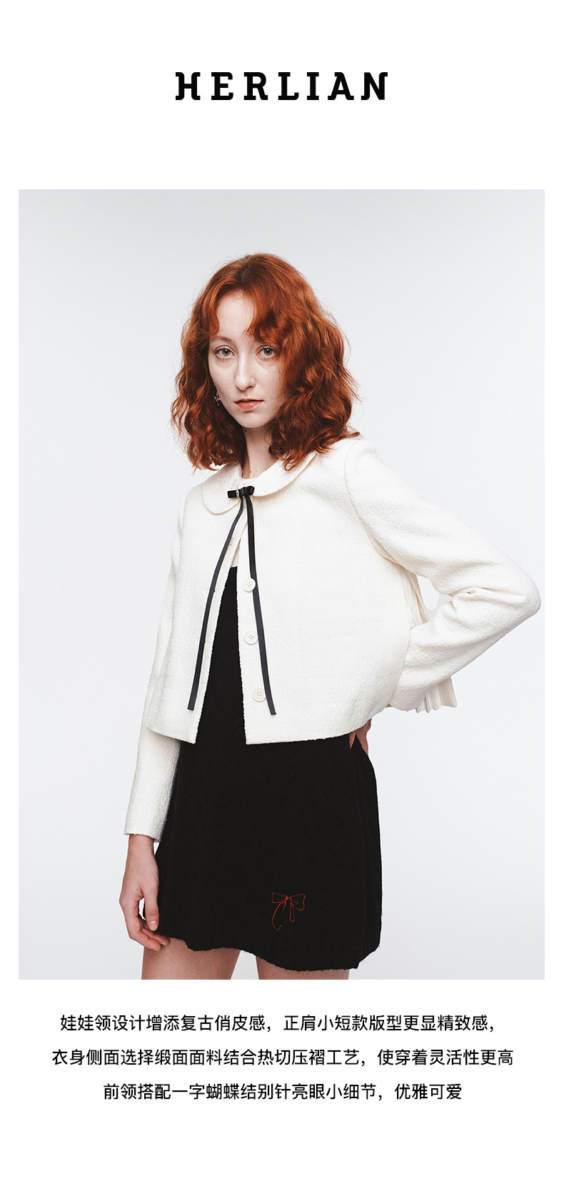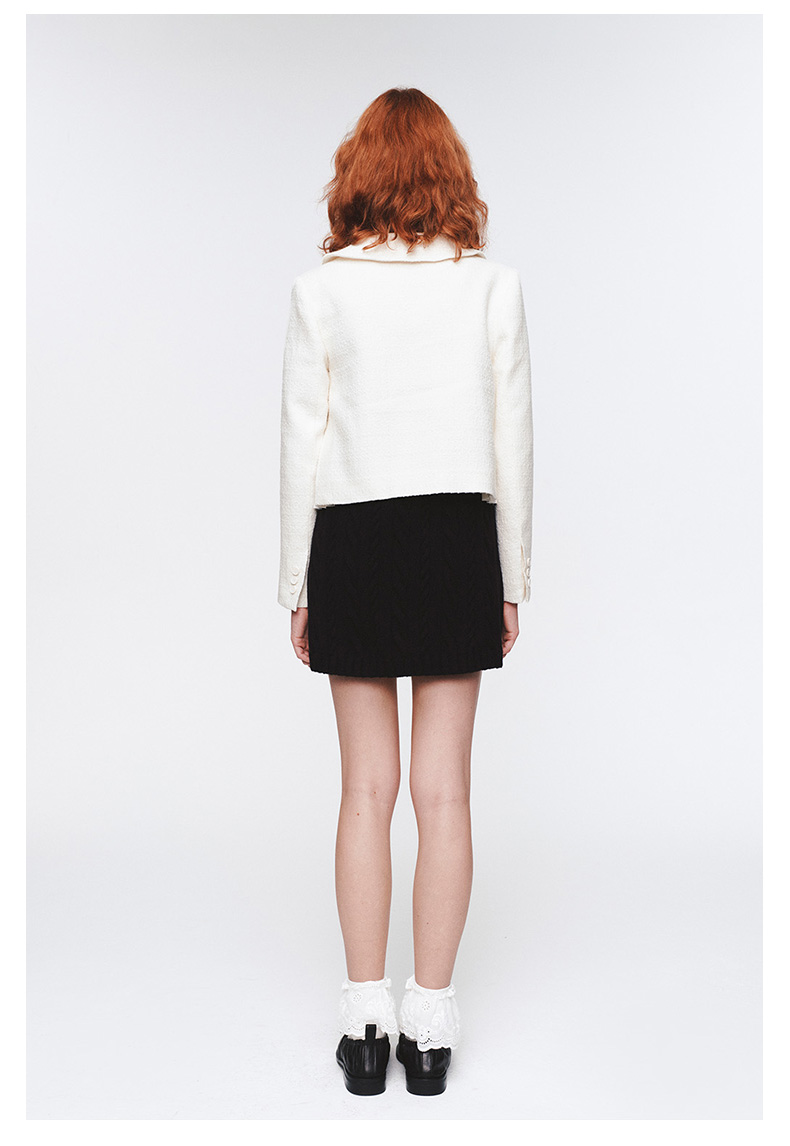 H2ESCOA079WH可拆卸蝴蝶结装饰娃娃领粗花呢外套
