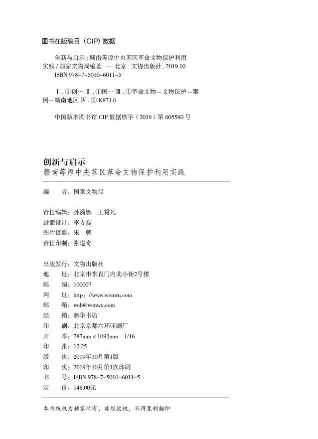 本书对赣南地区各市、县的革命文物遗迹的保存状况、保护情况及开发利用等进行了介绍。全书分为四个部分,分别为综述篇、模式篇、经验篇和附录。模式篇中全面总结了赣南地区革命文物遗迹的价值及资源分布状况、保护利用背景、保护理念及做法等。模式篇将赣南地区革命文物遗迹的保护经验总结为瑞金、宁都、金溪、青原四种模式。经验篇以行政区划为单位,分地区介绍了当地革命文物遗迹的保护状况、保护方法和亮点经验,并配以遗迹修复前后对比照片和保护利用的现场活动照片等。附录中则对江西省红色标语的保护状况作了简要介绍。本书从实际工作出发,配合第一手资料,为全国革命文物遗迹的保护提供了参考。
