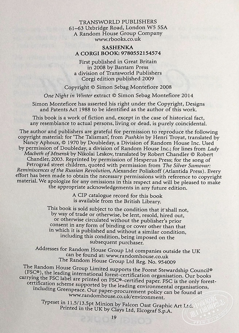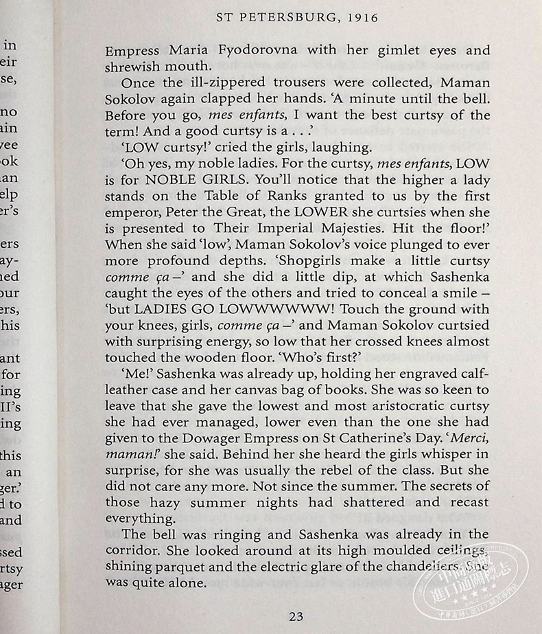 Winter, 1916. In St Petersburg, snow is falling in a country on the brink of revolution. Beautiful and headstrong, Sashenka Zeitlin is just sixteen. As her mother parties with Rasputin and her dissolute friends, Sashenka slips into the frozen night to play her role in a dangerous game of conspiracy and seduction.