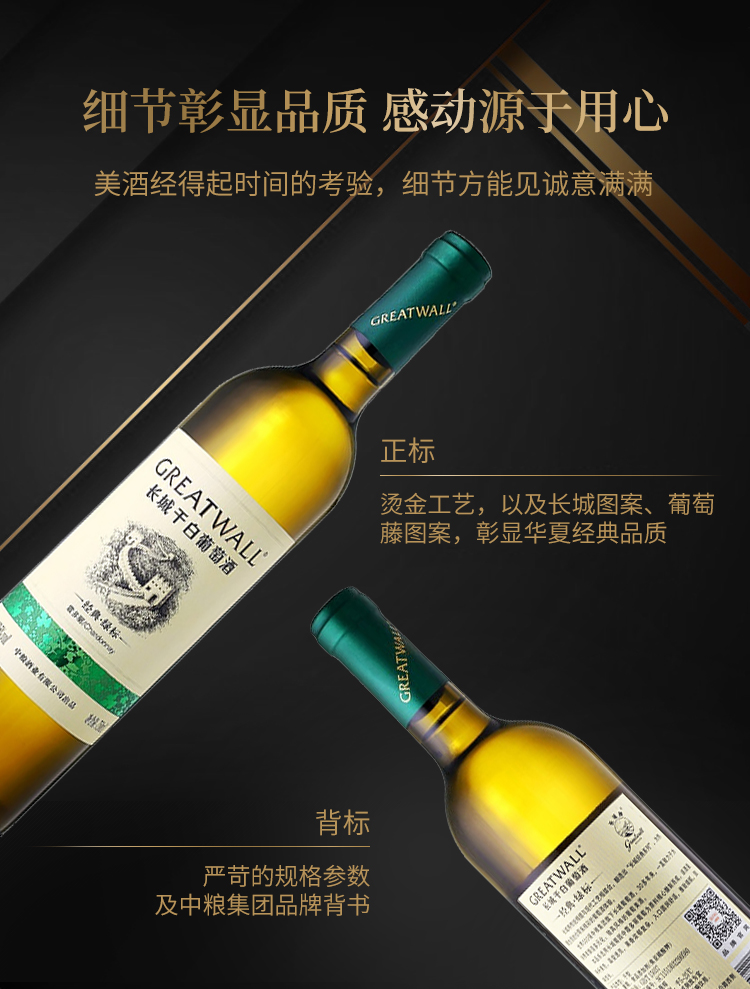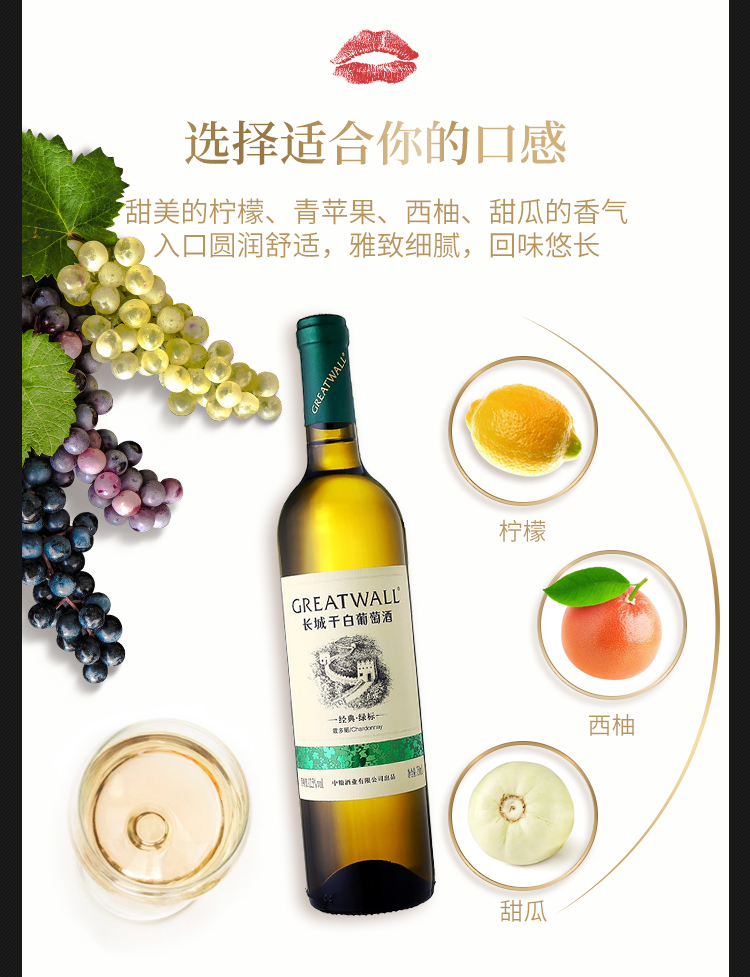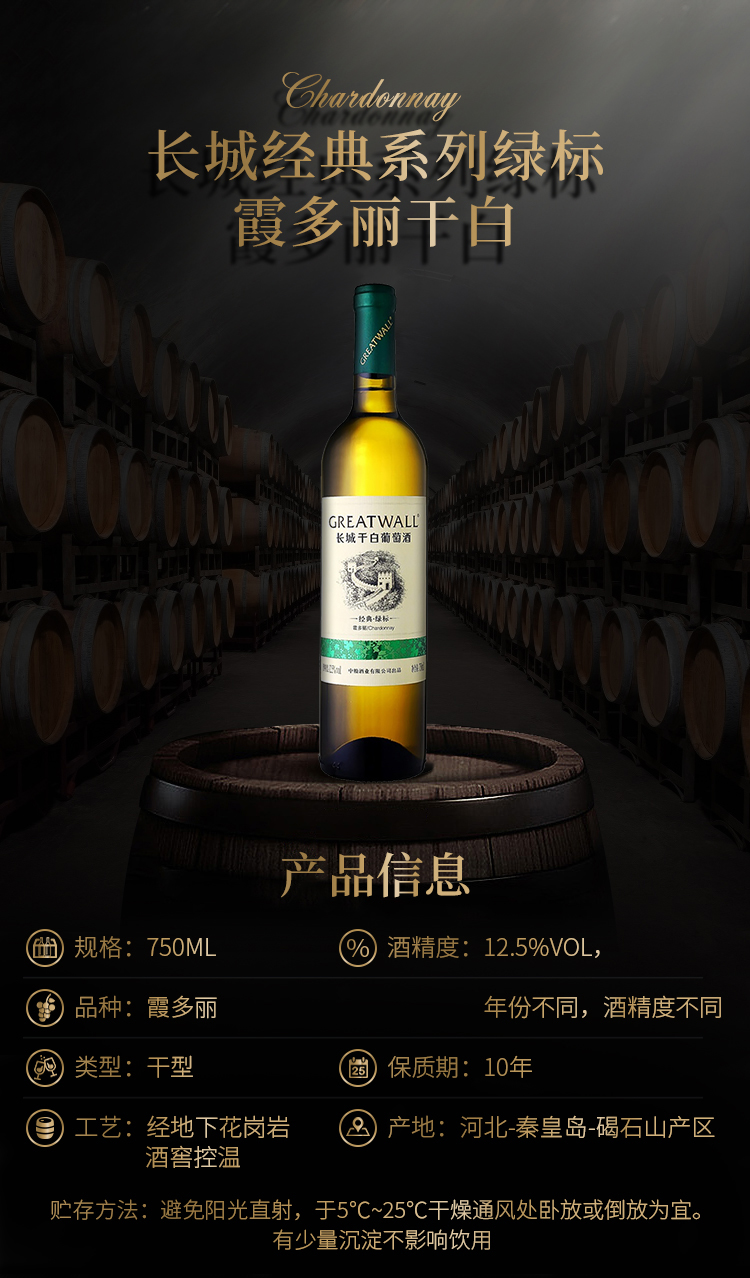 长城 经典系列 绿标霞多丽干白葡萄酒 750ml 单瓶装 中粮出品