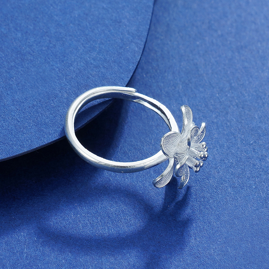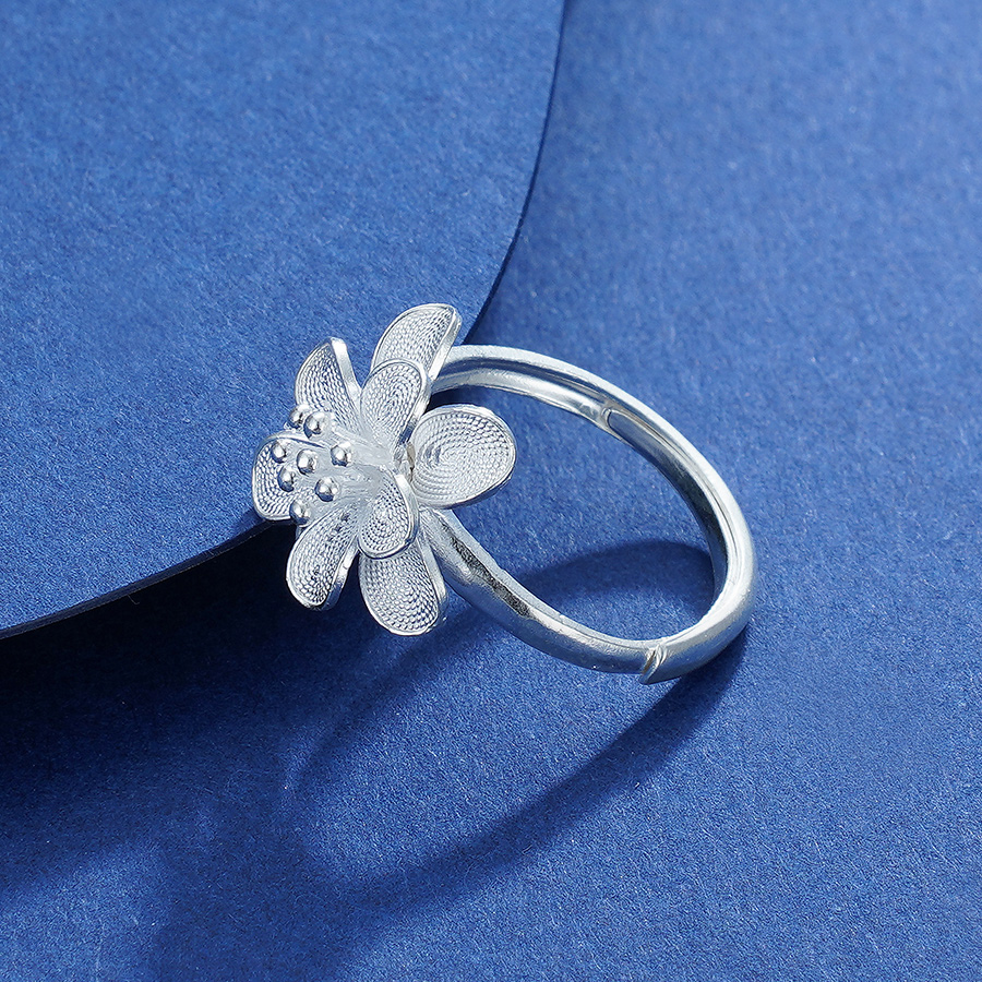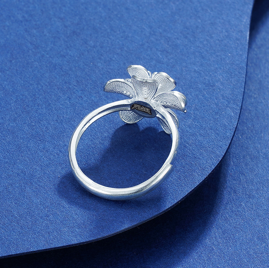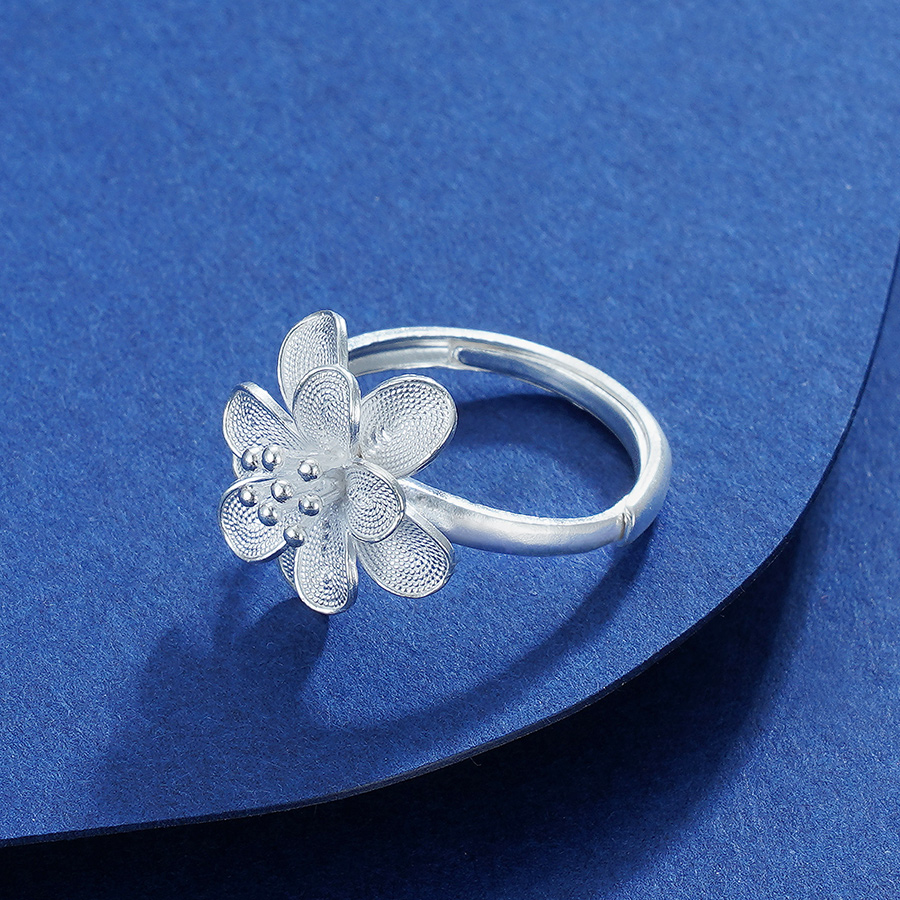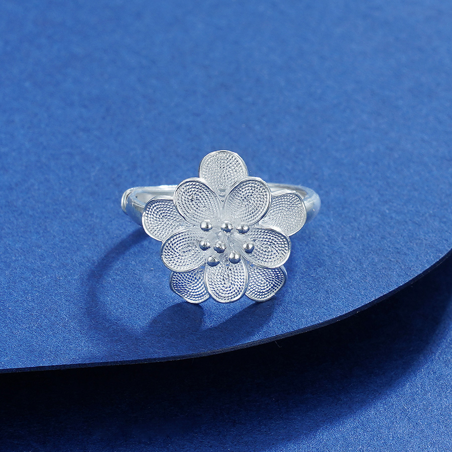 【寓意】:不加矫饰的银花丝戒指,花朵花瓣层叠绽放,氤氲着清雅纯净的氛围,寓意花开见瑞,一生清福。
