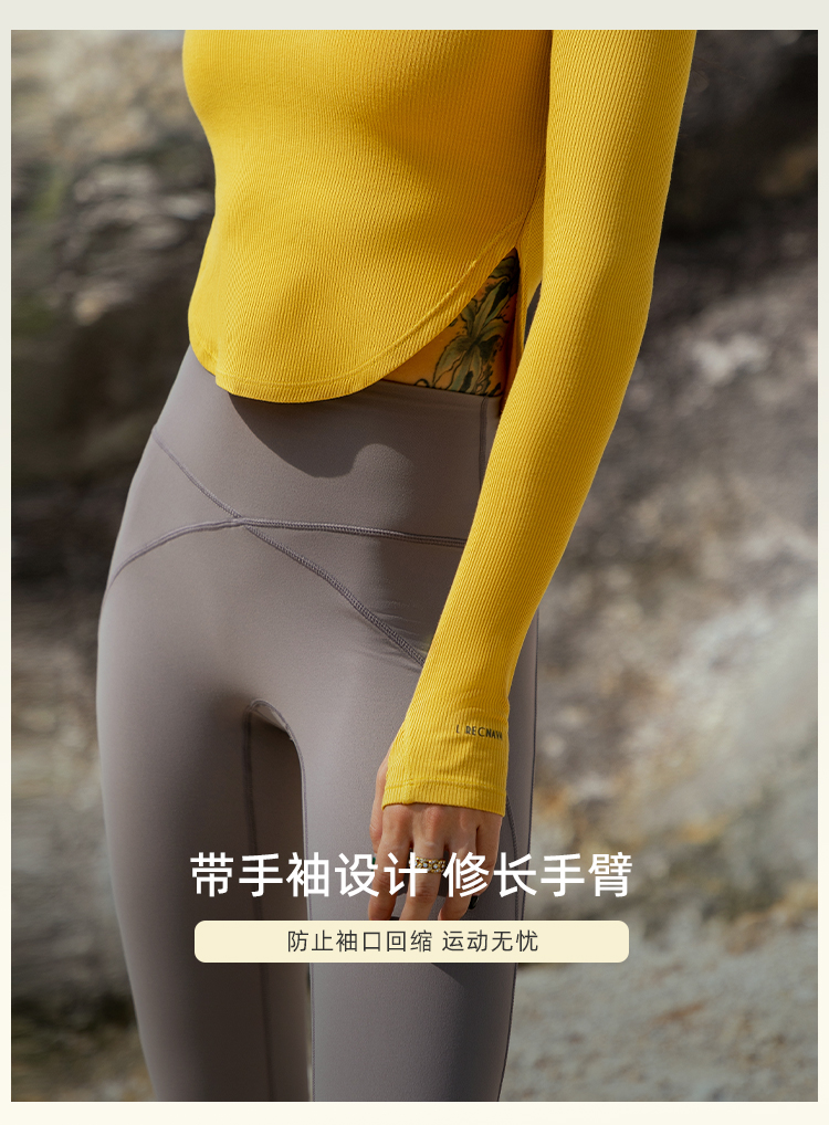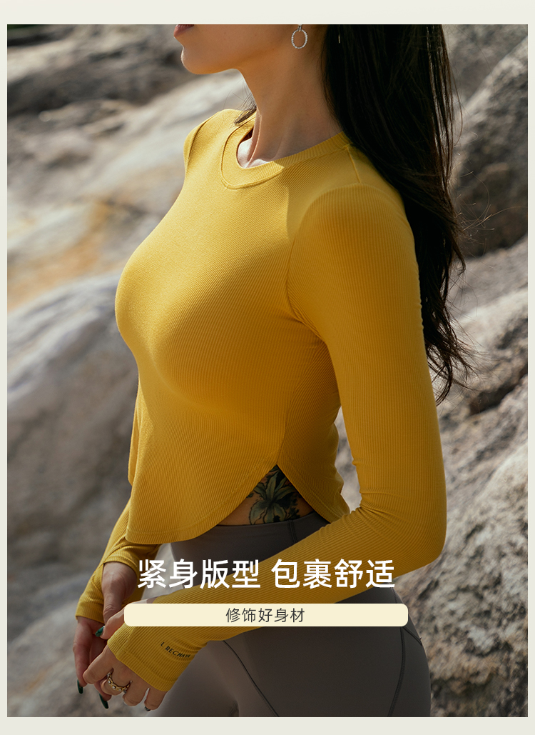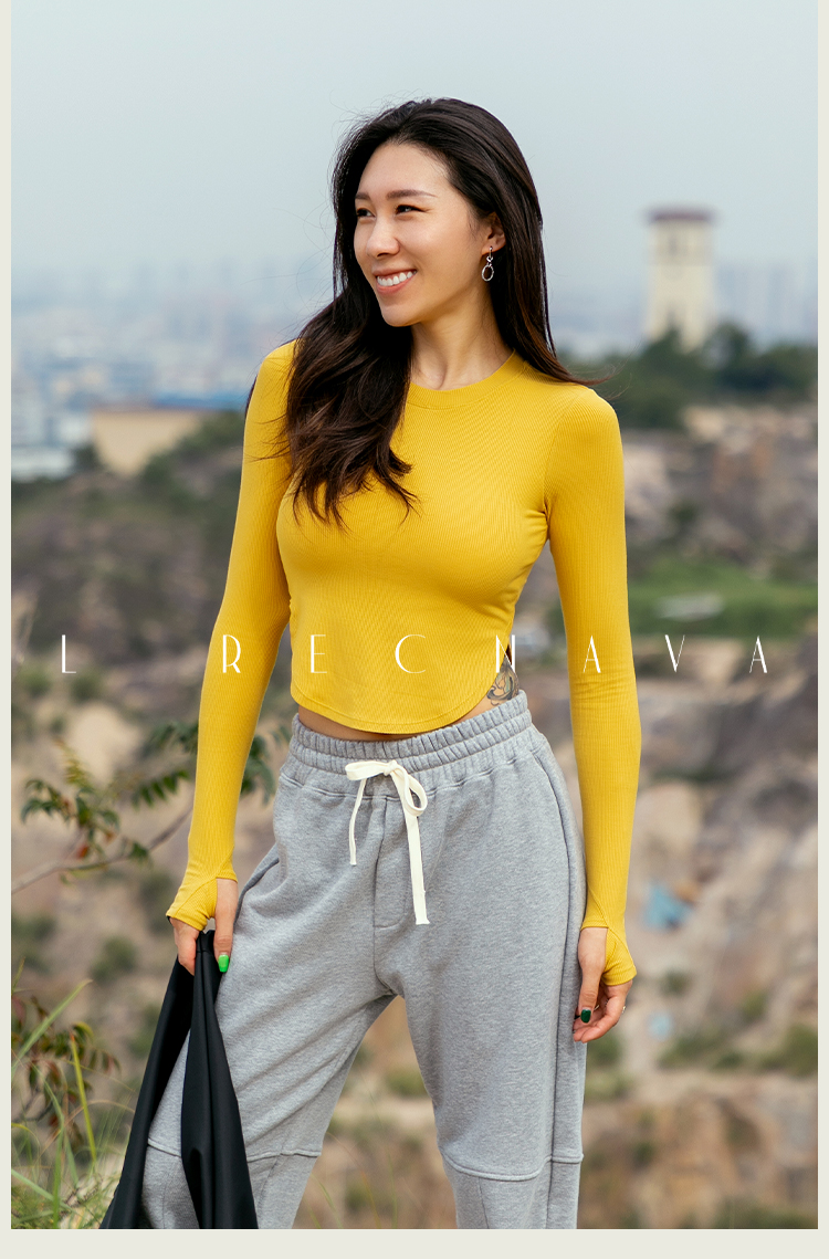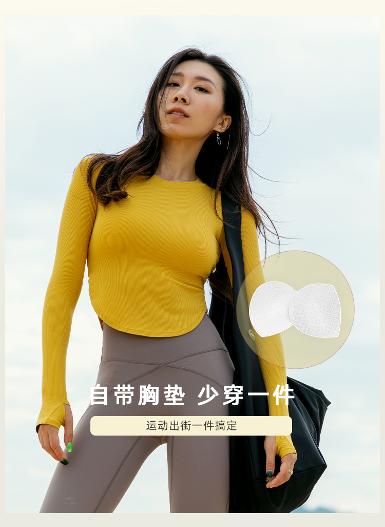 【肌理高弹针织面料】紧身圆弧下摆带手袖长袖上衣-带胸垫