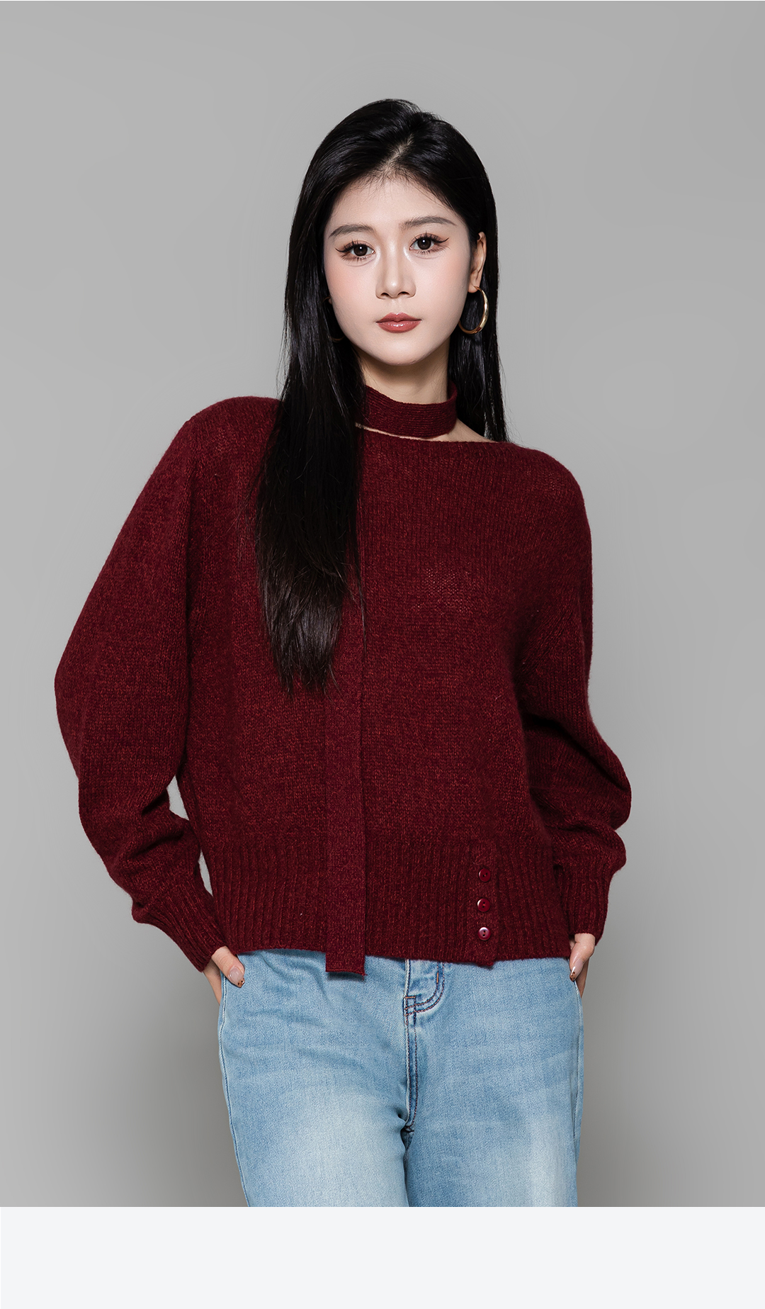 冬上新宽松慵懒版型酒红色挂脖露肩毛衣1254038